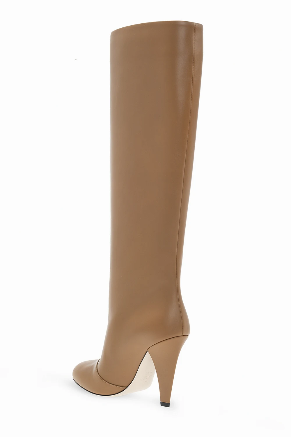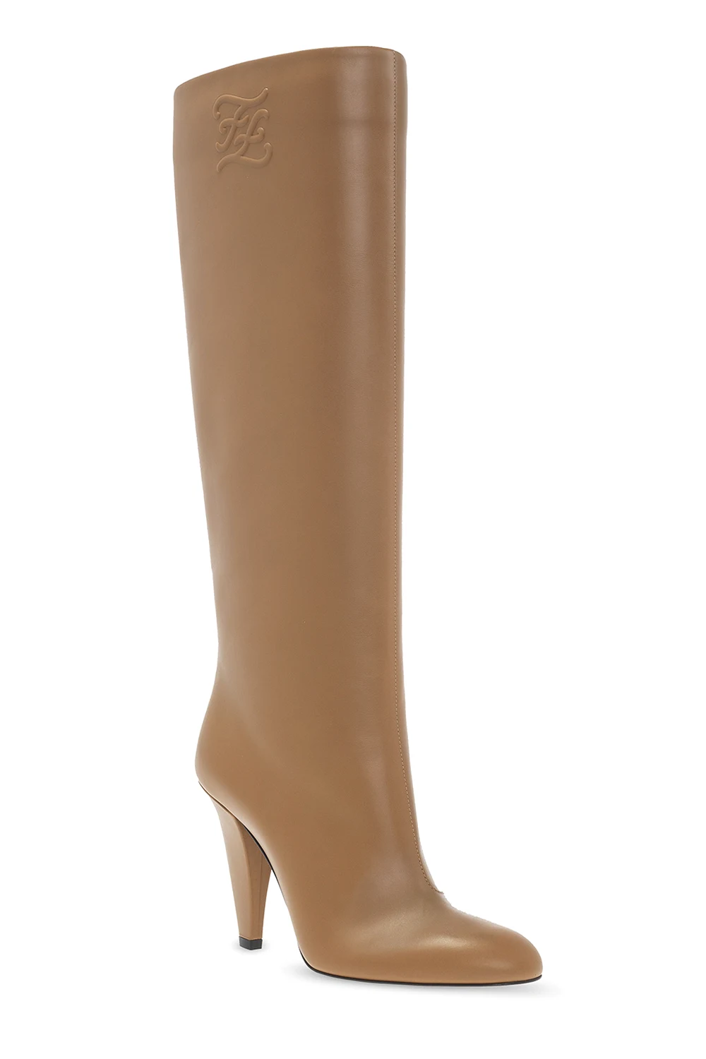 Brązowe kozaki na obcasie Fendi. Wykonane ze skóry. Migdałowy nosek. Ozdobione wytłoczonym logo. Beżowa, skórzana podeszwa.