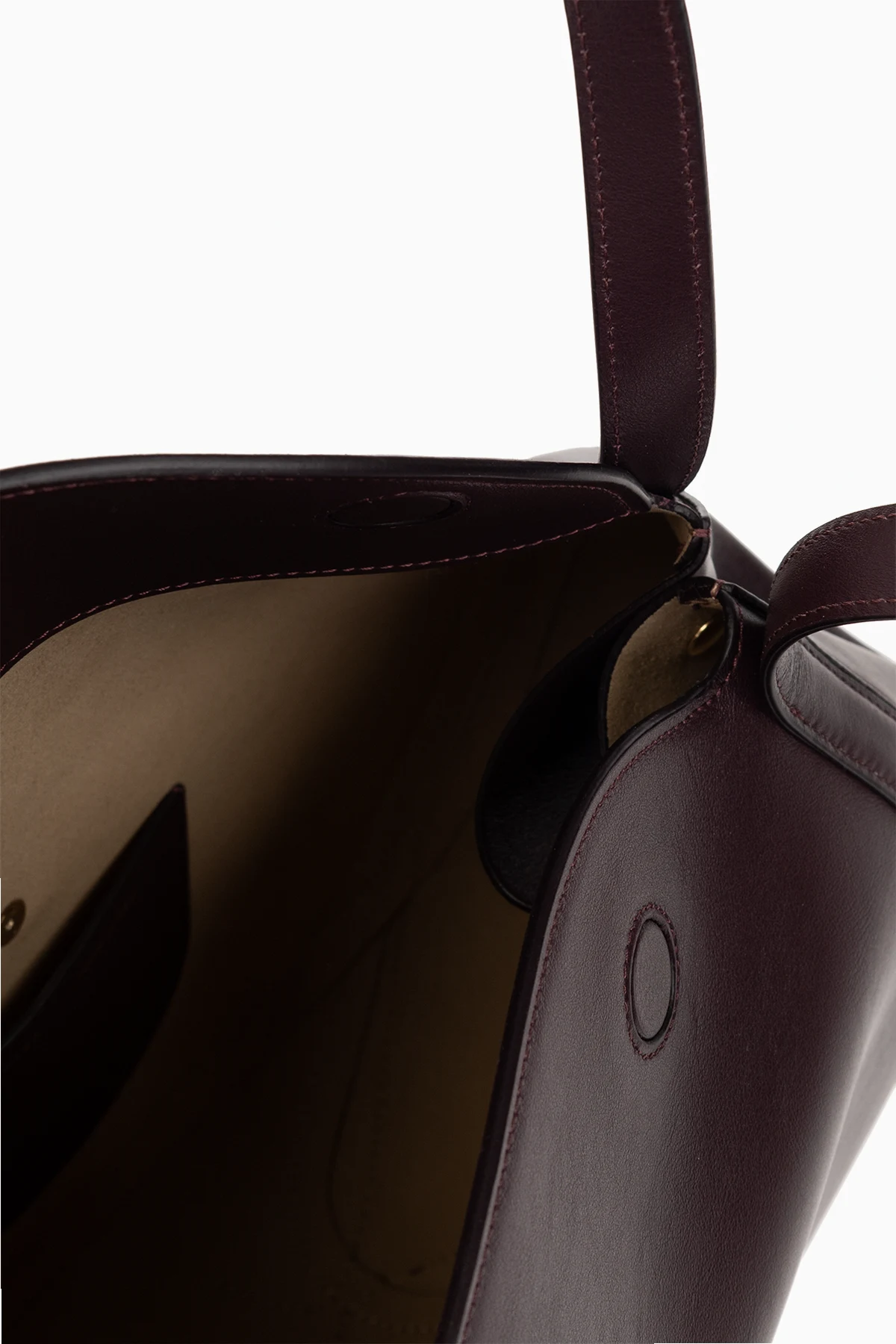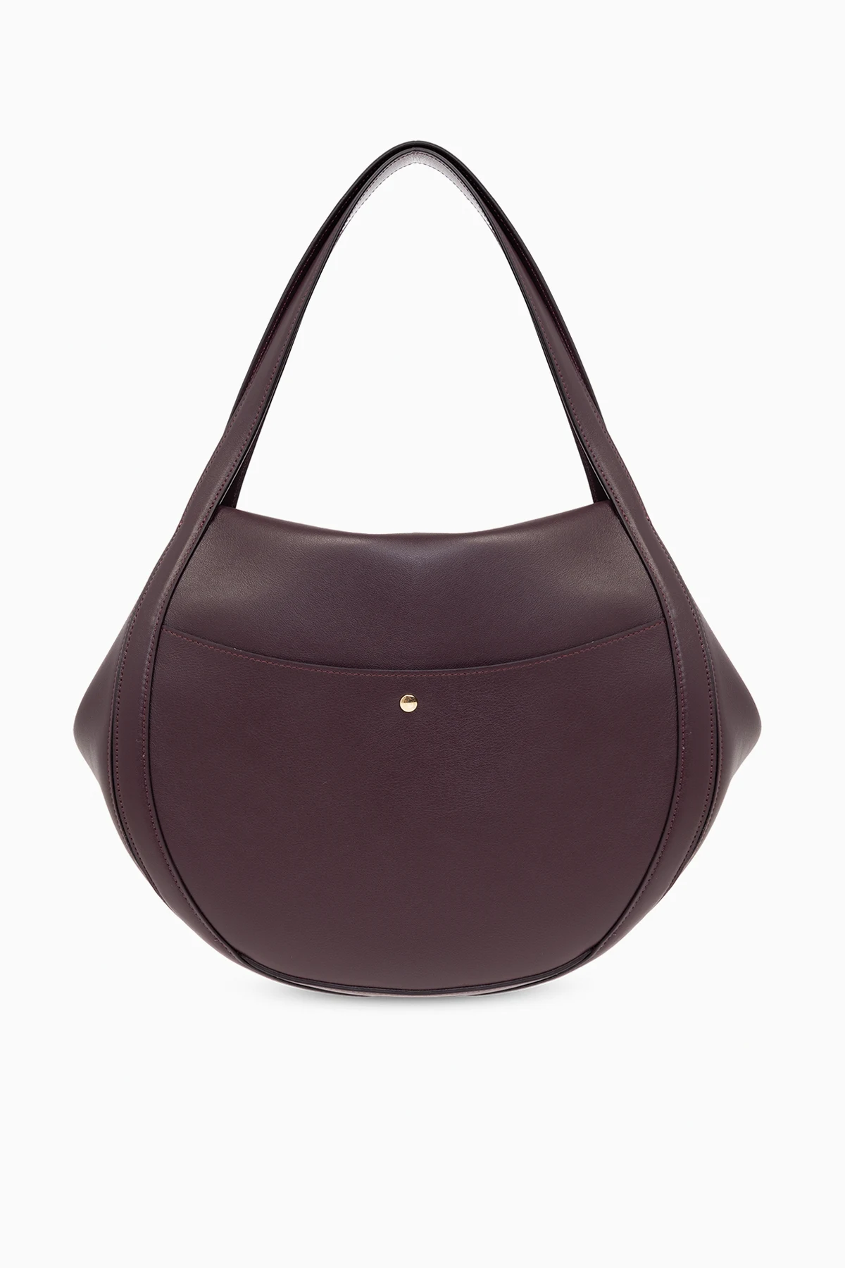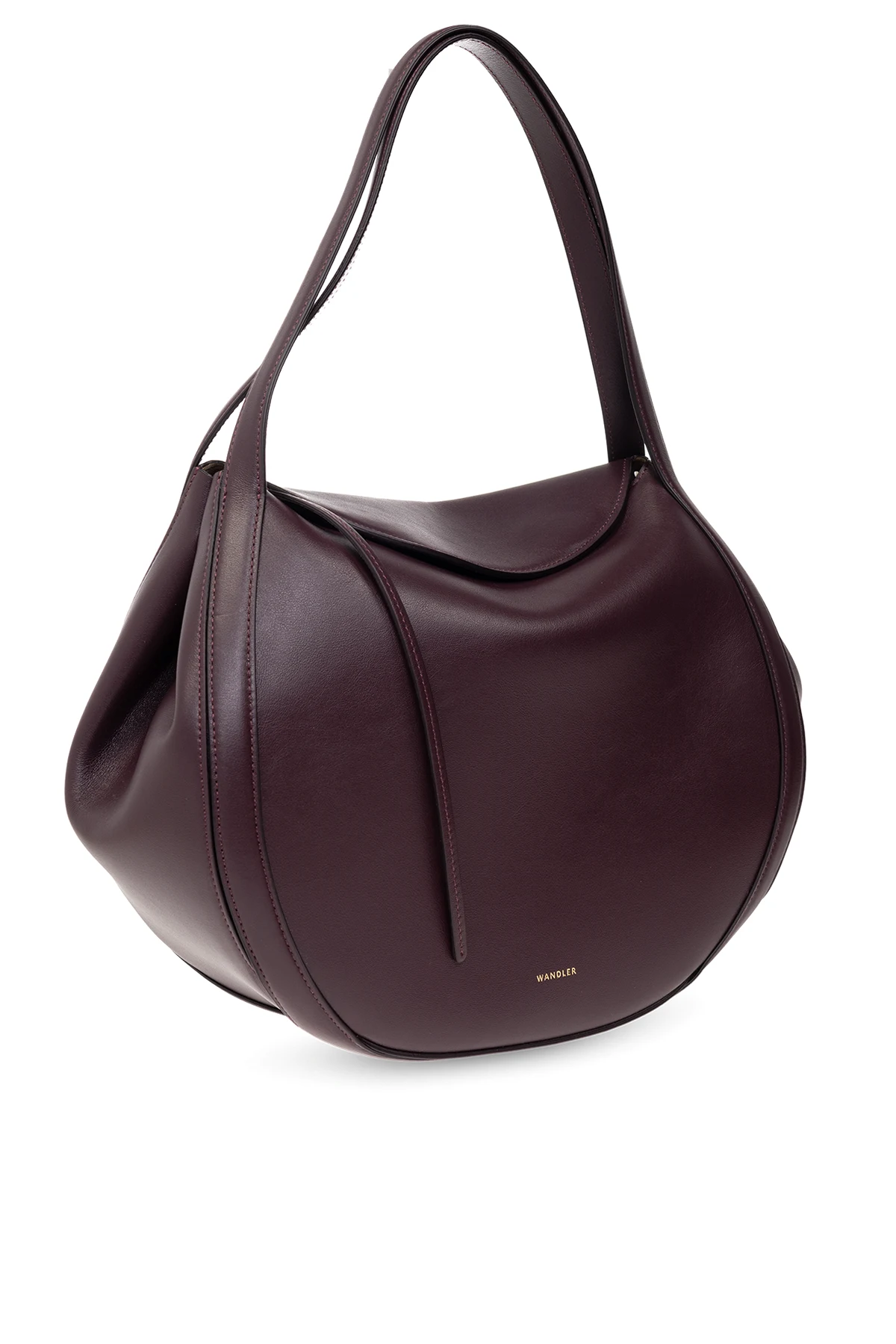 Fioletowa torba do ręki, model ‘Lin’ Wandler. Wykonana ze skóry cielęcej. Zamykana na magnetyczne zapięcie. Boki zwężane zapięciem na zatrzask. Dwie półokrągłe rączki. Z tyłu kieszeń zamykana na zatrzask. Wewnątrz komora oraz wsuwana kieszeń. Metalowe wykończenie w kolorze złotym.