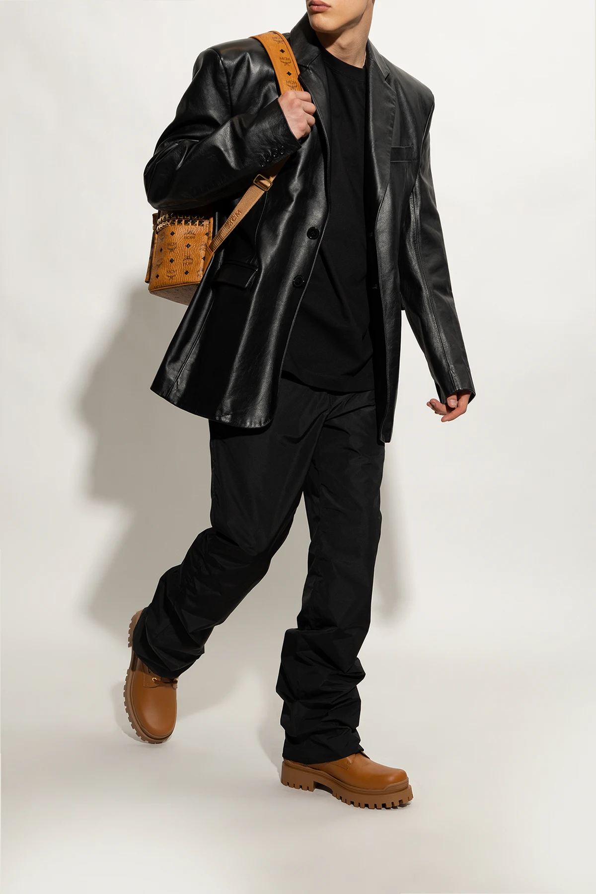 Brązowe, sznurowane buty za kostkę MCM. Wykonane ze skóry i materiału. Ozdobione wzorem z monogramem. Z tyłu pikowana wstawka. Na języku aplikacja z wygrawerowanym wzorem. Brązowa, gumowa podeszwa.