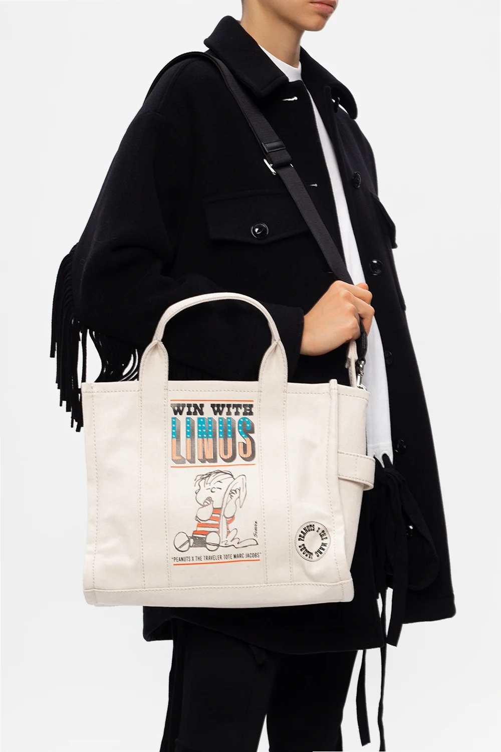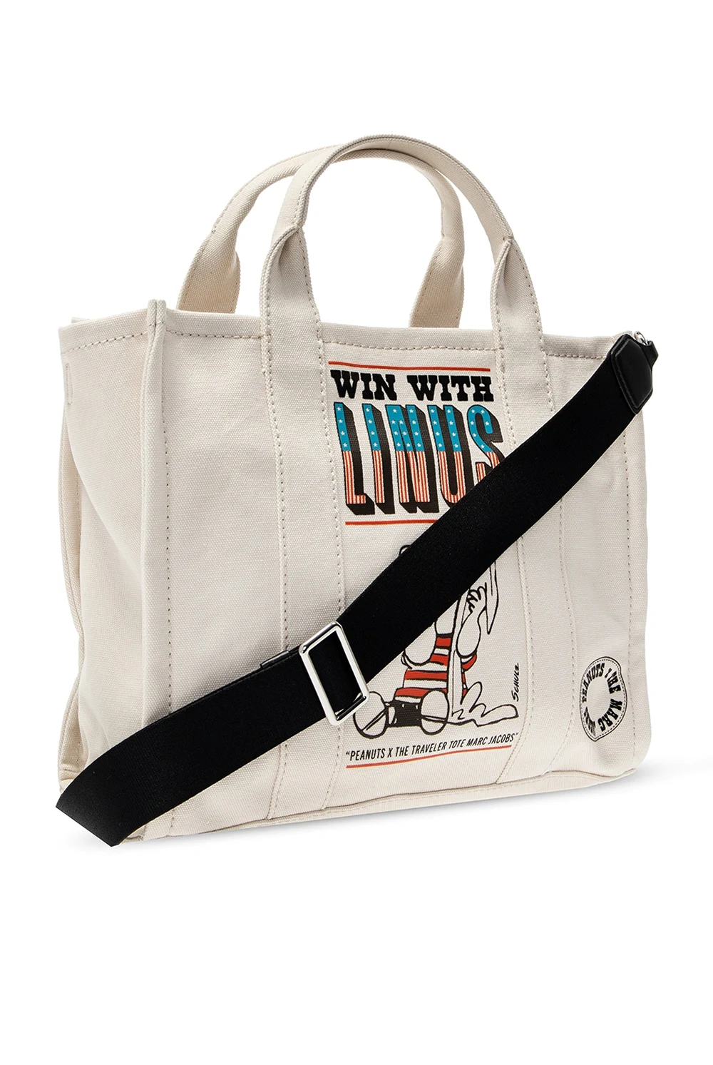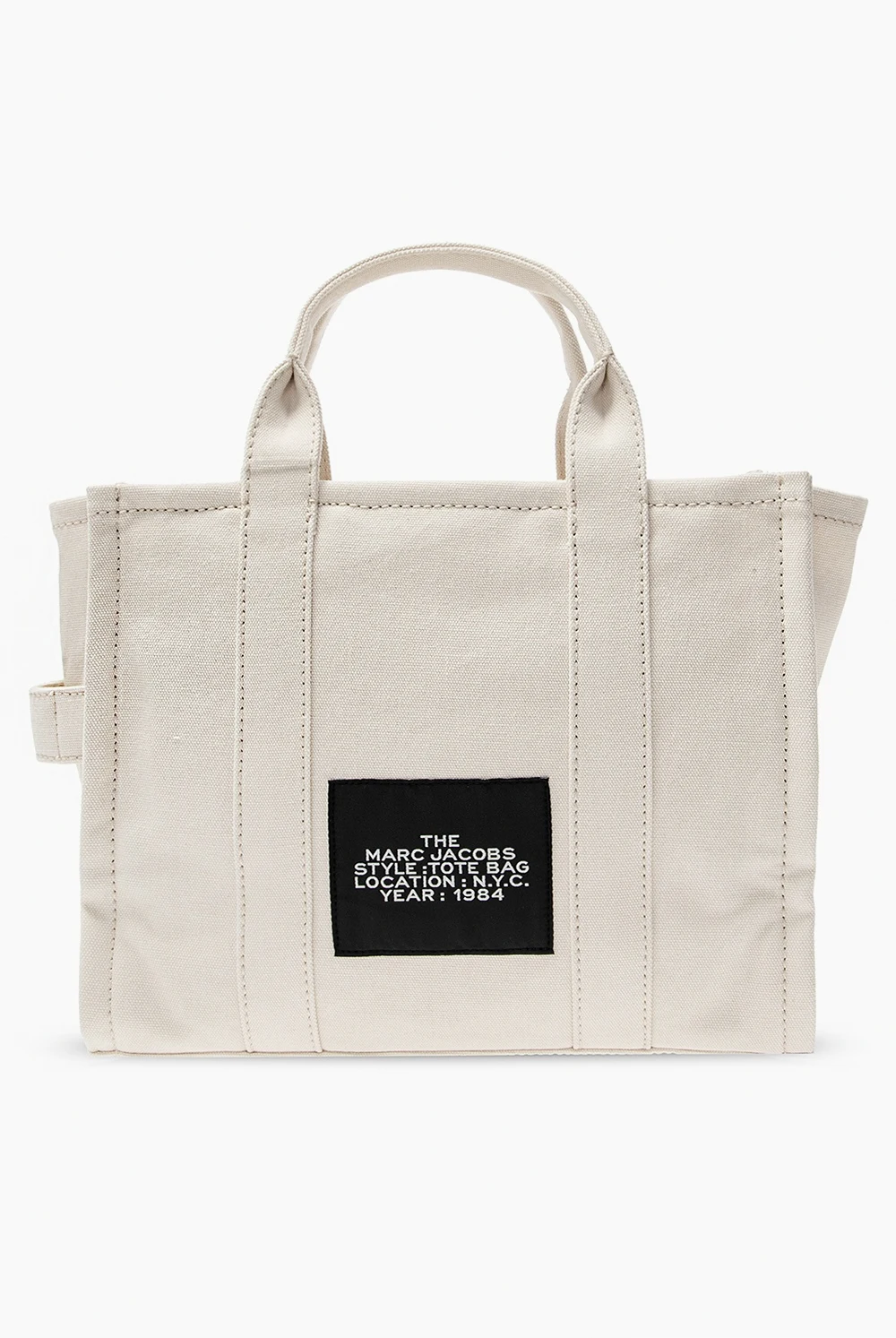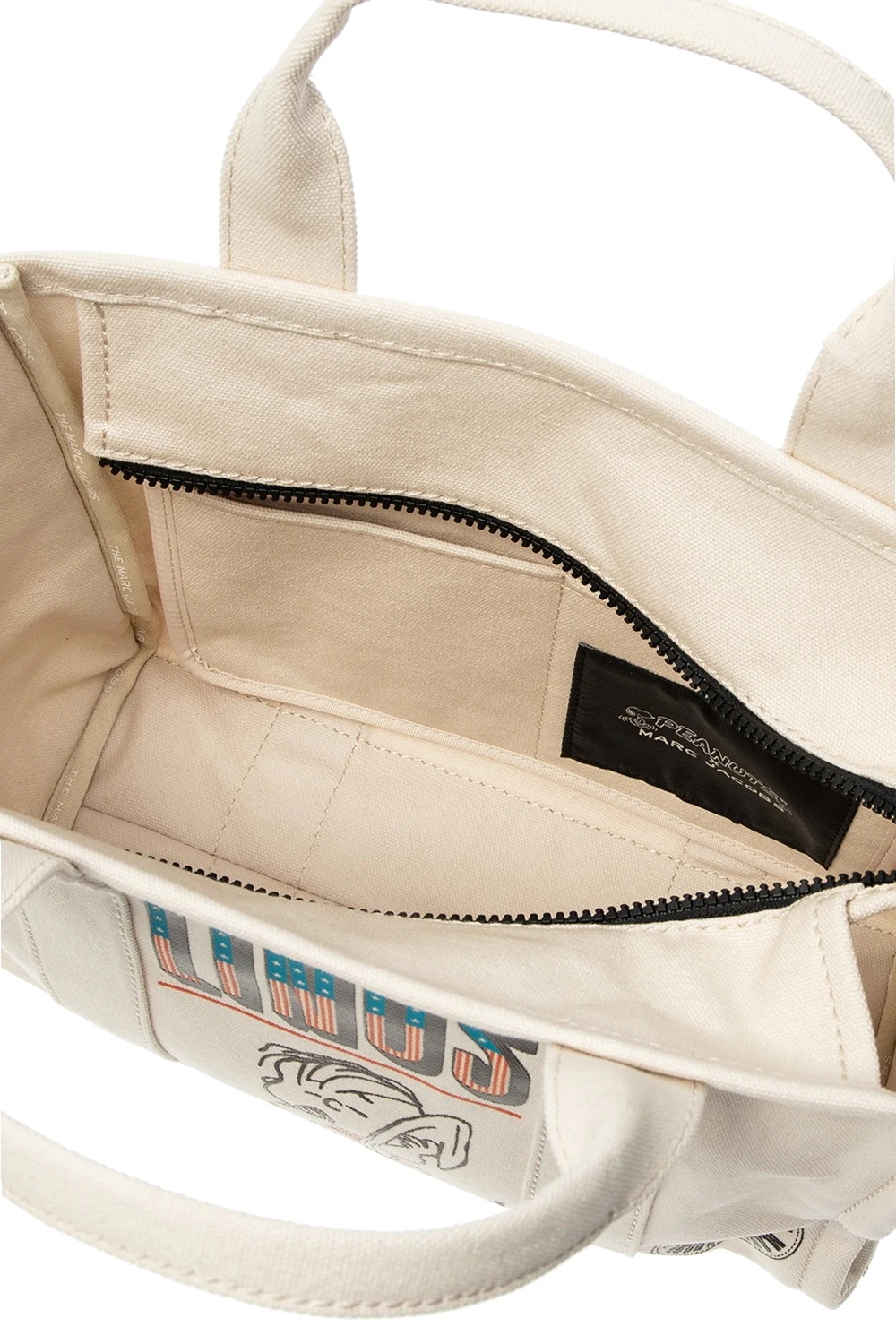 Biała, bawełniana torba typu 'shopper', model 'The Medium Tote Marc Jacobs. Zamykana na zamek. Ozdobiona nadrukowanym wzorem z logo w kolorze czarno-niebiesko-czerwonym. Trzy półokrągłe rączki. Dołączony pas na ramię z możliwością regulowania długości. Wewnątrz komora oraz trzy kieszenie: jedna zamykana na zamek i dwie wsuwane. Metalowe wykończenie w kolorze srebrnym.