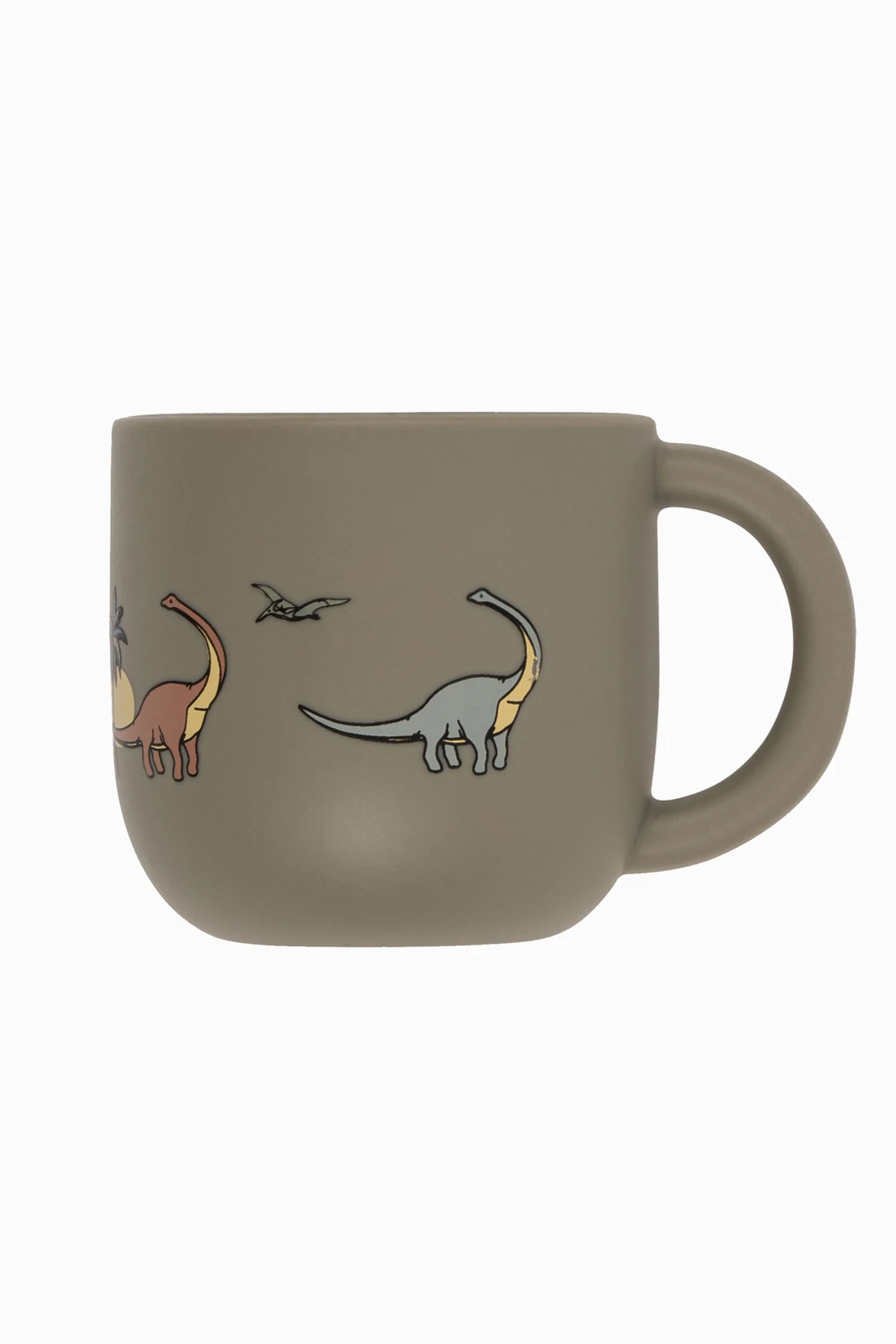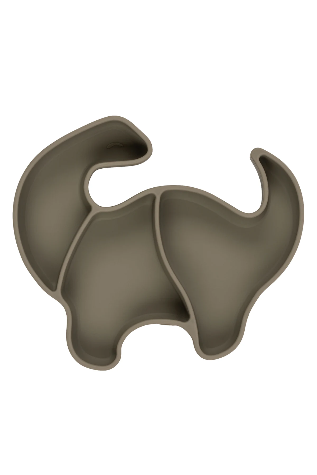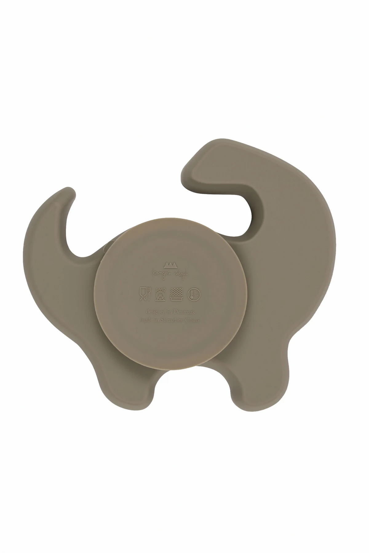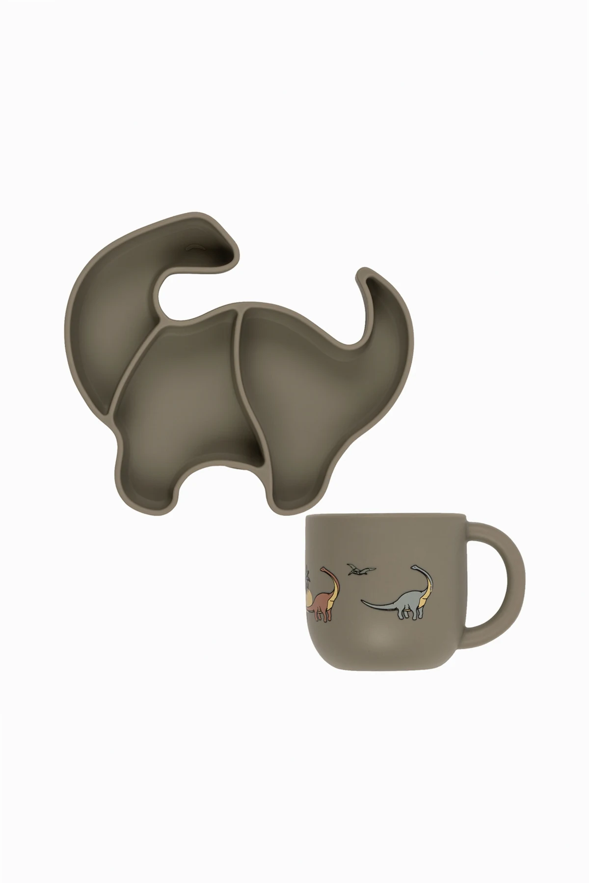 Szary zestaw: kubek i miska w kształcie dinozaura Konges Slojd. Wykonana z silikonu. Na misce przyssawka do lepszej stabilizacji.