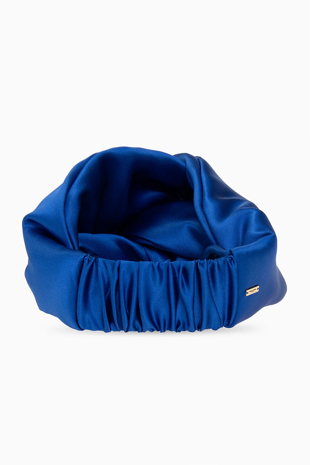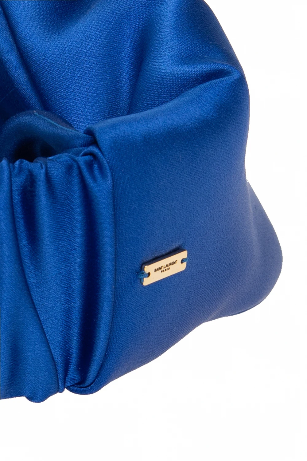 Niebieska, jedwabna opaska na głowę Saint Laurent. Z przodu dekoracyjny węzeł. Z tyłu aplikacja z wygrawerowanym logo i wszyta guma. Wypełnienie z poliestru.