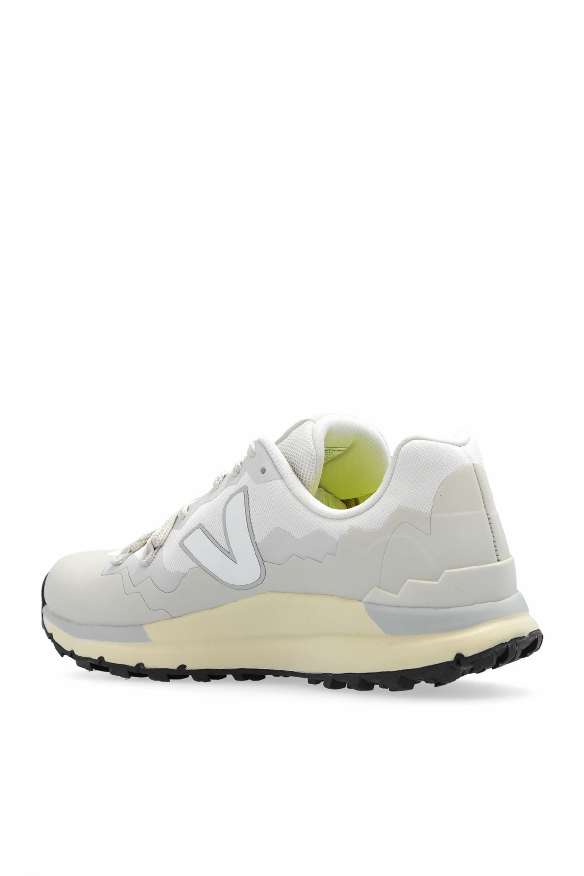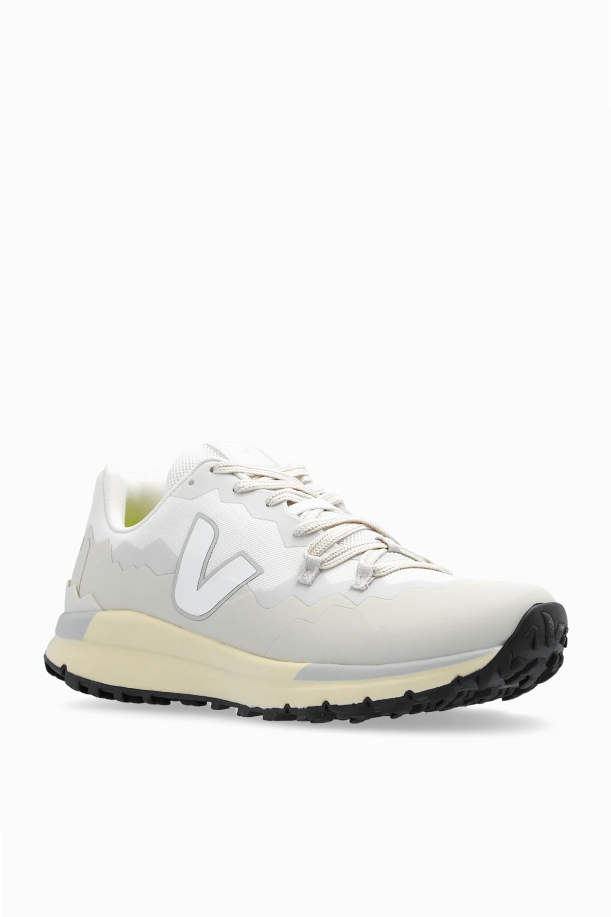 Biało-kremowo-szare, sznurowane buty sportowe, model ‘Fitz Roy Trek-Shell’ Veja. Cholewka wykonana z Trek-Shell*. Ozdobione panelami z TPU i aplikacją w kształcie litery ‘V’. Wkładka i podeszwa środkowa wykonane z pianki EVA na bazie biologicznej- z trzciny cukrowej, materiału z recyklingu i gumy amazońskiej. Czarna, gumowa podeszwa z mieszanki gumy amazońskiej, krzemionki mineralnej i kauczuku. Wyprodukowane w Brazylii.