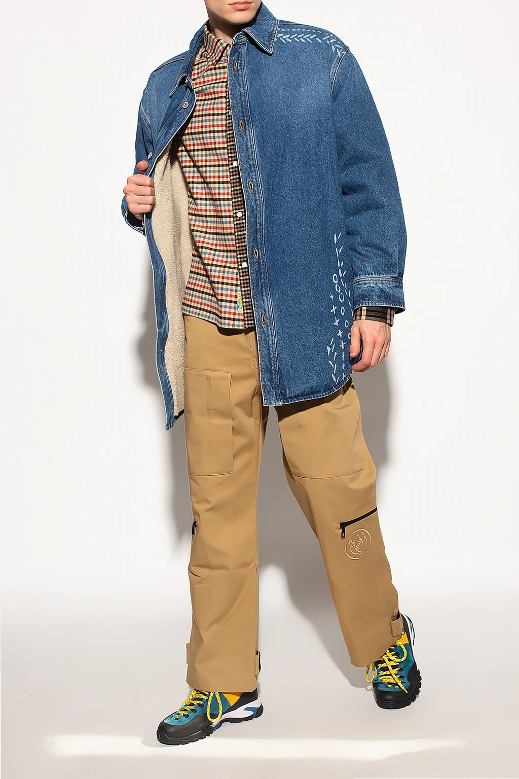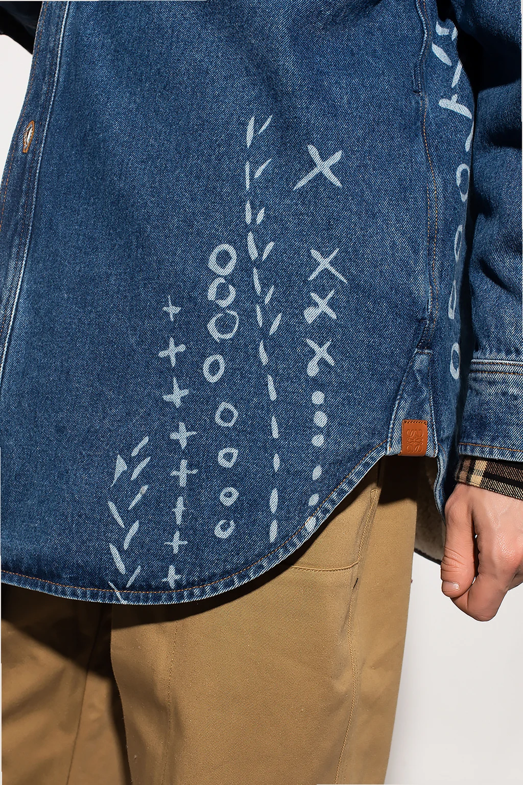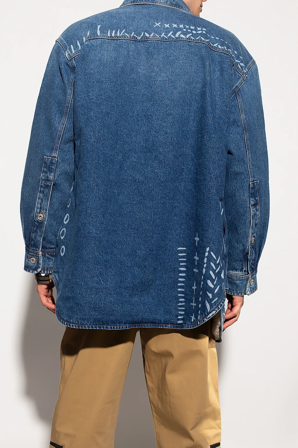 Niebieska kurtka jeansowa Loewe. Ocieplana materiałem imitującym futro. Zapinana na guziki. Nadrukowany wzór w kolorze białym. Dwie wsuwane kieszenie.