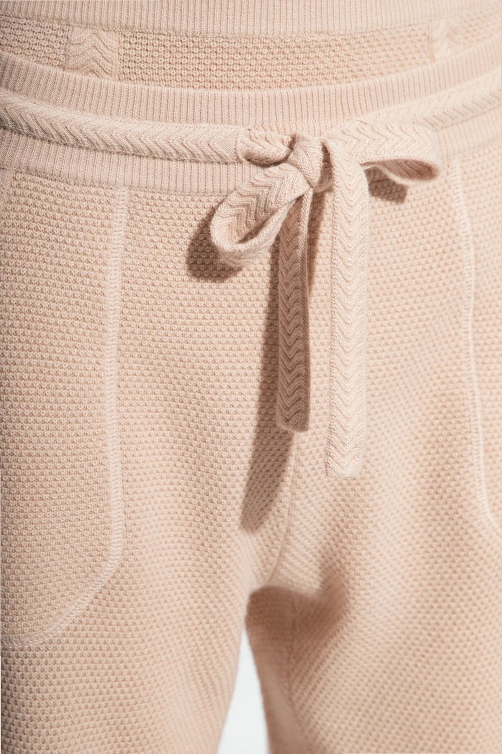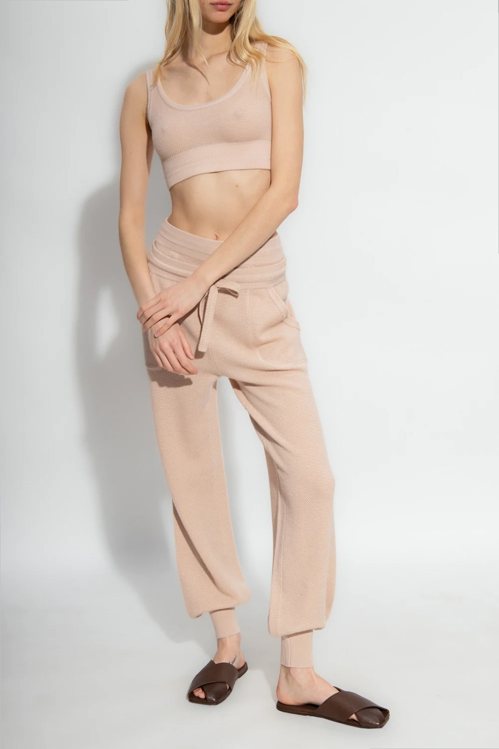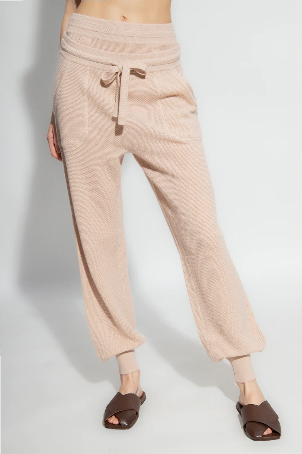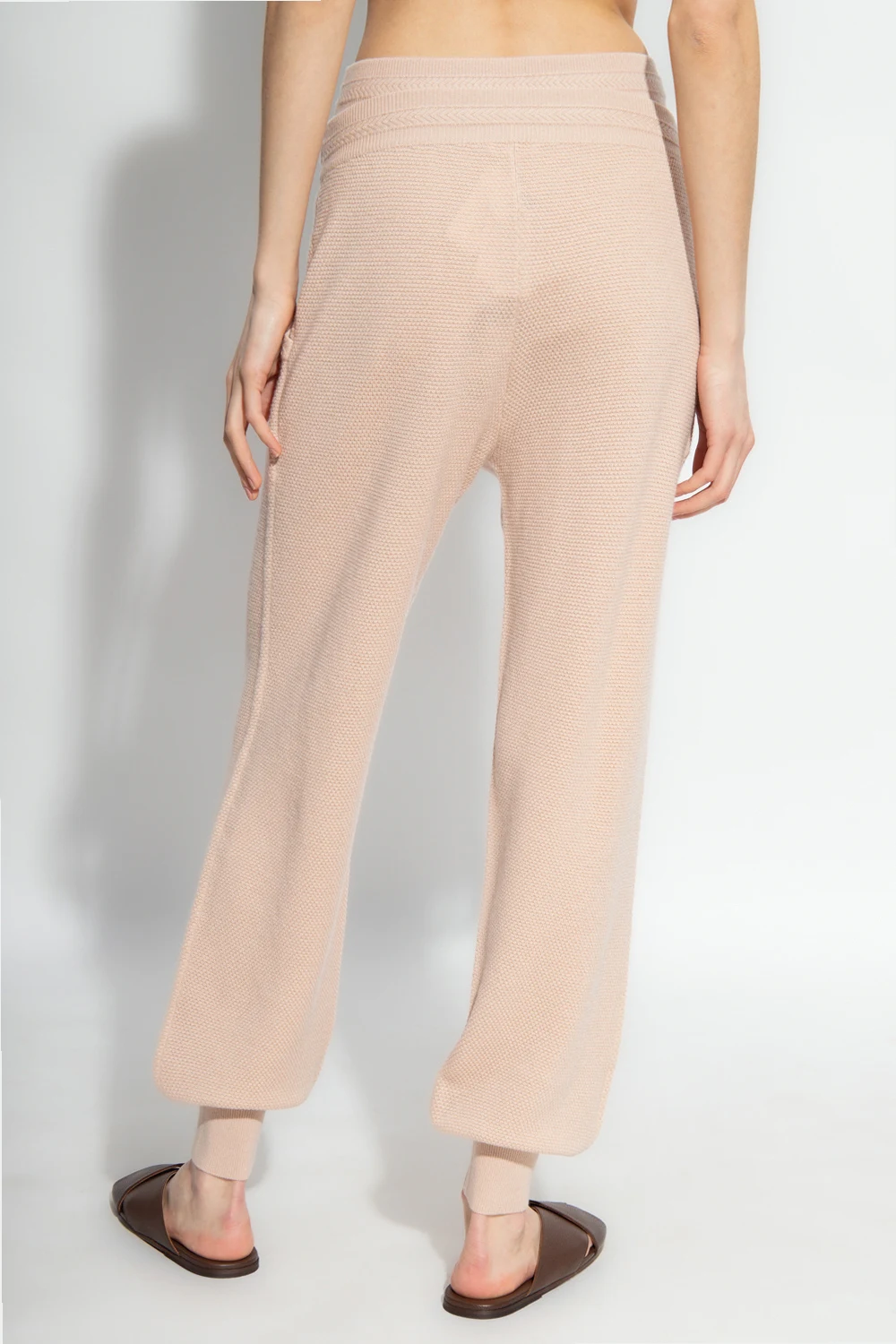 Pudroworóżowe spodnie dresowe, model ‘Minuit’ Eres. Wykonane z wełny i kaszmiru. W pasie wszyta guma ściągana trokami. Z przodu dwie wsuwane kieszenie. Długie nogawki zakończone ściągaczem.