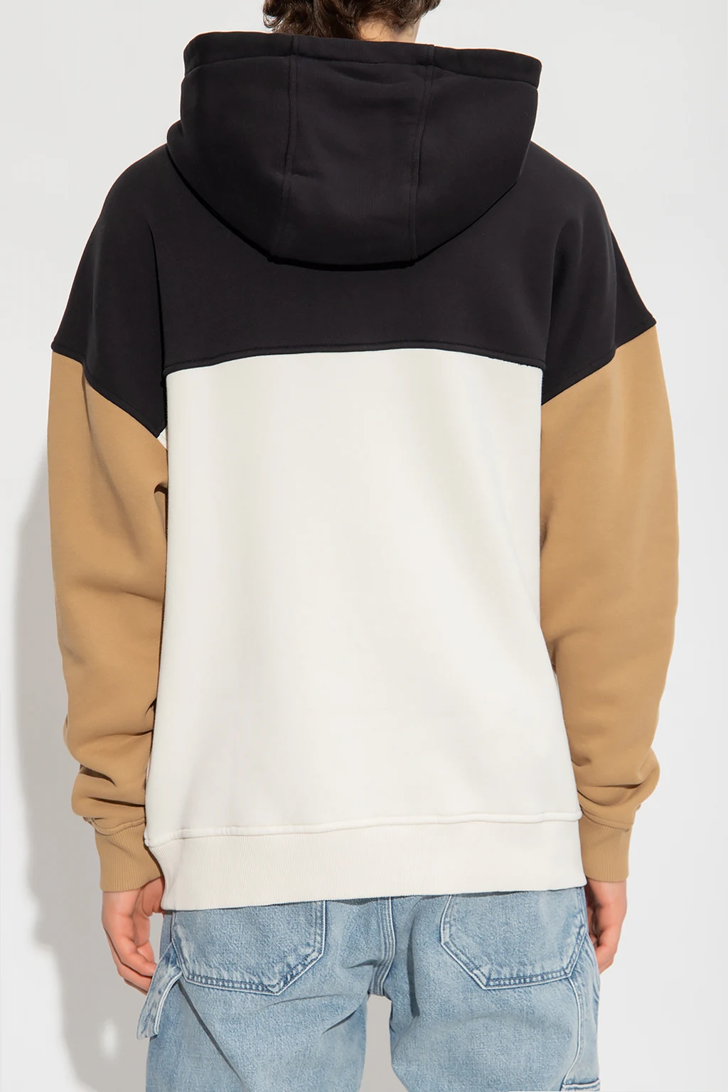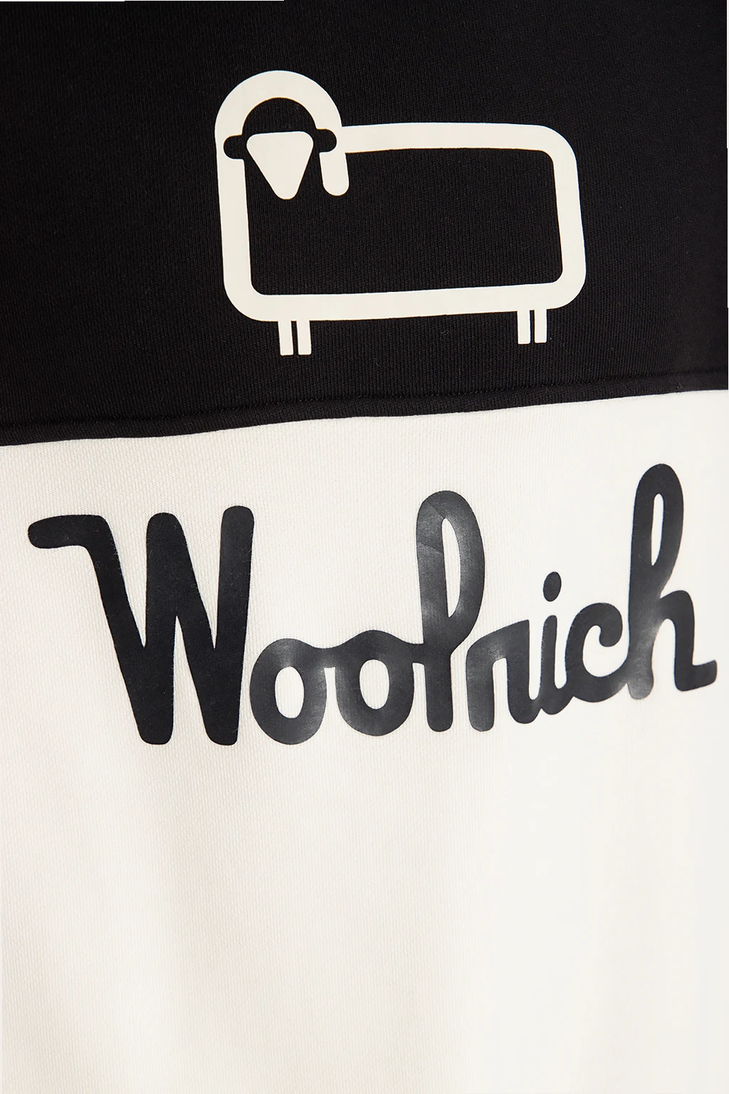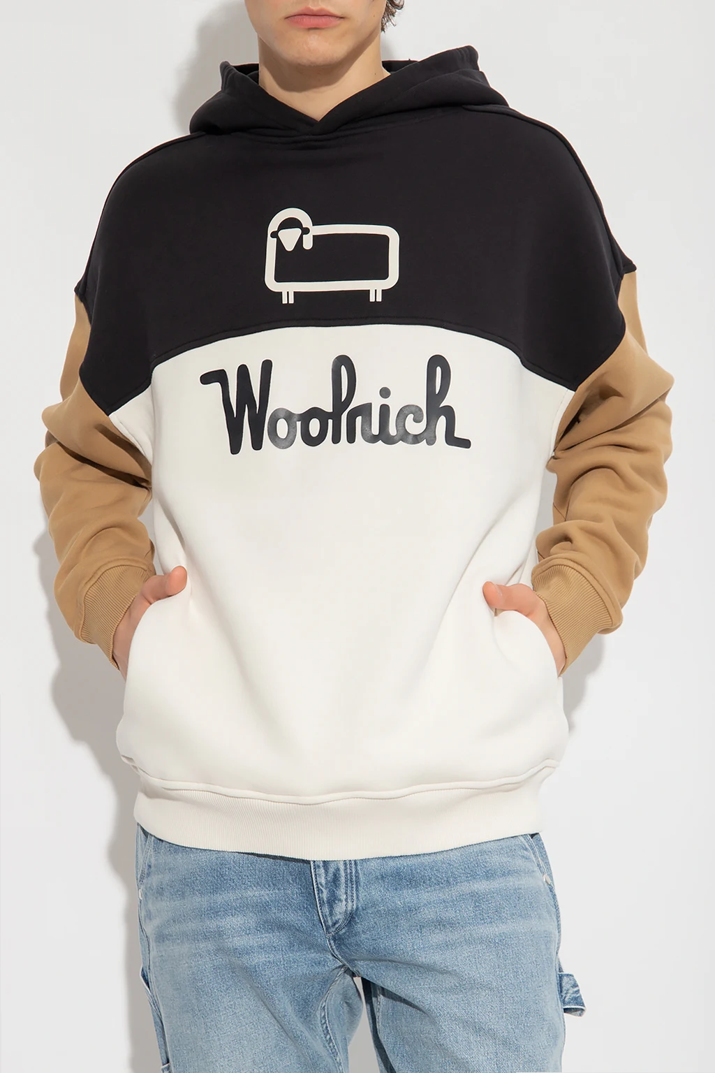 Czarno-biało-brązowa bluza z kapturem Woolrich. Wykonana z bawełny. Ozdobiona nadrukiem z logo w kolorze biało-czarnym. Dwie wsuwane kieszenie. Dół i długie rękawy wykończone ściągaczem.