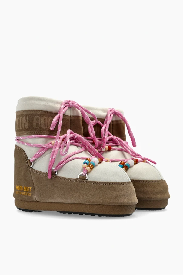 Prezentujemy wyjątkowe śniegowce ‘MB X GIR ICON LOW SUEDE BEADS’ , będące dziełem Moon Boot Kids – perfekcyjne połączenie tradycji z nowoczesnym wyrafinowaniem. Kunsztownie zaprojektowana cholewka łączy miękki, brązowy zamsz z klasyczną tkaniną w odcieniu ecru, tworząc harmonijną całość.