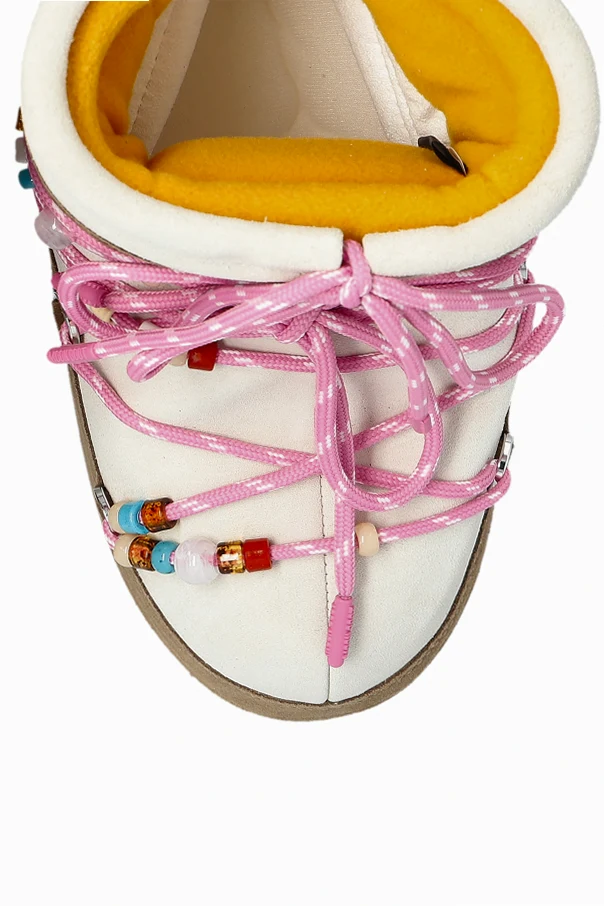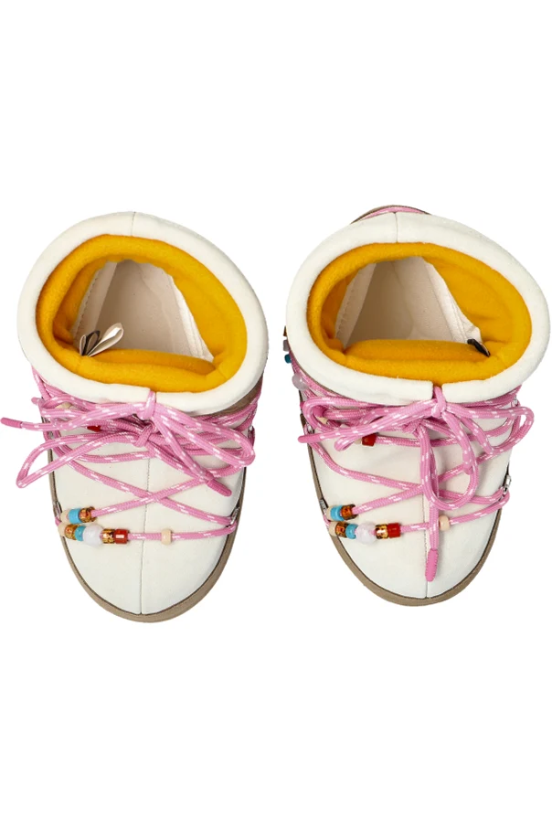 Niski, zaokrąglony fason wzmacnia komfort kroku, a gruba, płaska podeszwa oraz starannie ocieplane wnętrze gwarantują ochronę przed zimnem i wilgocią. Model wyróżniają różowe sznurowadła z białymi przeszyciami oraz bogato zdobione, wielobarwne koraliki, nadające całości śmiałego charakteru.