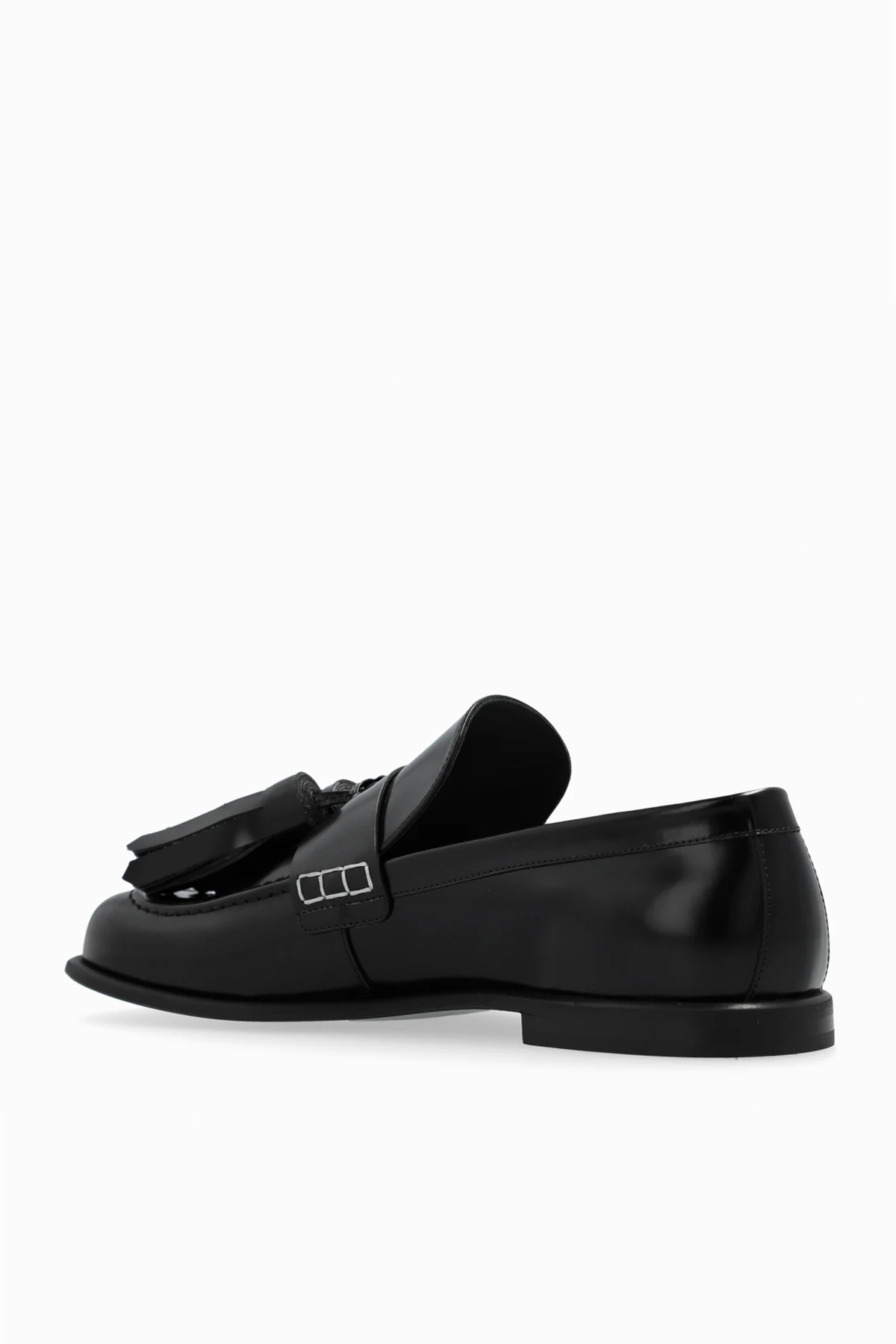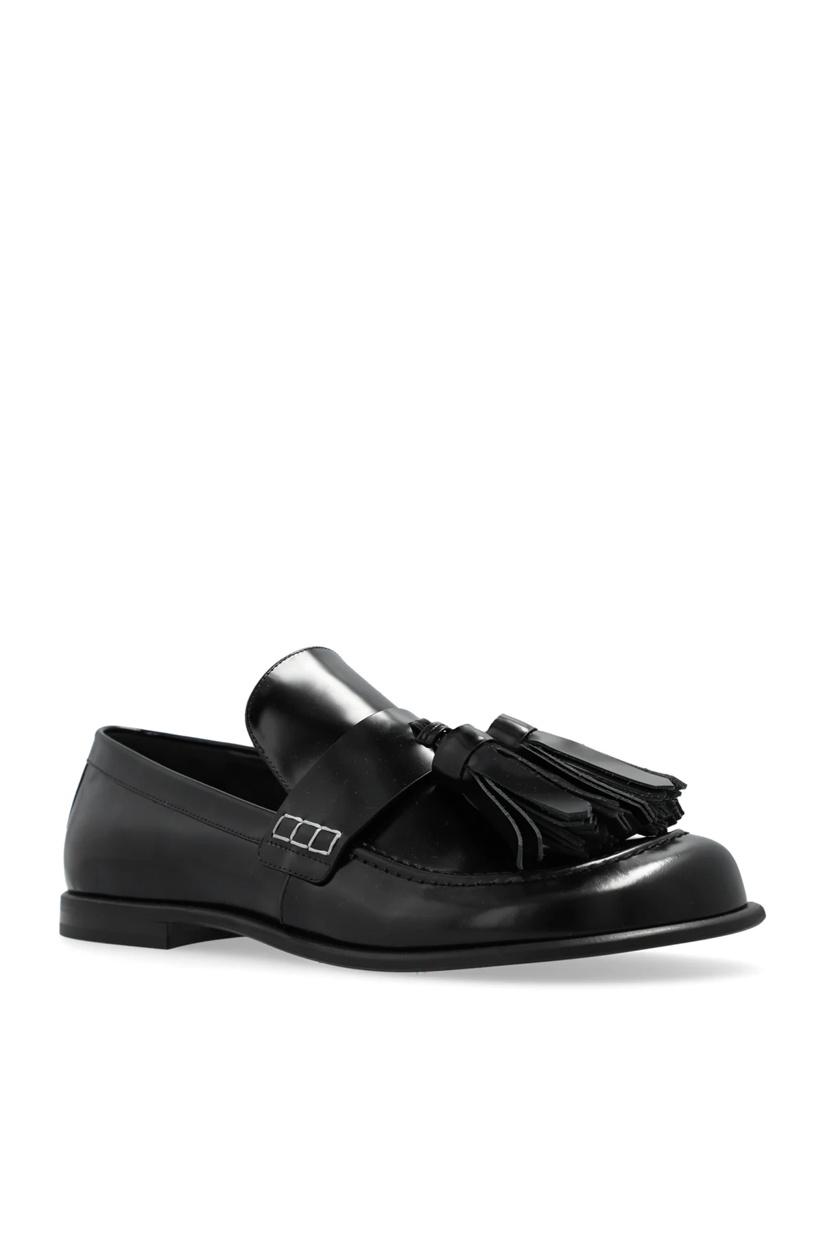 Skórzane buty typu ‘loafers’ od cenionego projektanta JW Anderson , to kwintesencja elegancji połączona z nieprzemijającym stylem. Wykonane z lśniącej, wysokiej jakości skóry, te czarne loafersy urzekają swoją prostotą oraz subtelnością detali, takich jak frędzle i pas z klamrą, które dodają im niepowtarzalnego charakteru.