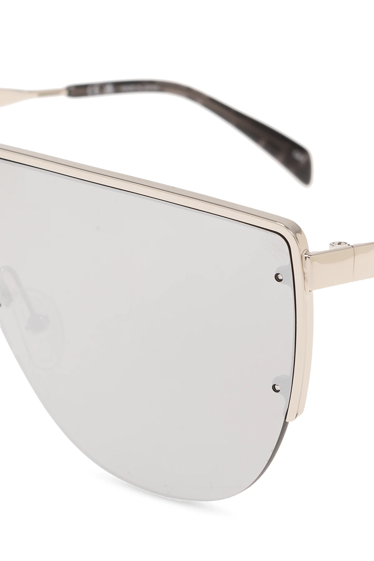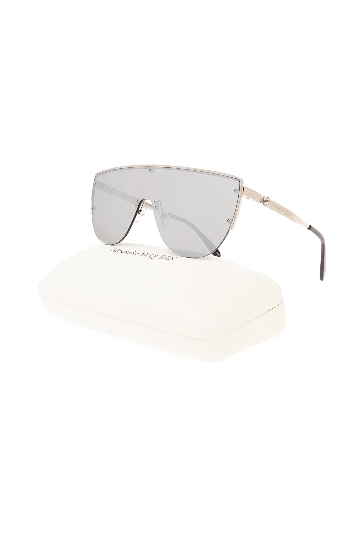 Okulary przeciwsłoneczne Alexander McQueen. Zauszniki w kolorze srebrnym z charakterystycznym motywem czaszki i wygrawerowanym logo. Szare soczewki z efektem lustrzanym z ochroną przed promieniowaniem UV (kat. 3). Dołączone etui.
