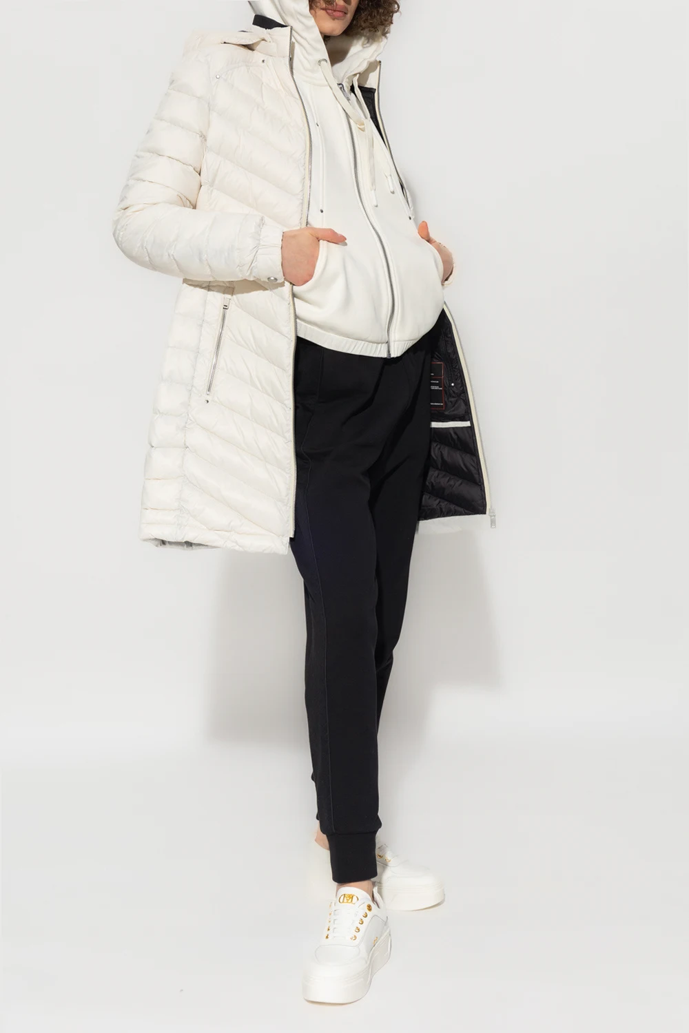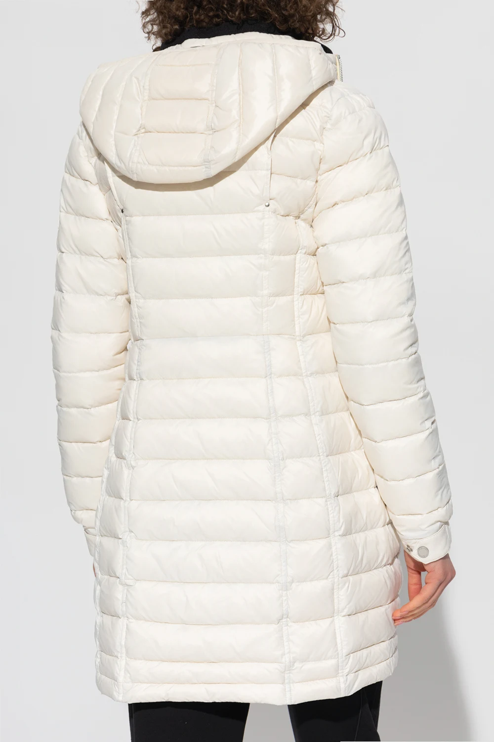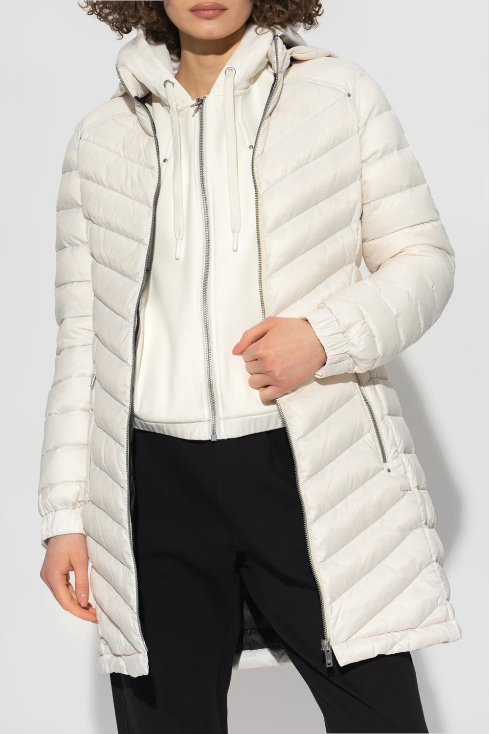 Kremowy, pikowany płaszcz puchowy Moose Knuckles. Zapinany na dwubiegunowy zamek. Odpinany kaptur. Na rękawie aplikacja z logo. Dwie kieszenie zapinane na zamek.