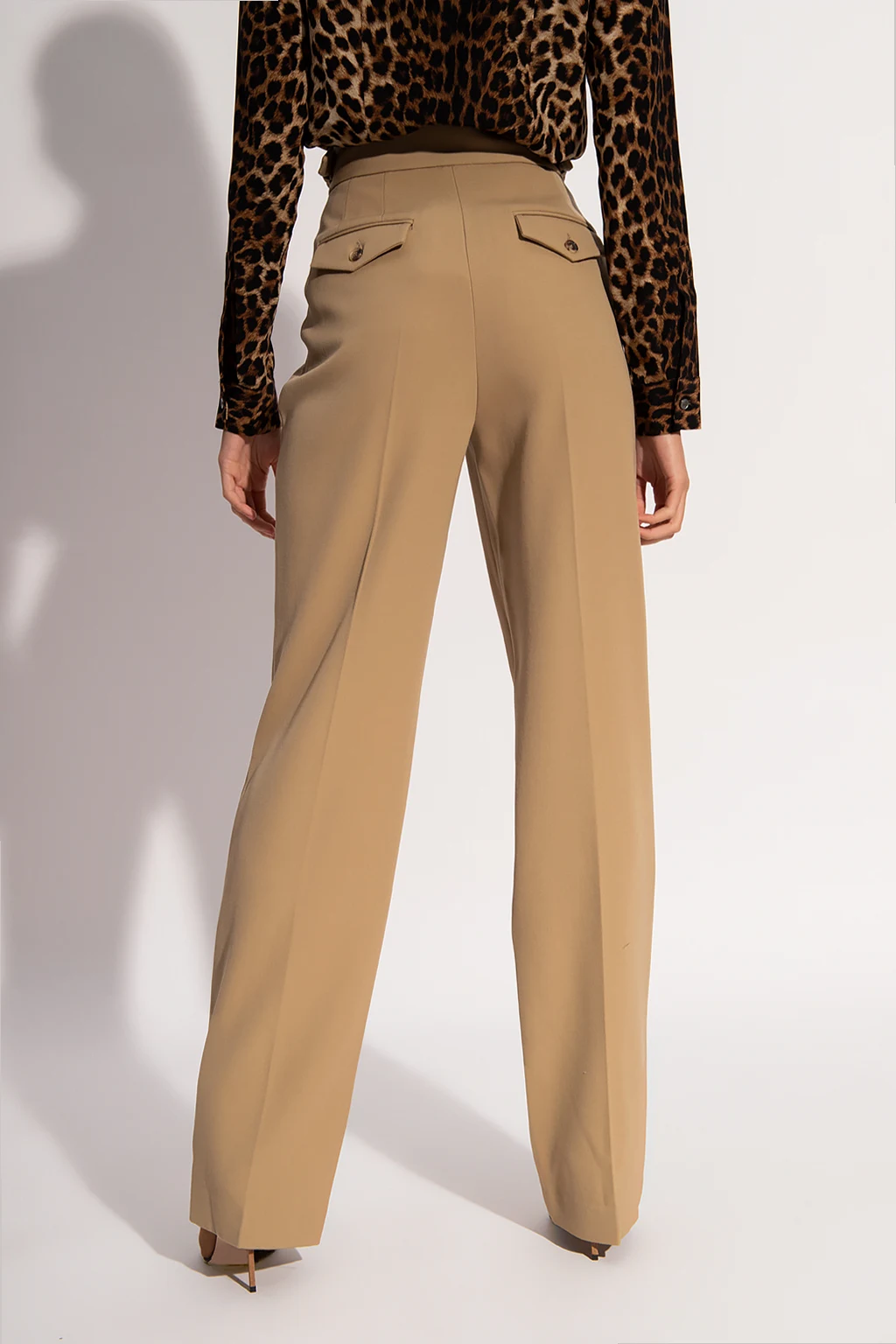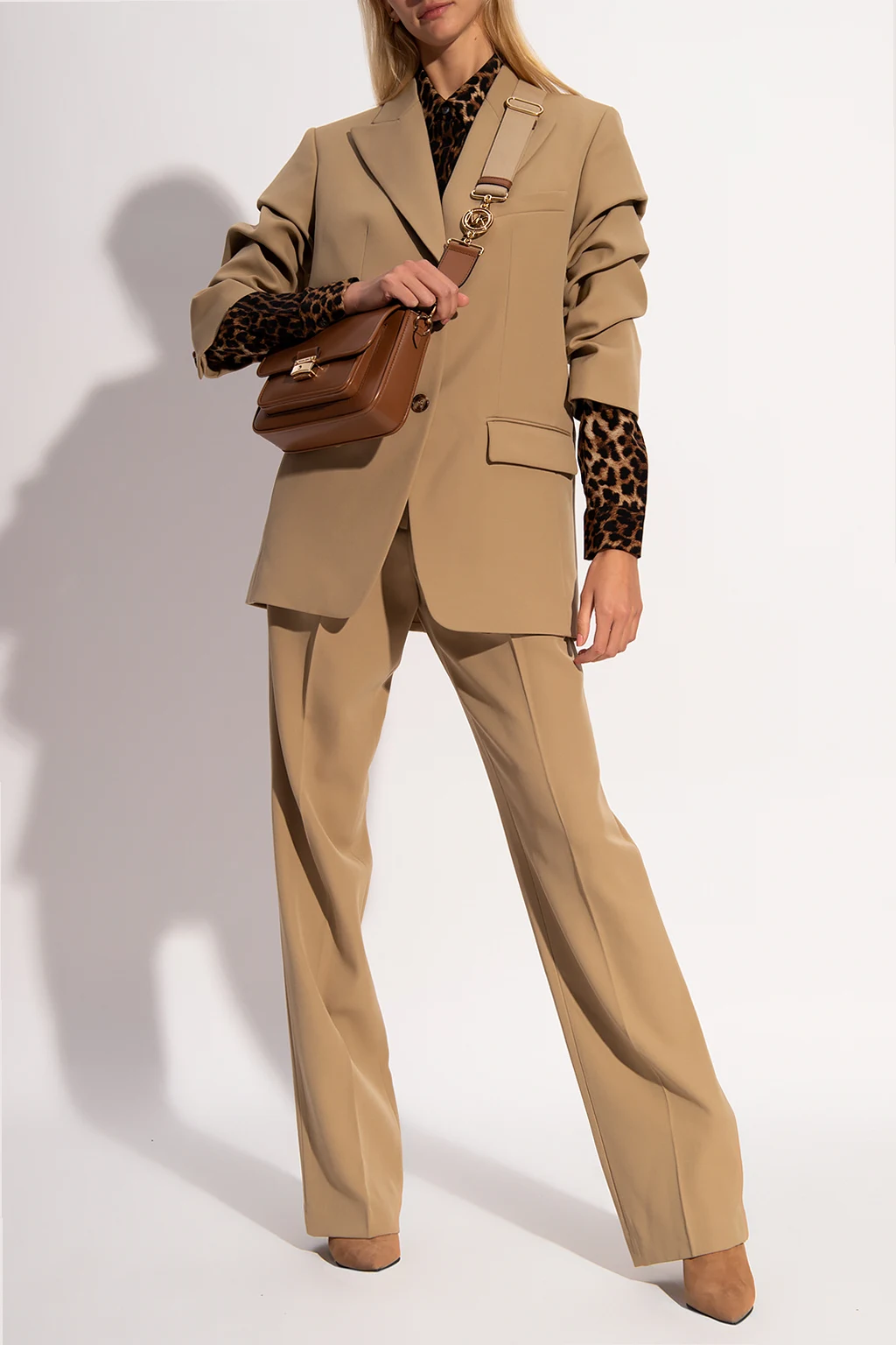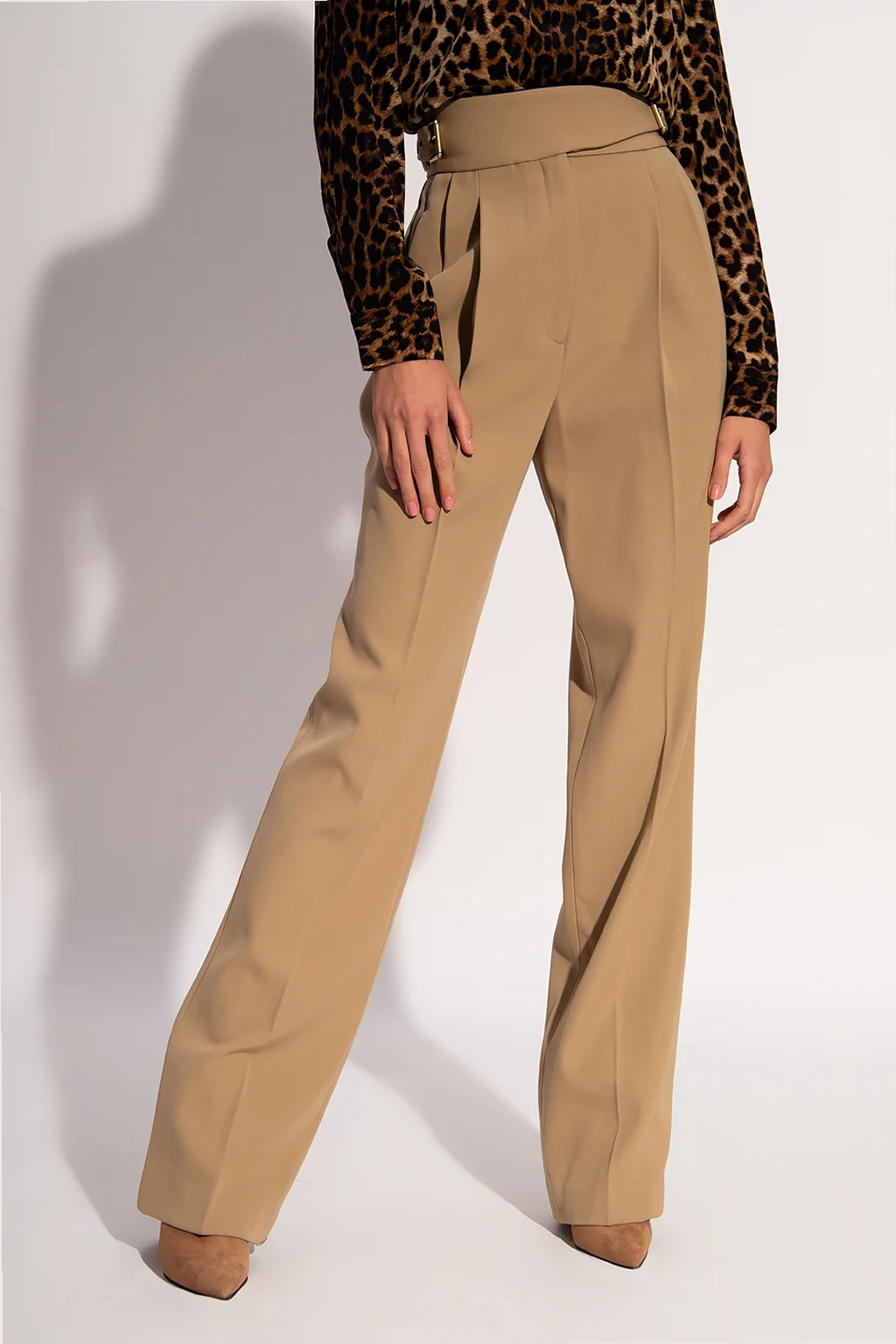 Beżowe, wełniane spodnie w kant Michael Kors. Zapinane na zamek oraz wszyty pasek z klamrą w kolorze złotym. Dekoracyjne zakładki. Cztery kieszenie: dwie wsuwane oraz dwie z patką z zapięciem na guzik. Długie nogawki, lekko zwężane ku dołowi.