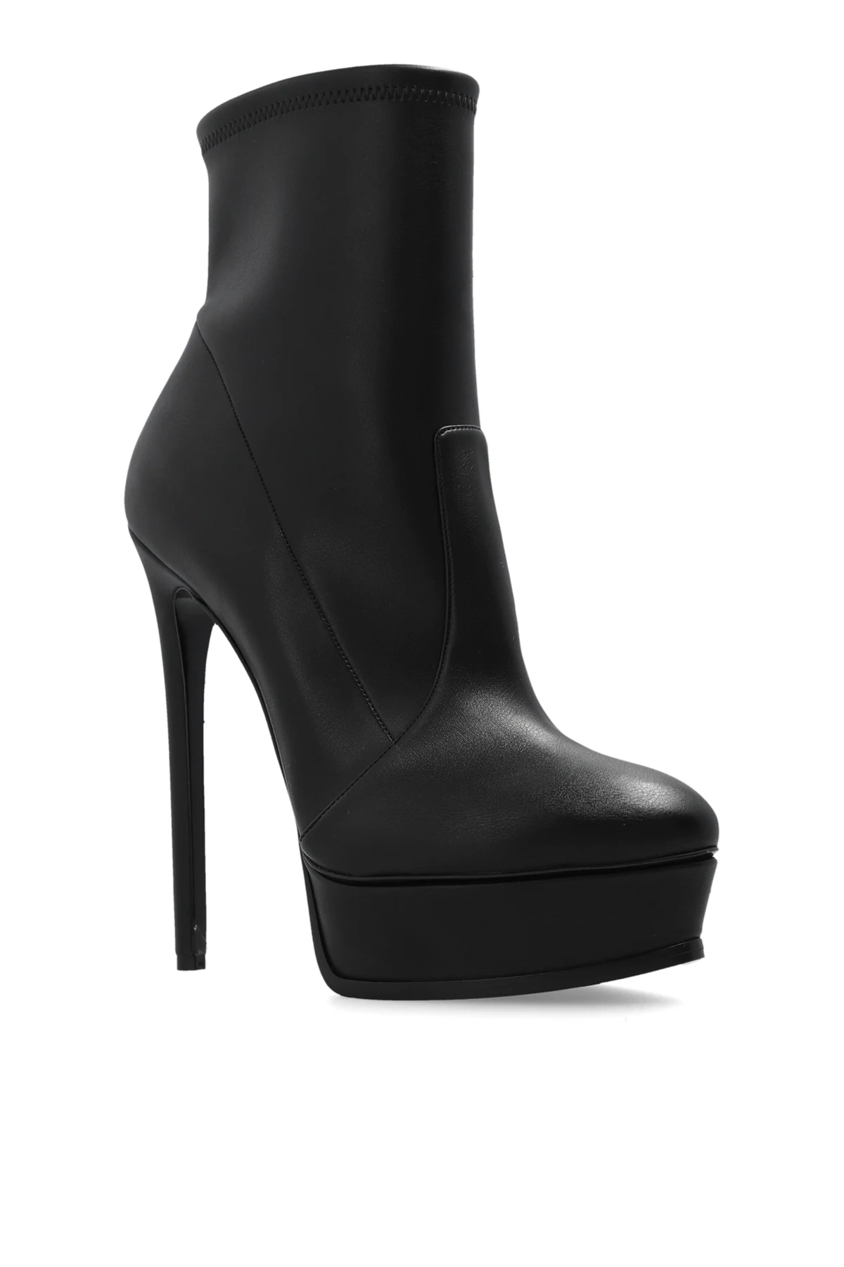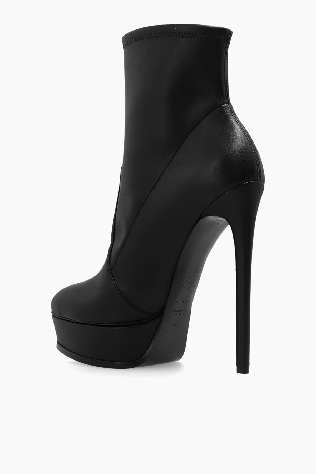 Czarne, wsuwane botki na platformie, model ‘Flora’ Casadei. Wykonane z imitacji skóry. Zaokrąglony nosek. Wysoki obcas. Czarna, gumowa podeszwa. Wyprodukowano we Włoszech.