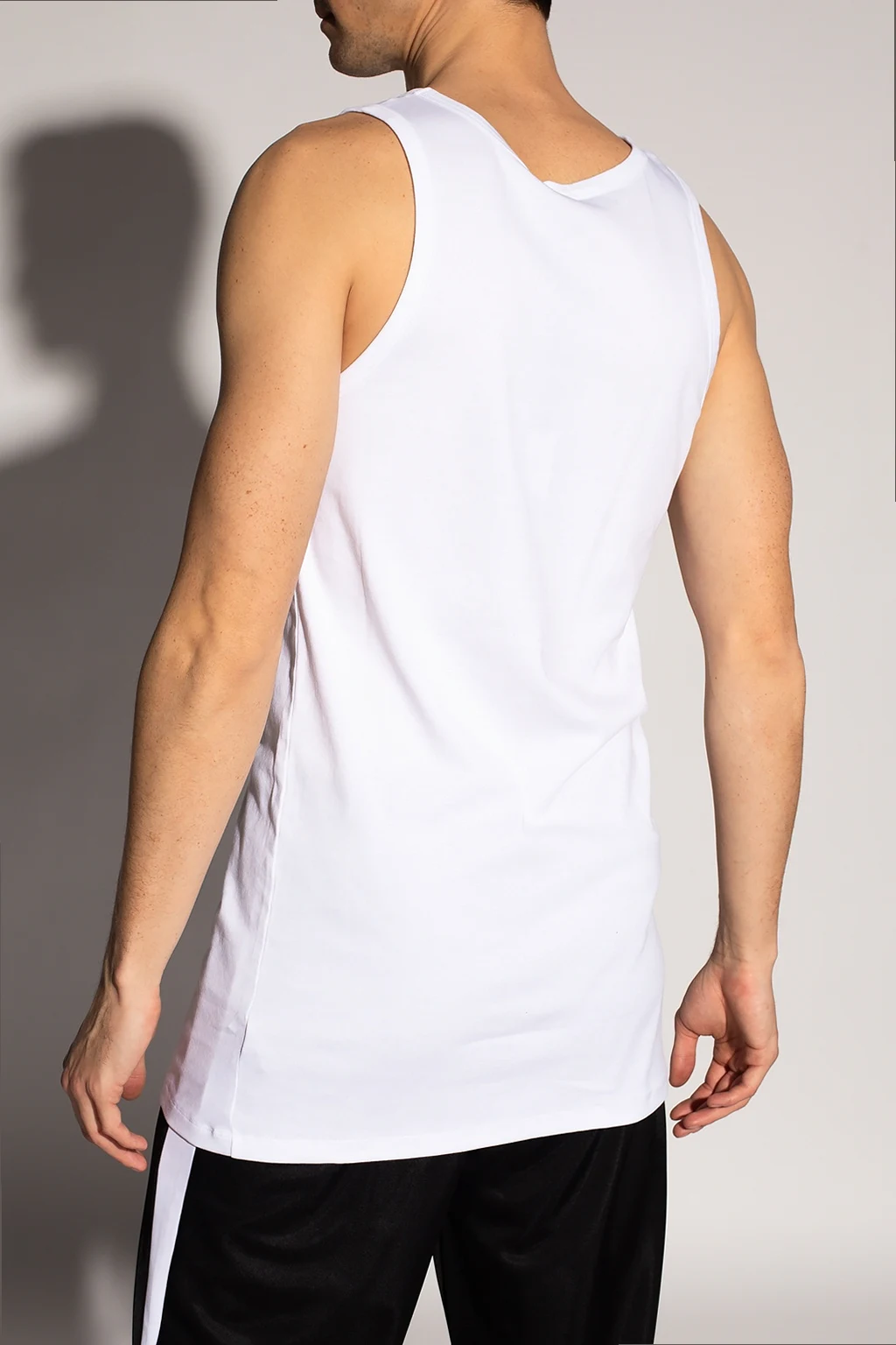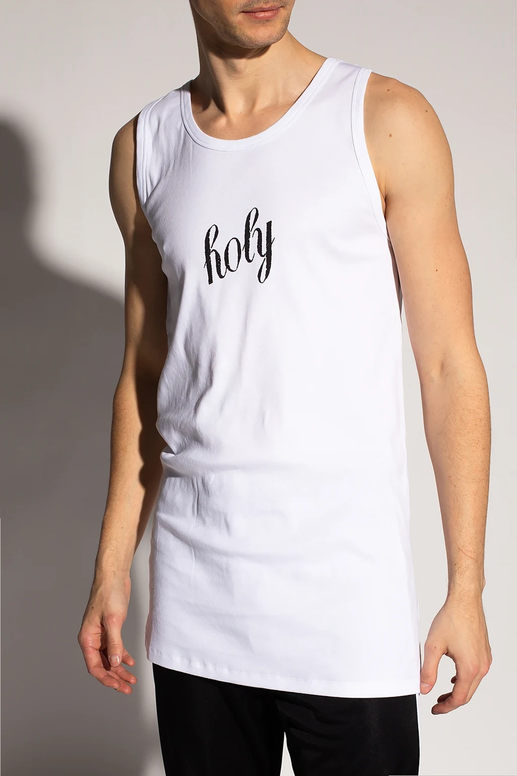 Biały, bawełniany t-shirt bez rękawów Ann Demeulemeester. Z przodu ozdobiony czarnym nadrukiem. Okrągły dekolt.