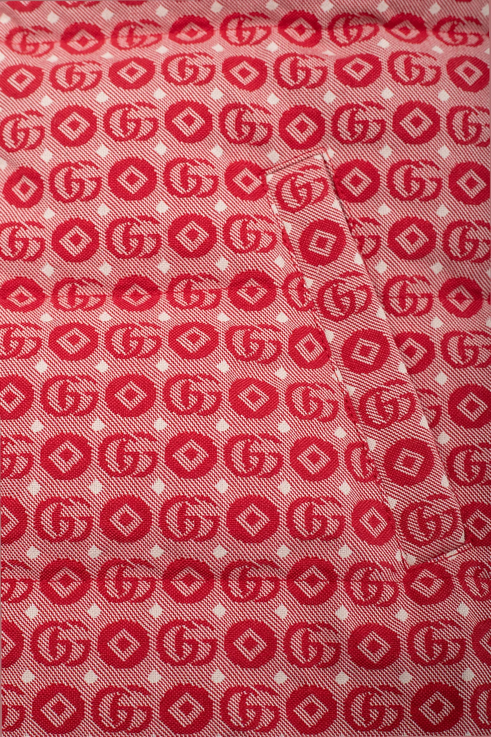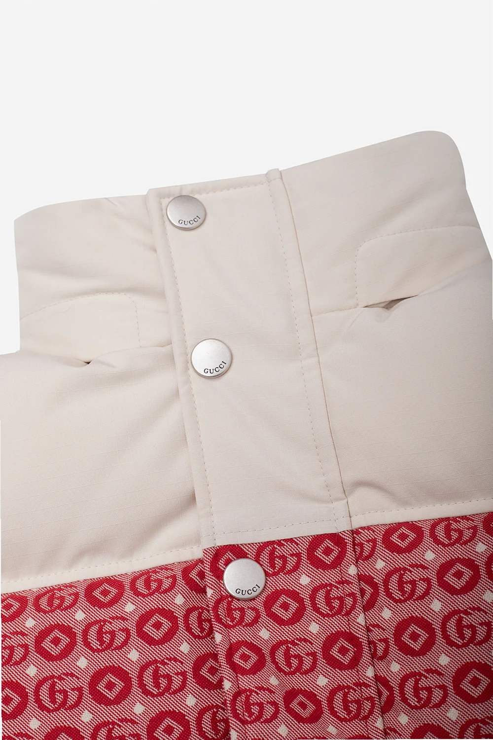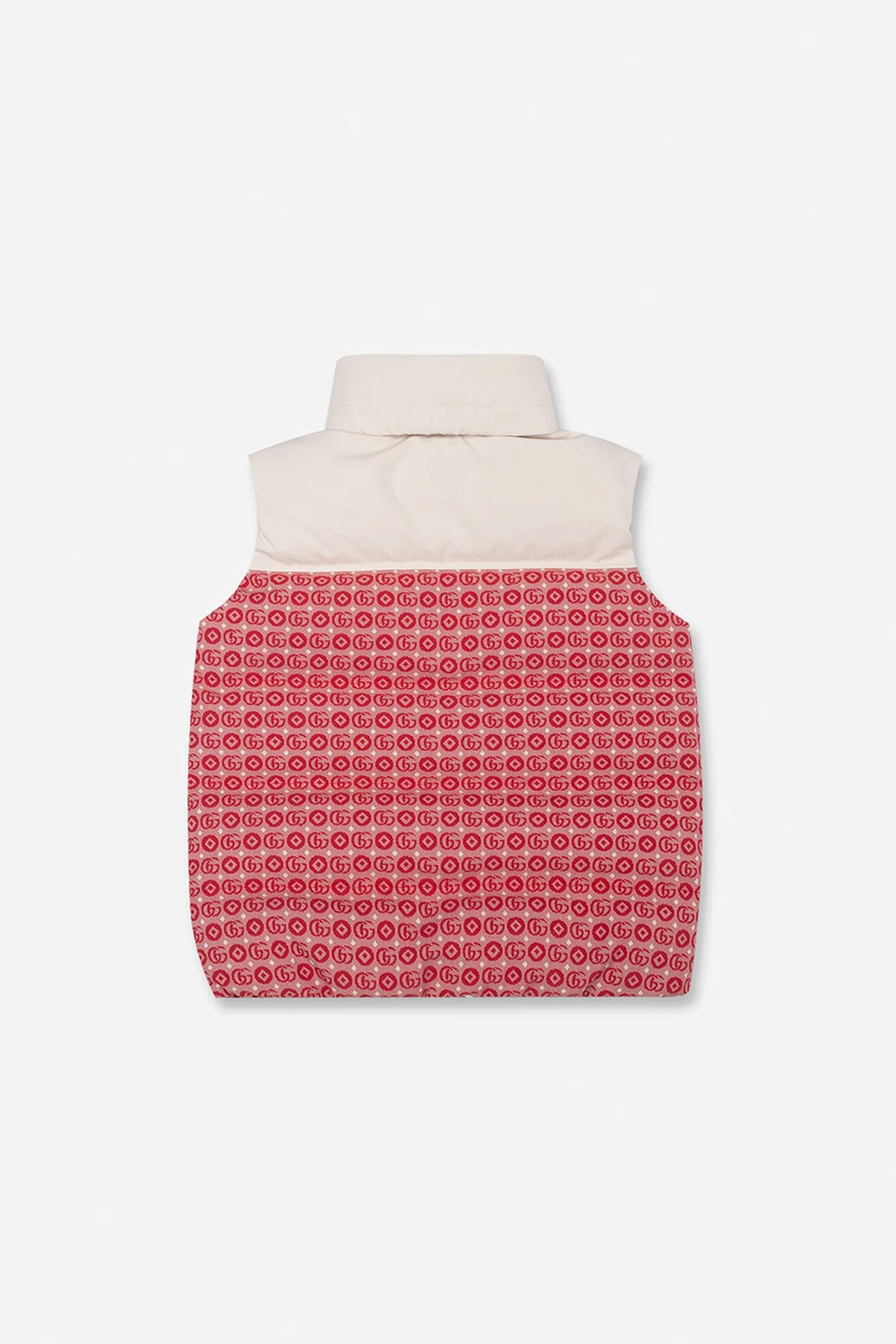Kremowo-czerwona, puchowa kamizelka Gucci Kids. Zapinana na zamek oraz zatrzaski. Ozdobiona wzorem z monogramem.