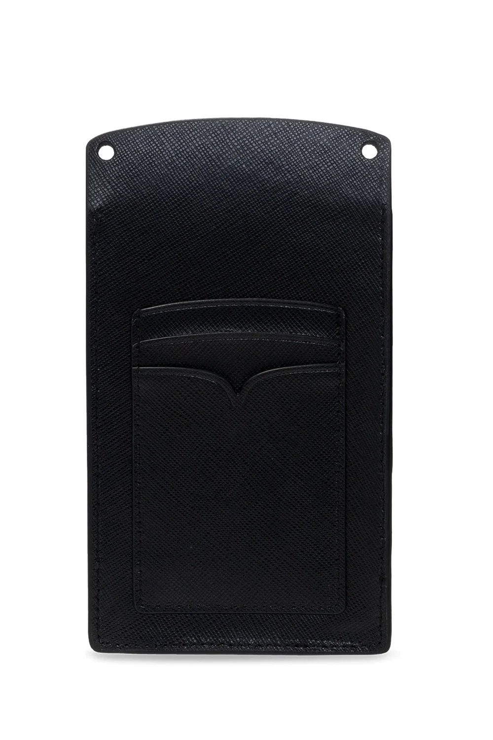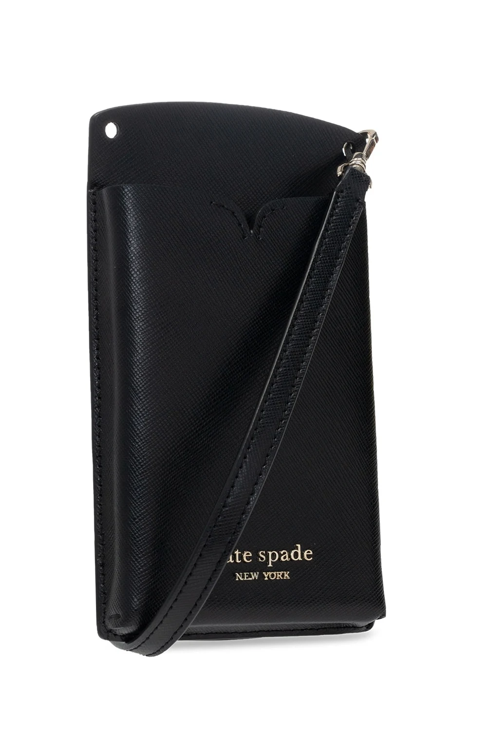 Czarne, skórzane etui na telefon, model ‘Spencer’ Kate Spade. Ozdobione metalowym logo w kolorze srebrnym. Z przodu wsuwana kieszeń. Z tyłu trzy miejsca na kartę. Odpinany pasek na ramię z możliwością regulacji długości.