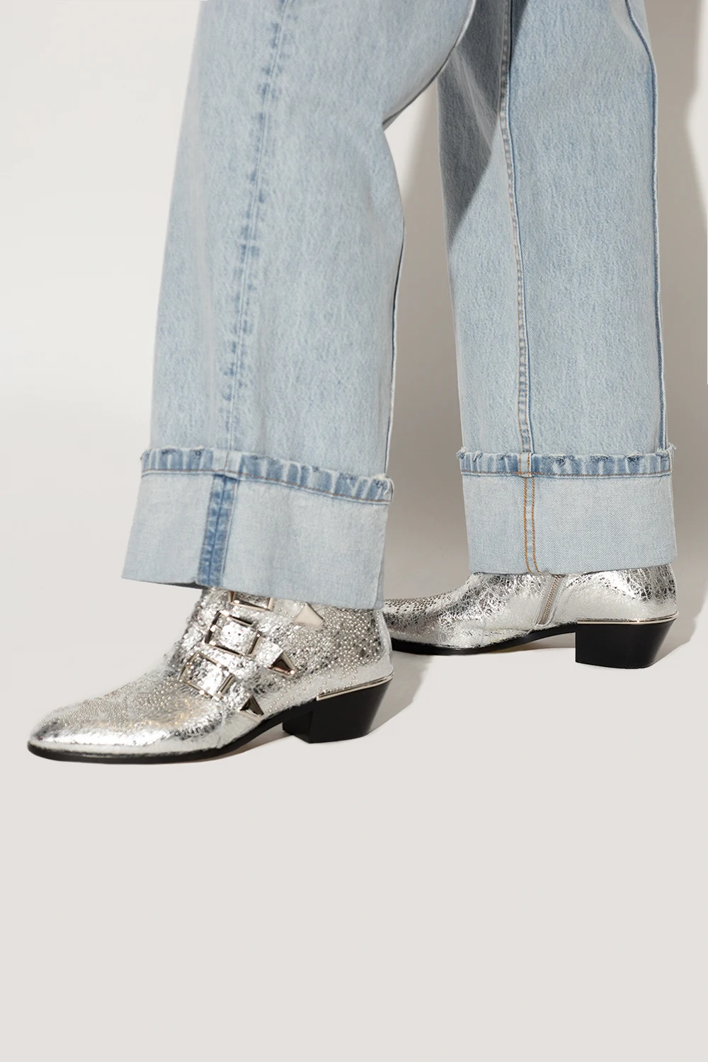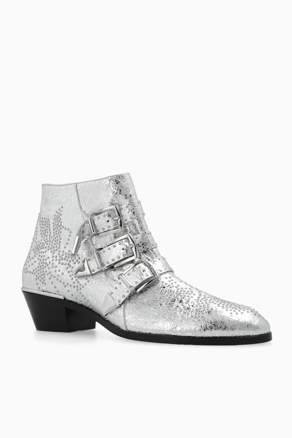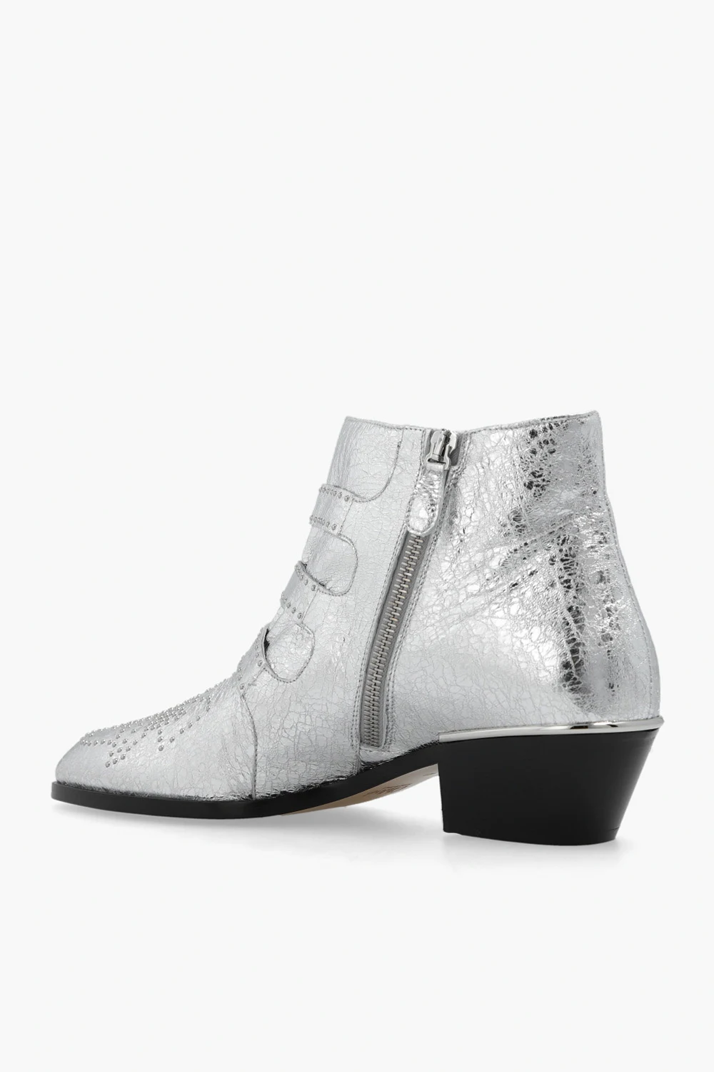 Botki na obcasie w kolorze srebrnym, model ‘Susan’ Chloé. Wykonane ze skóry. Z boku zapinane na zamek. Regulowane paskami z klamrą. Dekoracyjnie wykończone ćwiekami. Beżowa, skórzana podeszwa.