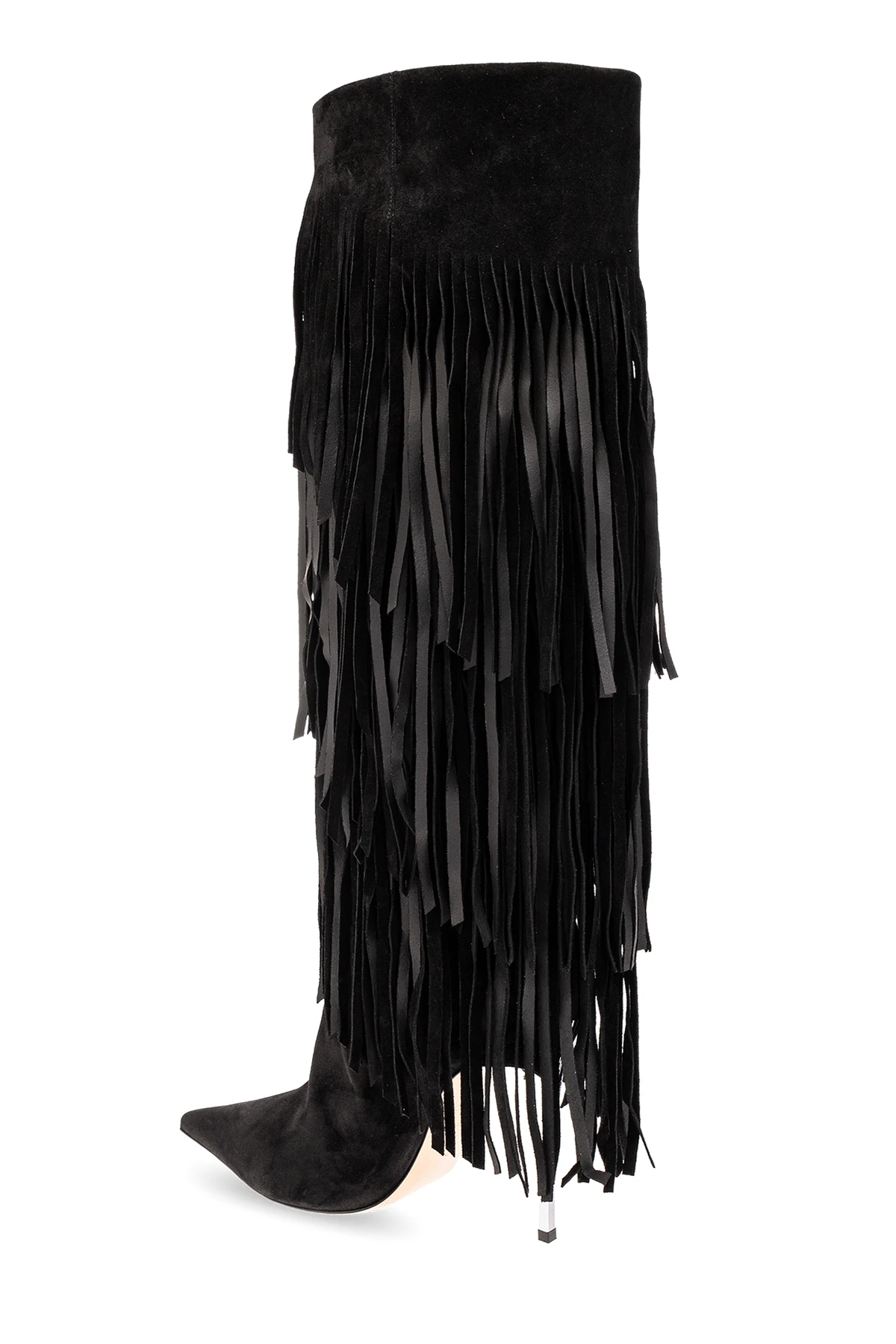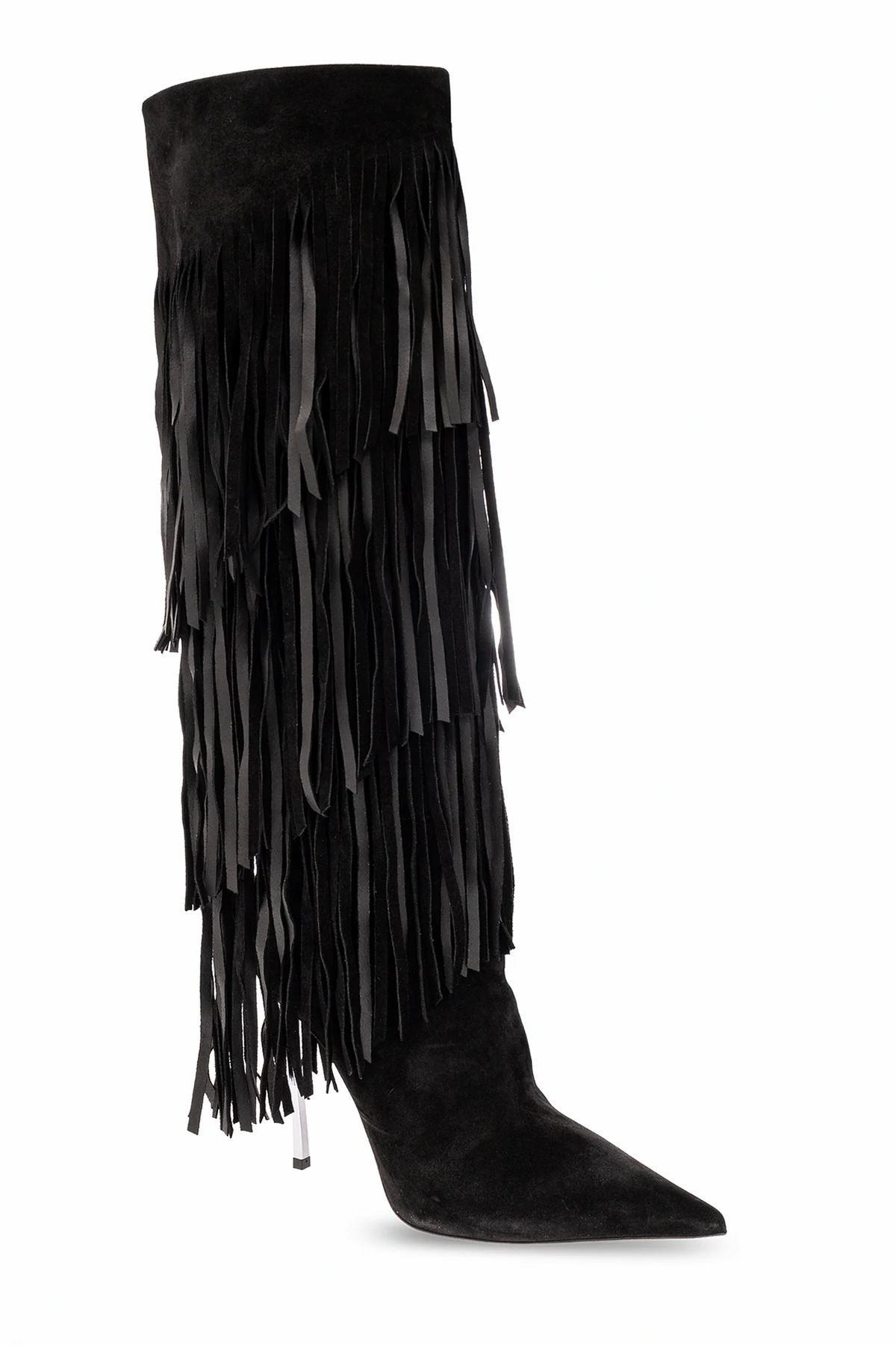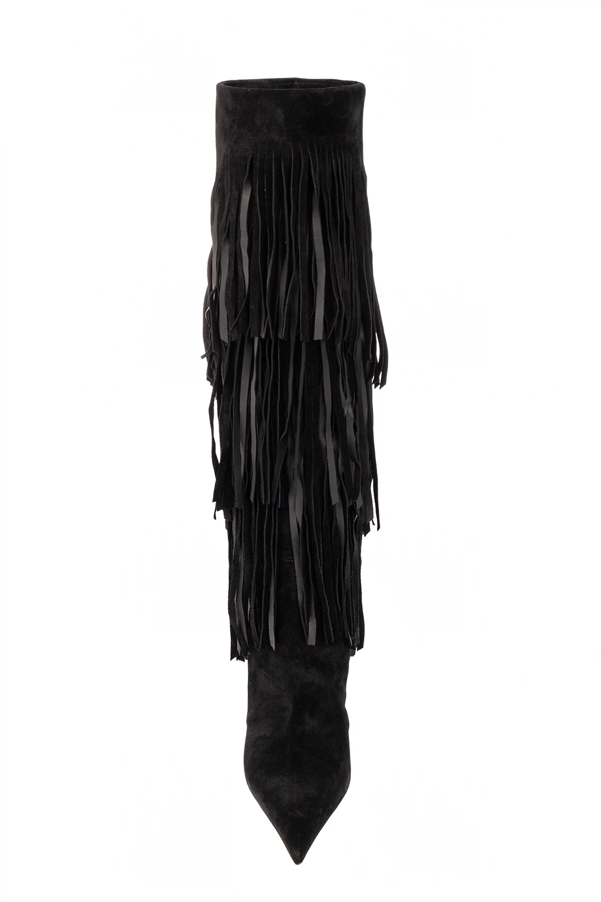 Czarne kozaki na obcasie, model ‘Super Blade’ Casadei. Wykonane z zamszu. Ozdobione frędzlami. Nosek w szpic. Podeszwa wykonana ze skóry w kolorze beżowym.