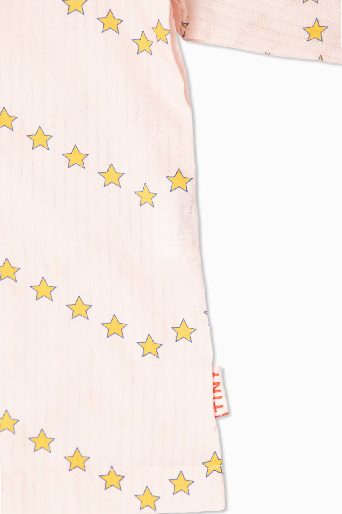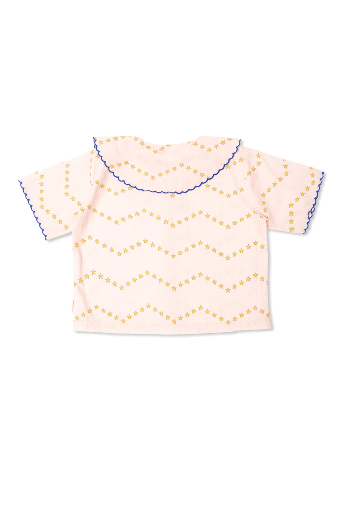 Charakterystyczny różowy odcień tkaniny staje się tłem dla regularnie rozmieszczonych, żółtych gwiazd, które rozświetlają całość kompozycji, tworząc eleganckie poziome pasy. Dodatkowo, koszula ta ujmuję serca subtelnymi, ale wyraźnymi detalami - zaokrąglone brzegi kołnierza oraz krótkie rękawy , wykończone granatową falbanką, wprowadzają harmonijny kontrast i dodają całości lekkości.