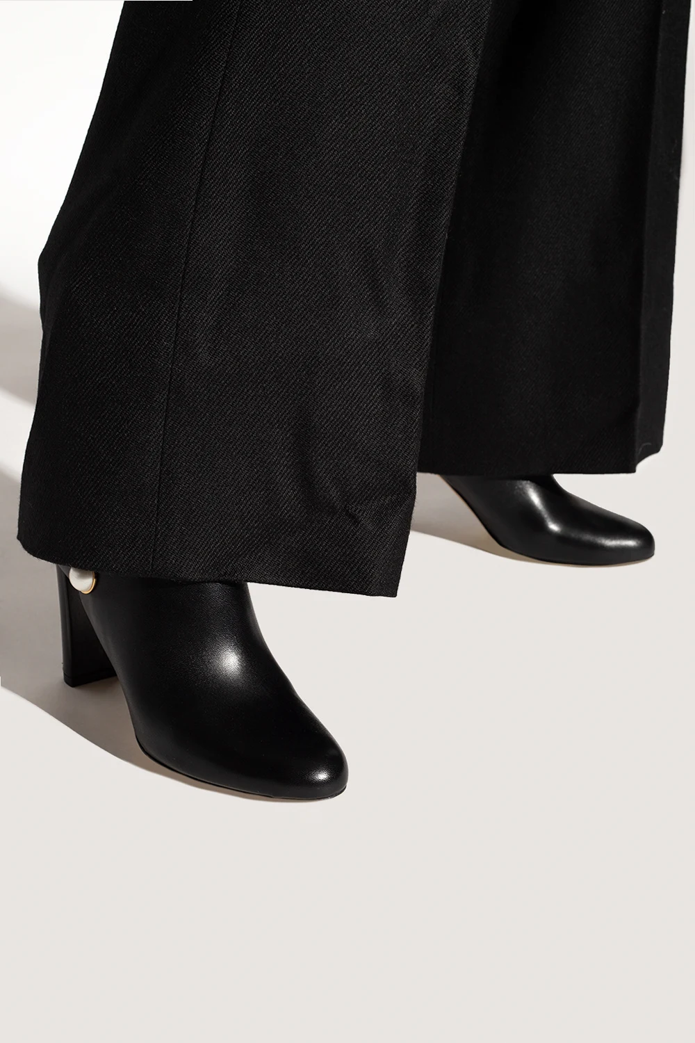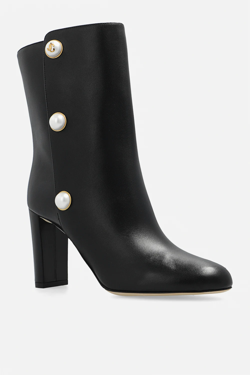 Czarne, skórzane botki na obcasie, model ‘Rina’ Jimmy Choo. Zapinane na zatrzask i zaczepy wykończone perłową aplikacją i monogramem ‘JC’. Zaokrąglony nosek. Kremowo-czarna podeszwa z gumy i skóry.