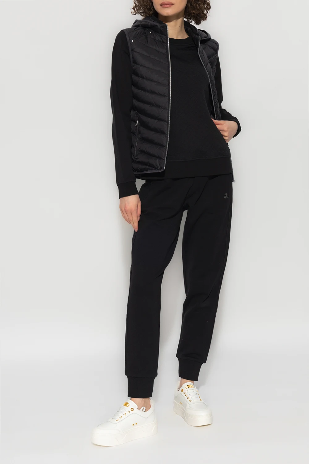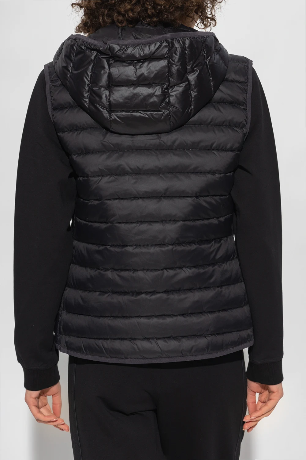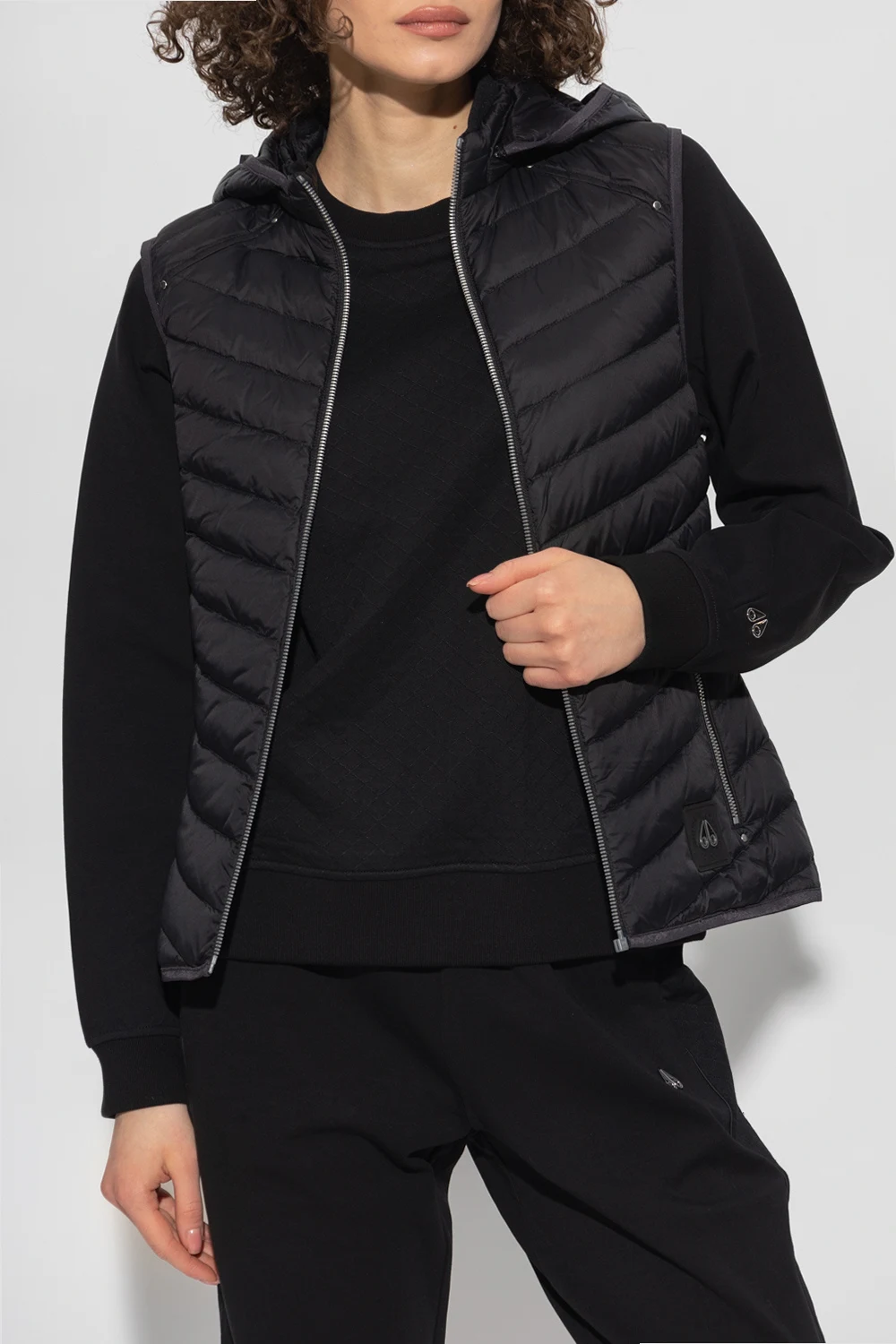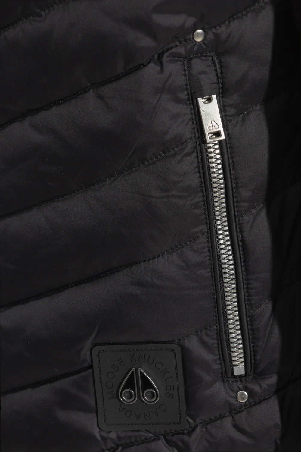 Czarna, pikowana kamizelka puchowa Moose Knuckles. Zapinana na zamek. Odpinany kaptur. Aplikacja z logo. Dwie kieszenie zapinane na zamki.