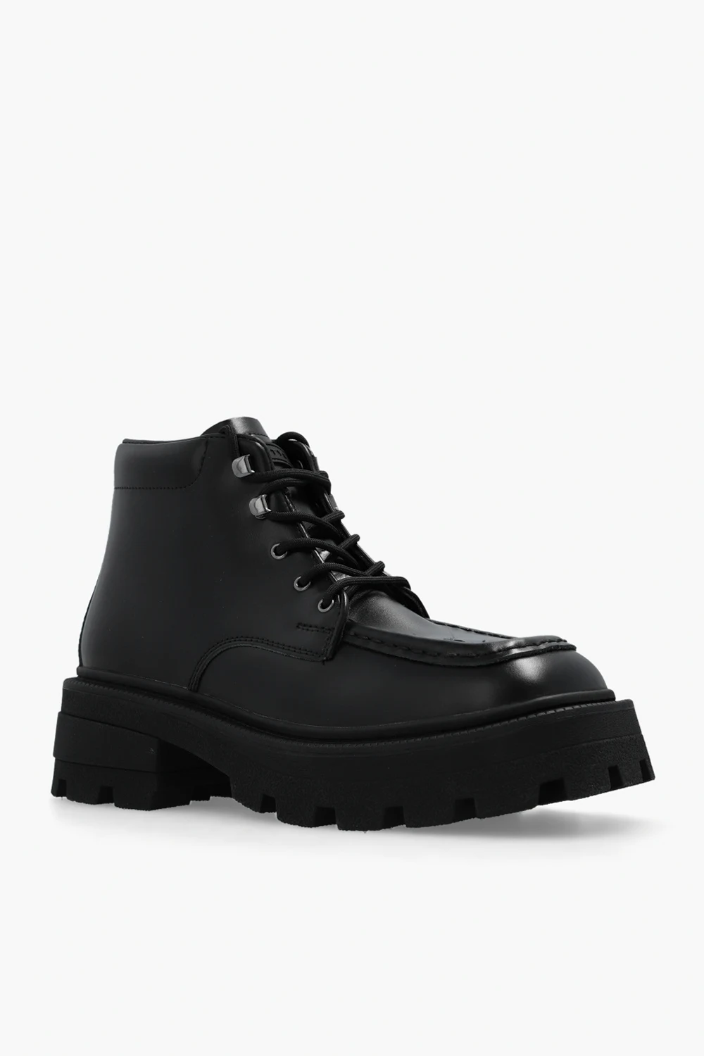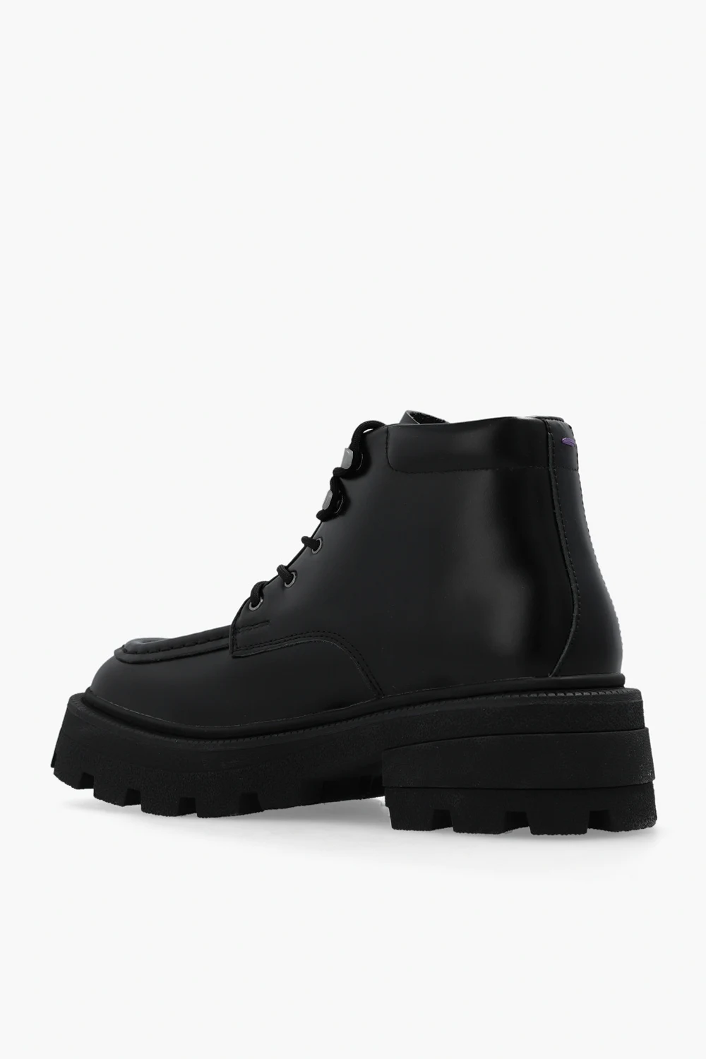Czarne, sznurowane buty za kostkę na platformie, model 'Tribeca' Eytys. Wykonane ze skóry. Język ozdobiony gumową naszywką z logo. Z przodu dekoracyjne przeszycia. Czarna, gumowa podeszwa z wytłoczonymi prążkowaniami.
