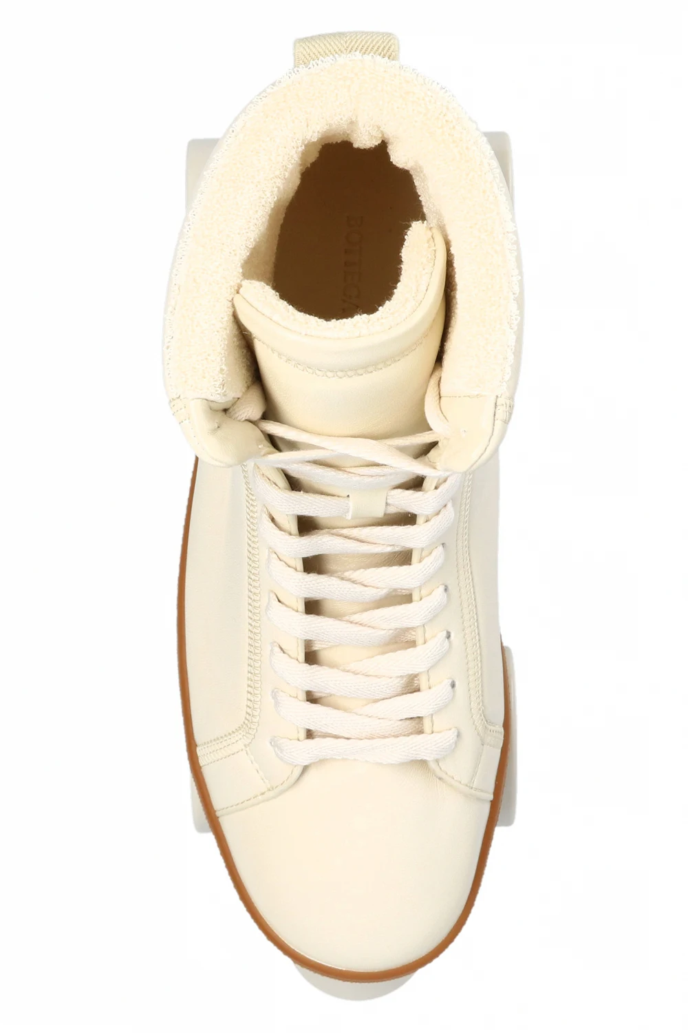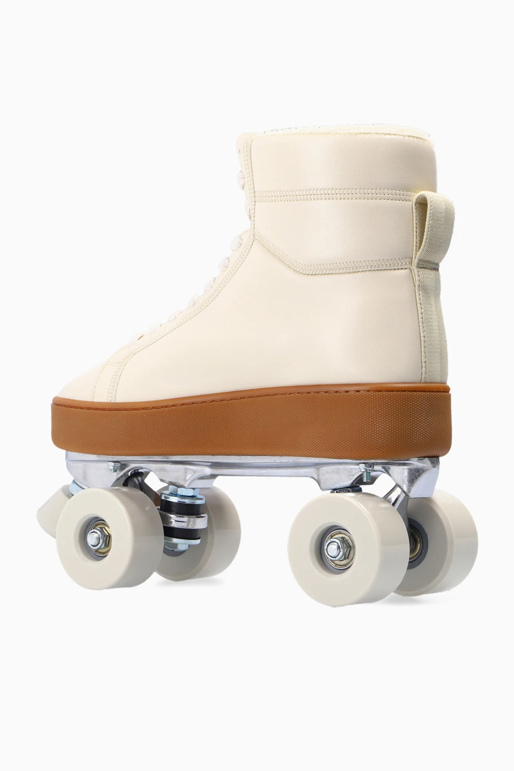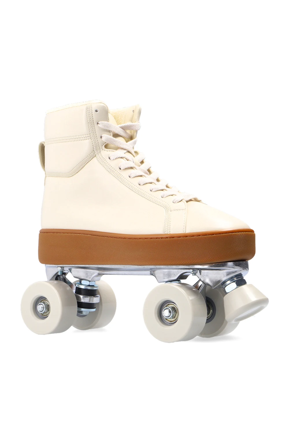Kremowe, sznurowane wrotki, model ‘Quilt’ Bottega Veneta. Wykonane ze skóry jagnięcej. Brązowa, gumowa podeszwa. Metalowe elementy w kolorze srebrnym. Dołączone wymienne sznurowadła.