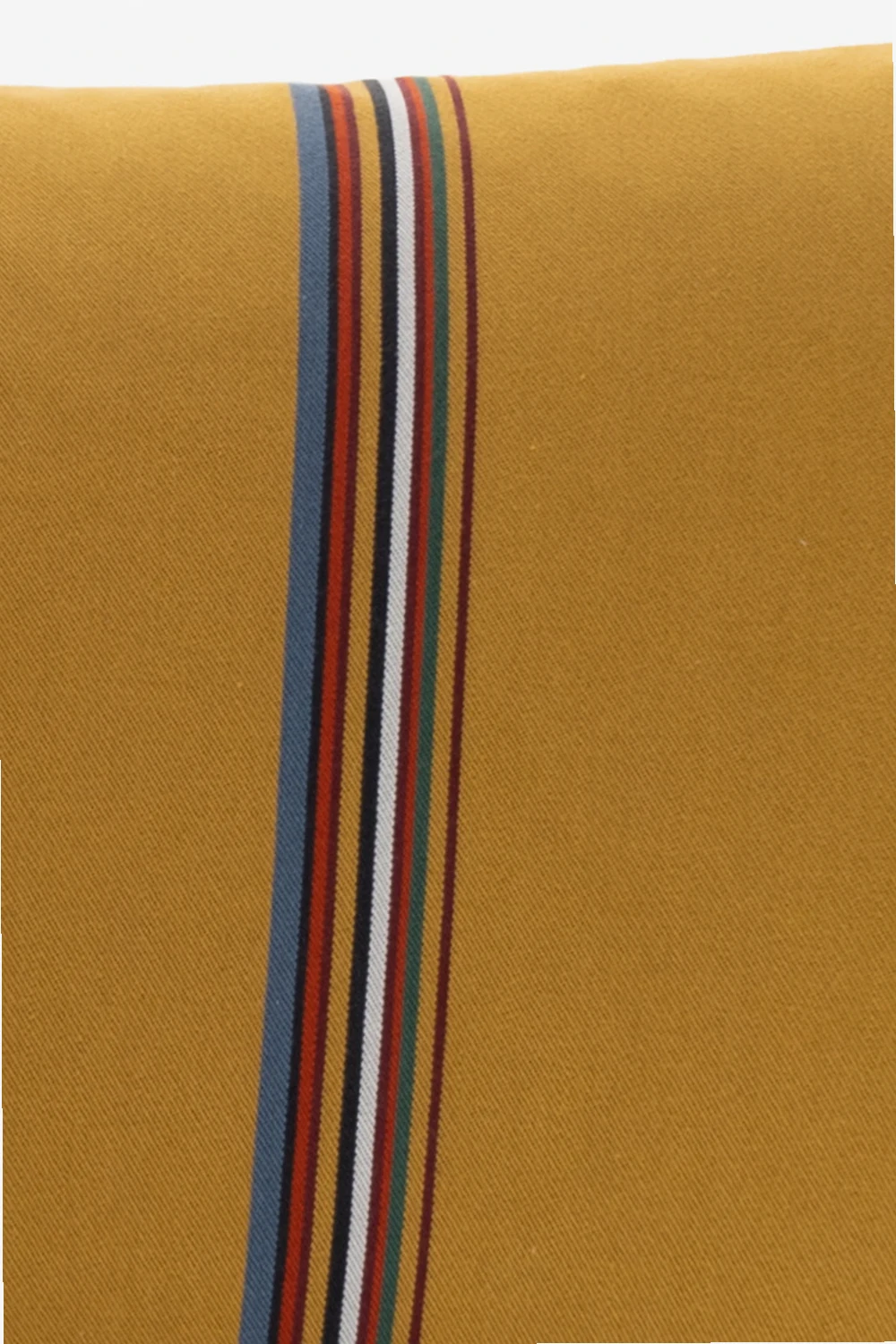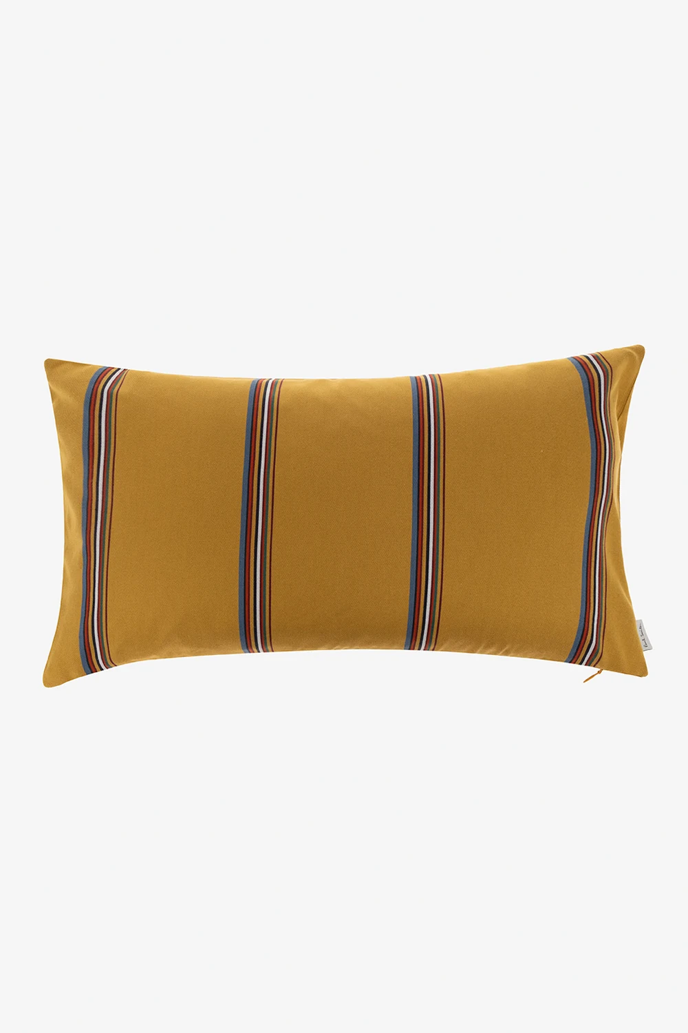 Biała, bawełniana poduszka Paul Smith. Wypełnienie z pierzu z recyklingu. Beżowa, bawełniana poszewka ze wzorem w kolorowe prążki oraz zapięciem na zamek.