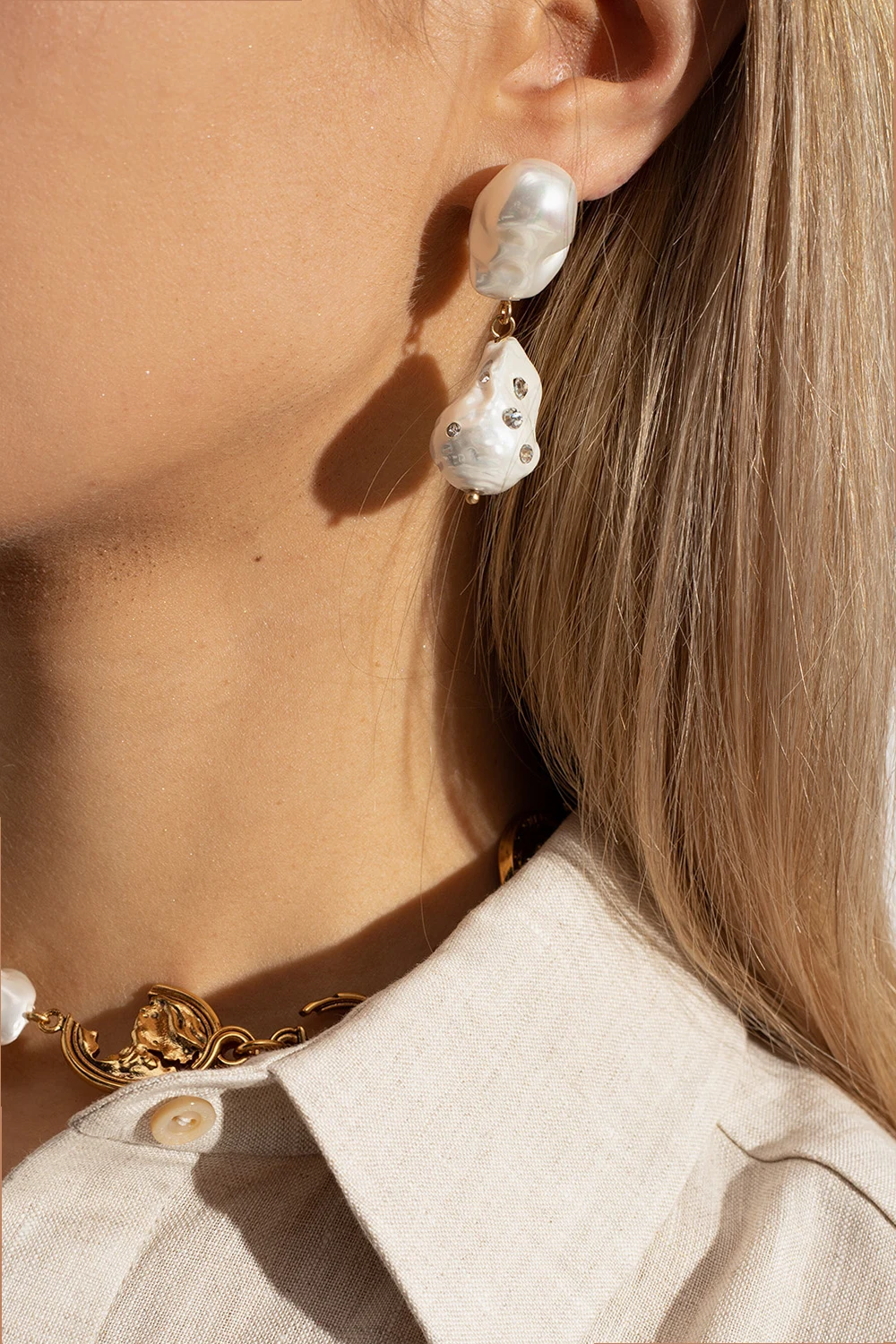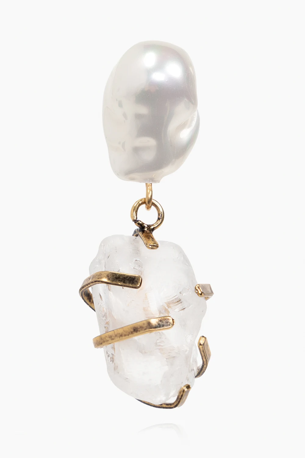 Asymetryczne kolczyki w kolorze złotym Erdem. Zapinane na sztyft. Ozdobione sztucznymi perłami o nieregularnym kształcie, połyskującymi kryształami i kamieniem osadzonym w metalowej klatce ozdobionej wygrawerowanym logo.