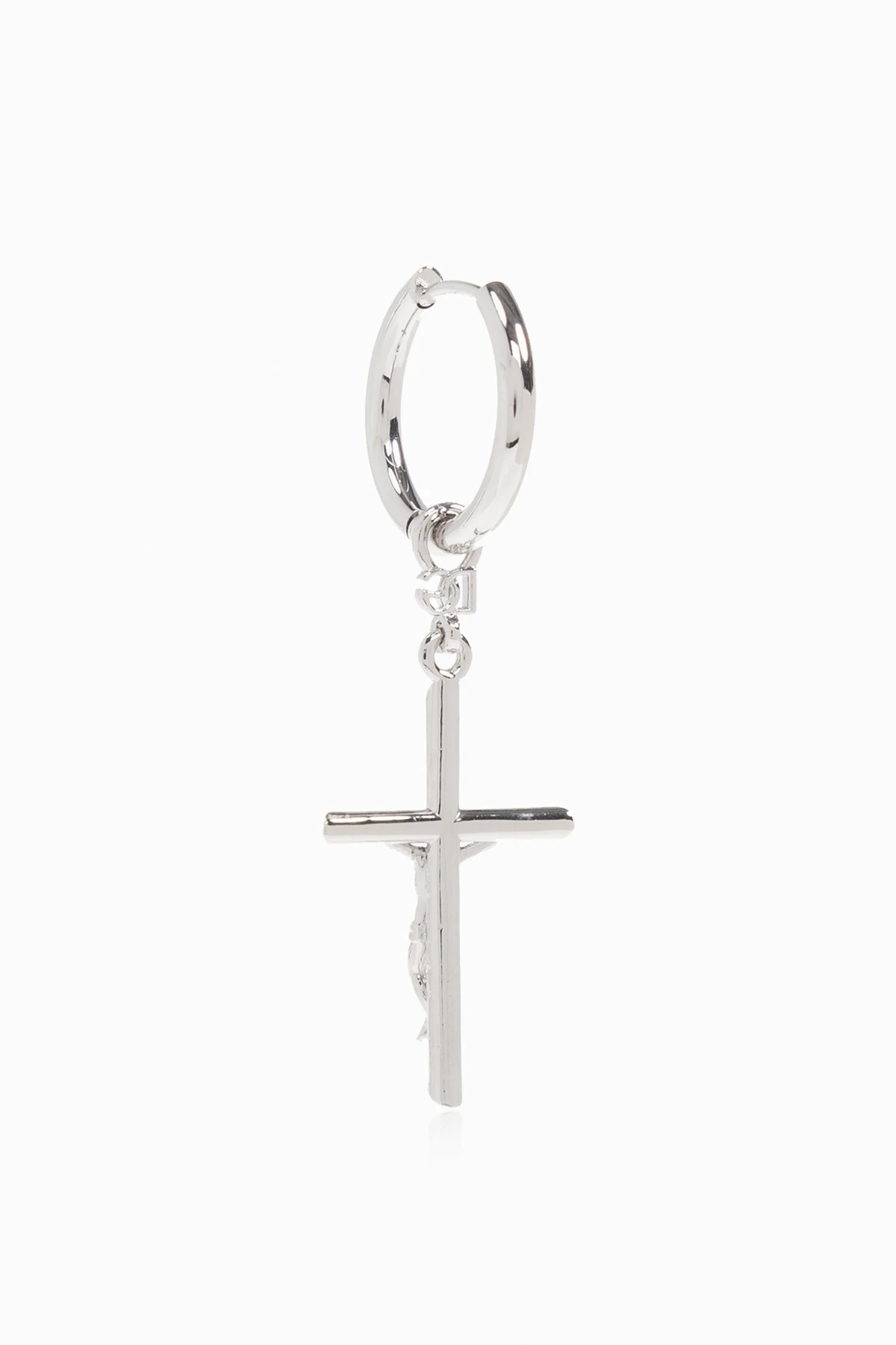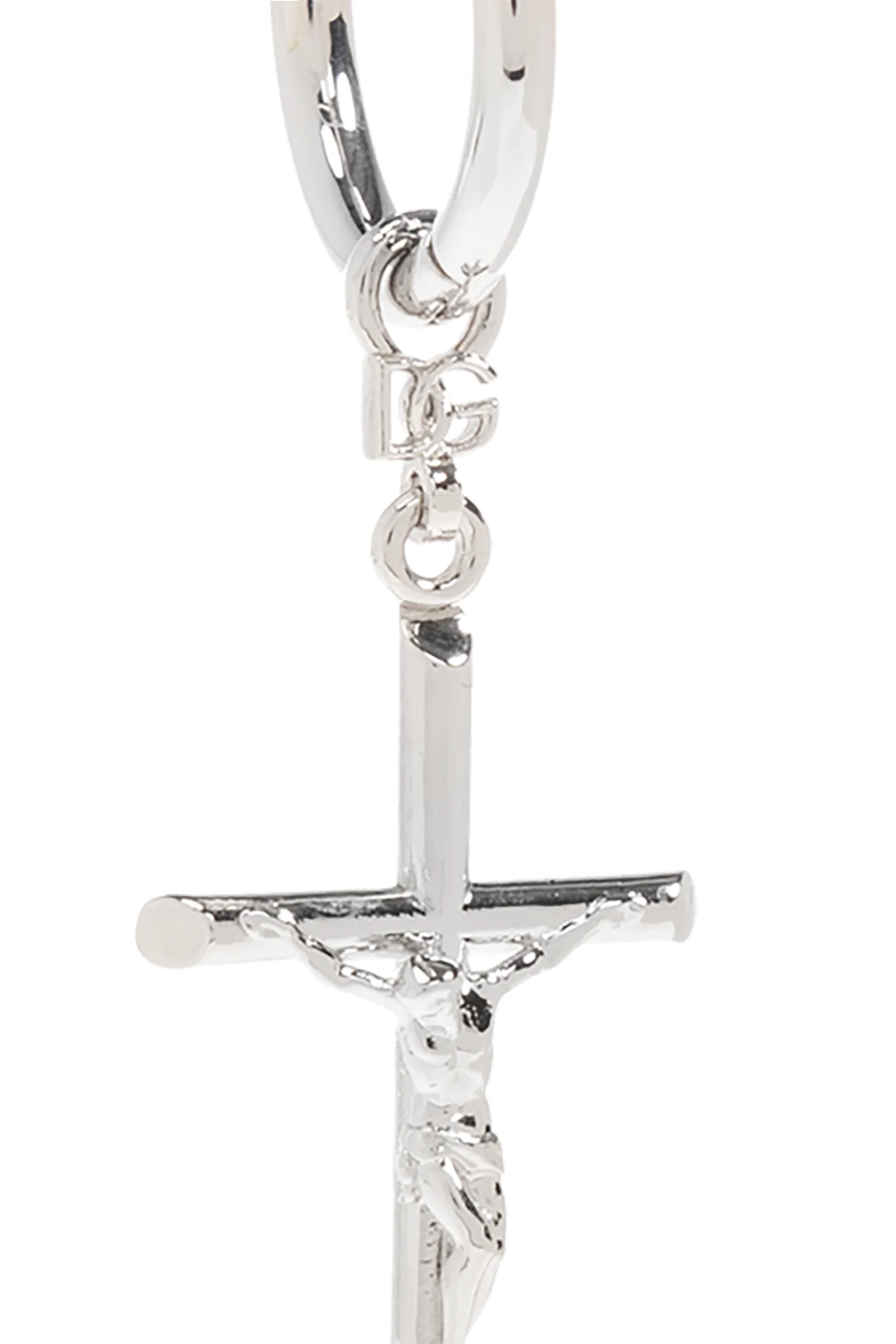 Mosiężny kolczyk w kolorze srebrnym Dolce & Gabbana. Ozdobiony zawieszką z motywem religijnym. Zapięcie na zatrzask.