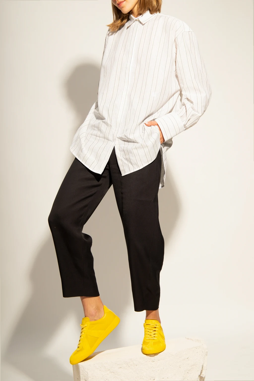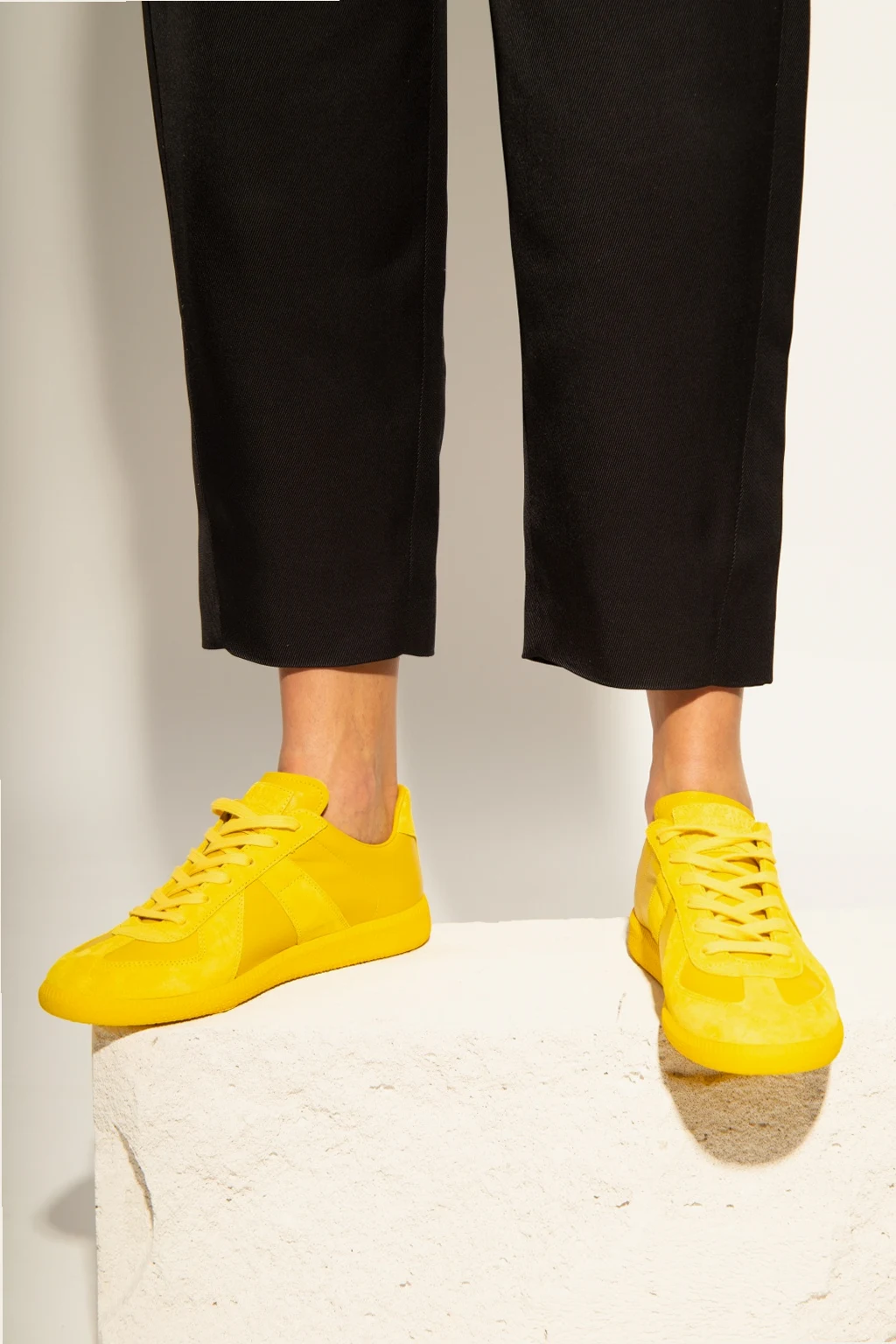 Żółte, sznurowane buty sportowe, model 'Replica' Maison Margiela. Wykonane z gładkiej skóry i zamszu. Z przodu naszywka z wytoczonym logo. Żółta, gumowa podeszwa.
