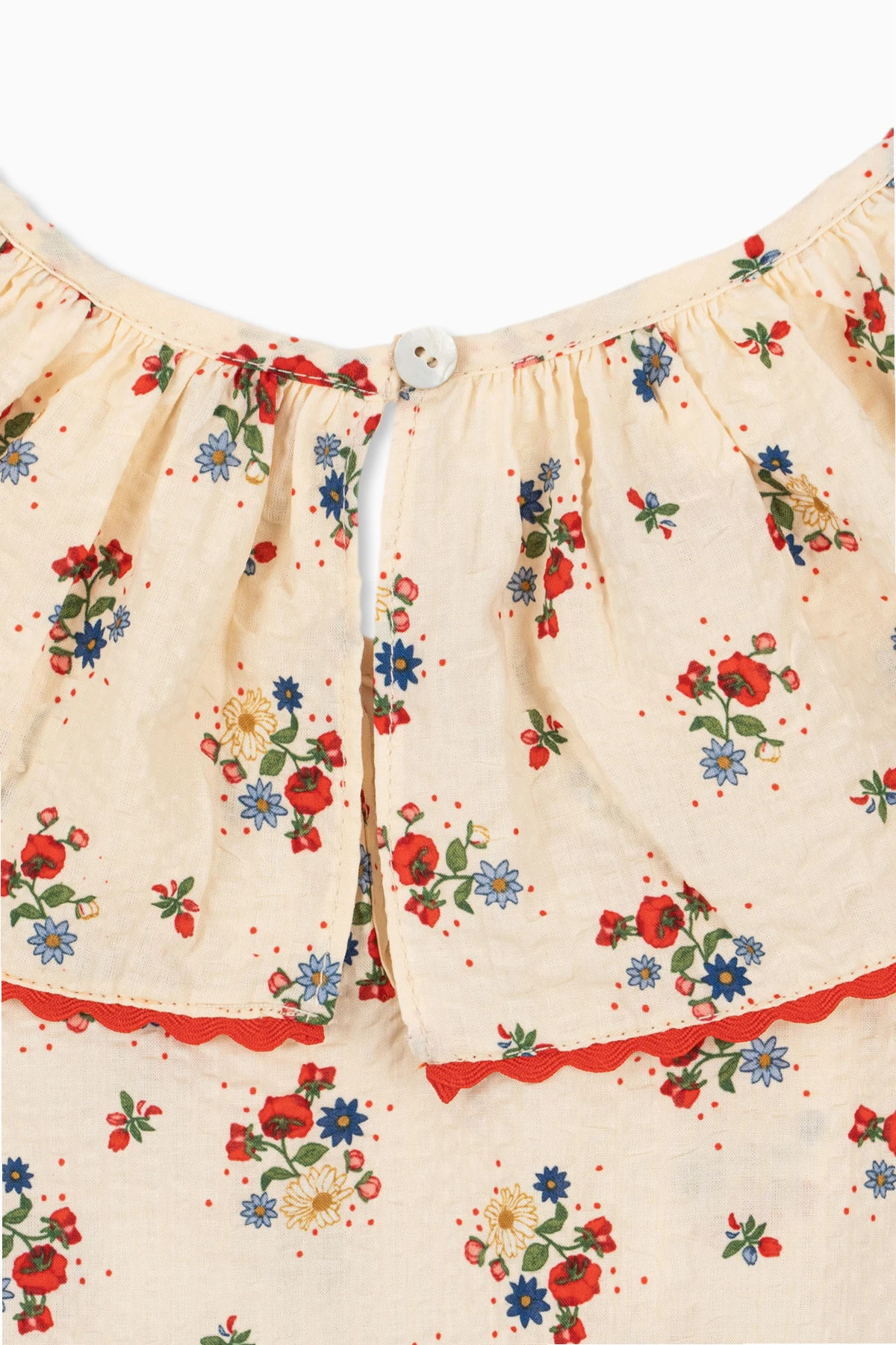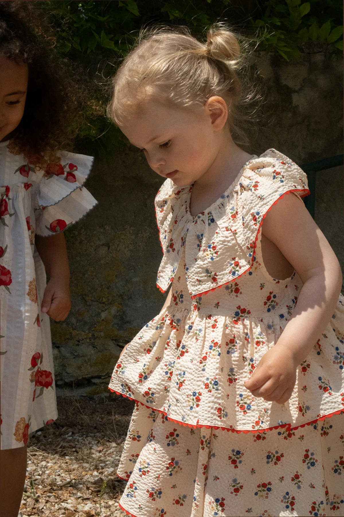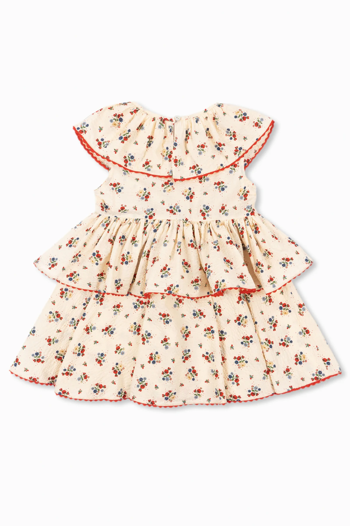 Wykonana z najwyższej jakości bawełny organicznej , sukienka zapewnia nie tylko nieporównywalny komfort noszenia, ale również jest przyjazna dla delikatnej dziecęcej skóry. Wielopoziomowa konstrukcja z falbanami nadaje sukience objętość i dynamikę, a zarazem podkreśla jej wyjątkowy charakter. Detale, takie jak czerwona lamówka zdobiąca brzegi i okrągły dekolt, czy uroczy biały guzik przy szyi, są świadectwem dbałości o każdy, nawet najdrobniejszy element.