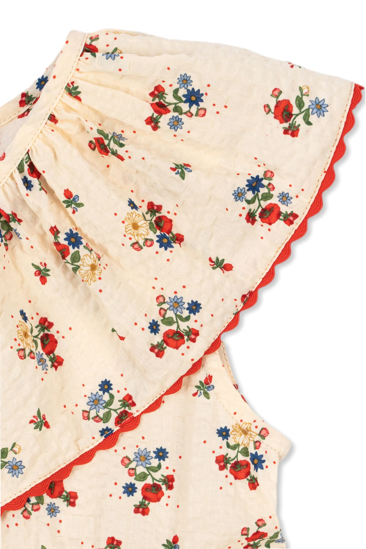 Przedstawiamy Sukienkę z motywem kwiatowym ‘Bella’ , dzieło renomowanego projektanta Konges Sløjd . To wykwintne połączenie subtelności i dziecięcej radości, które ujmuje swoją lekkością i dziewczęcym urokiem. Dominujący odcień ecru sprzyja rozkwitowi barwnego wzoru kwiatowego, w którym zielone liście i niebieskie drobinki kwiatów przeplatają się na tle różnorodnych kwiatów.