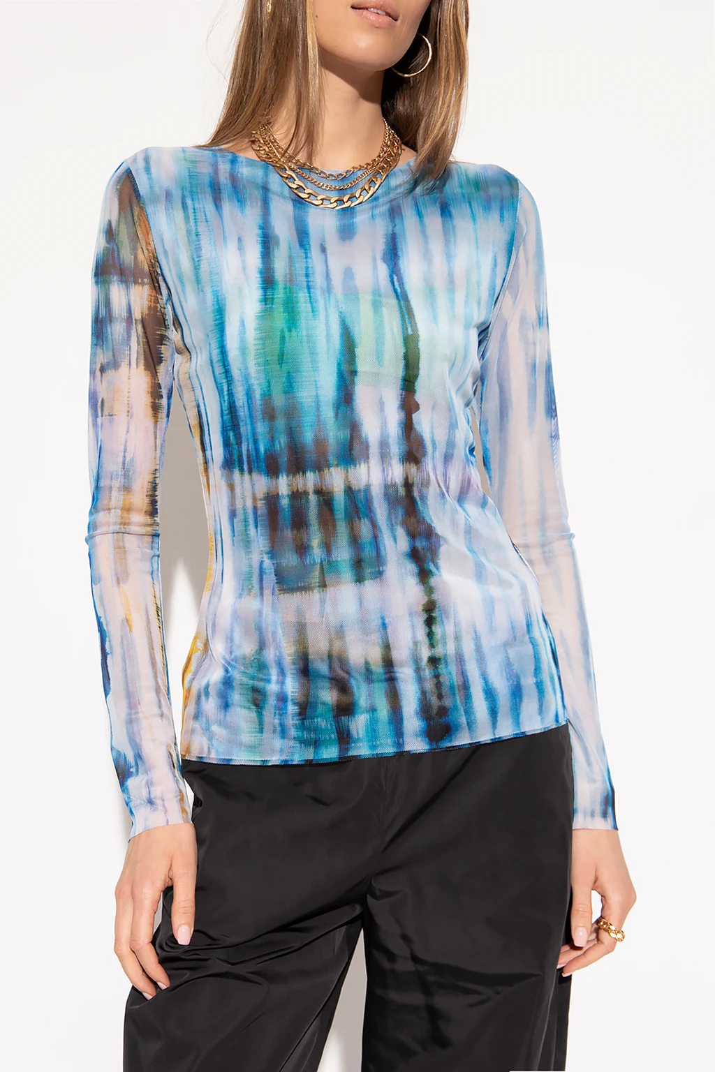 Kolorowy, transparentny top, model ‘Kikki’ Birgitte Herskind. Ozdobiony wzorem z motywem ‘tie-dye’. Długie rękawy.