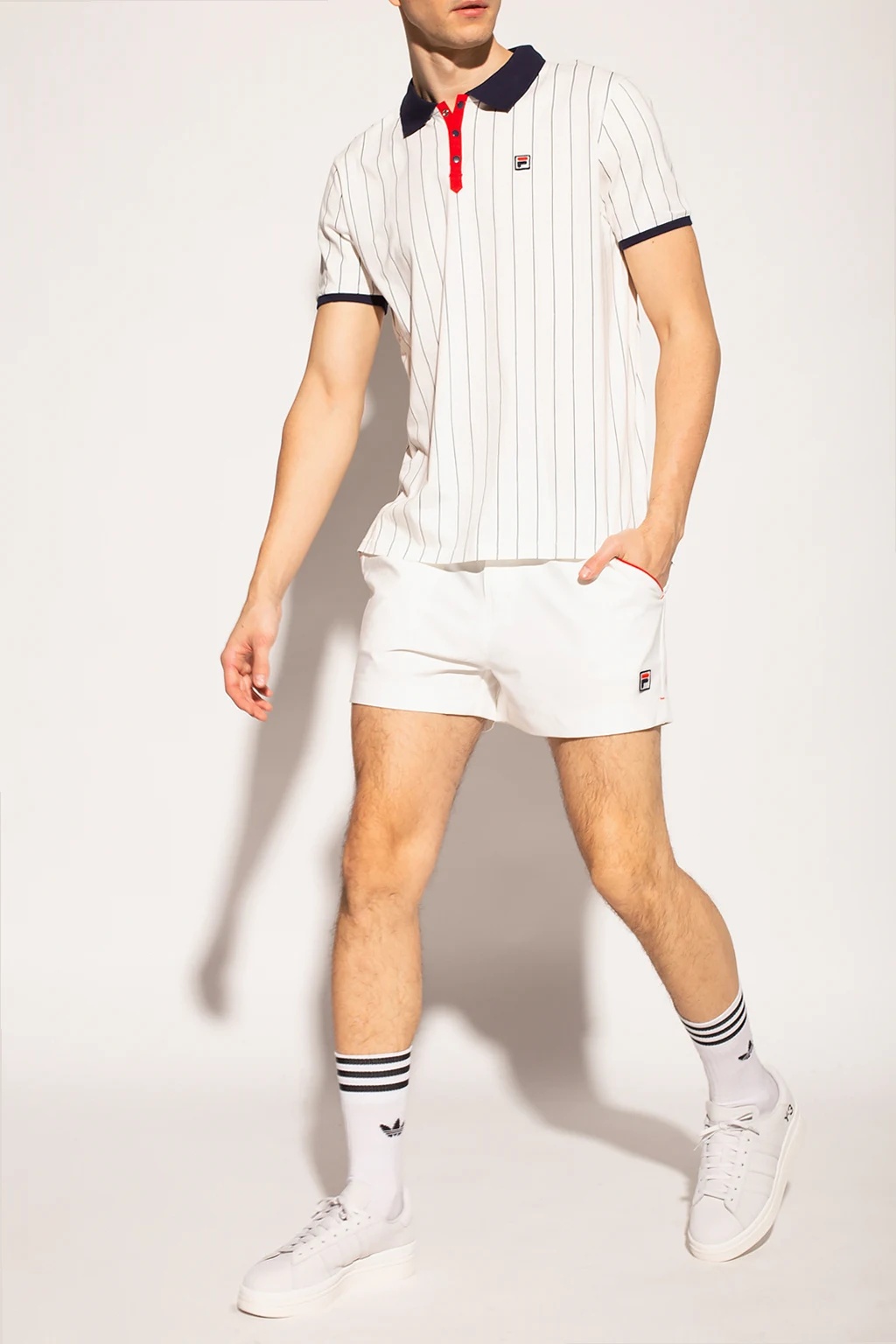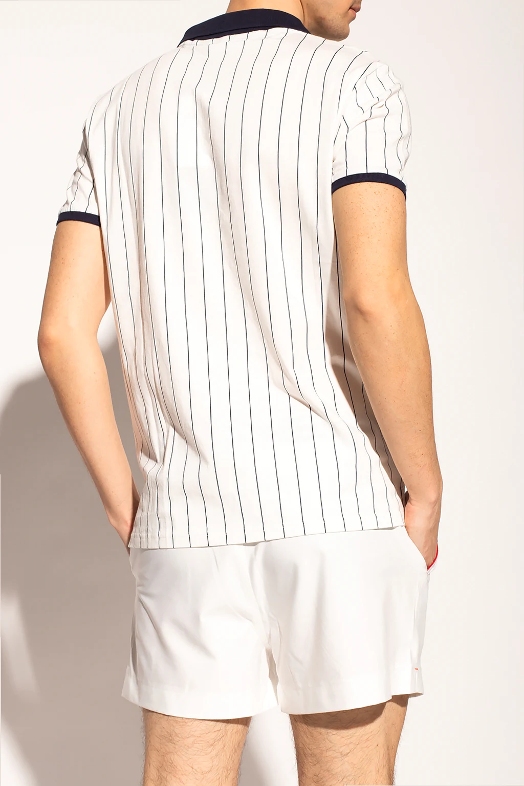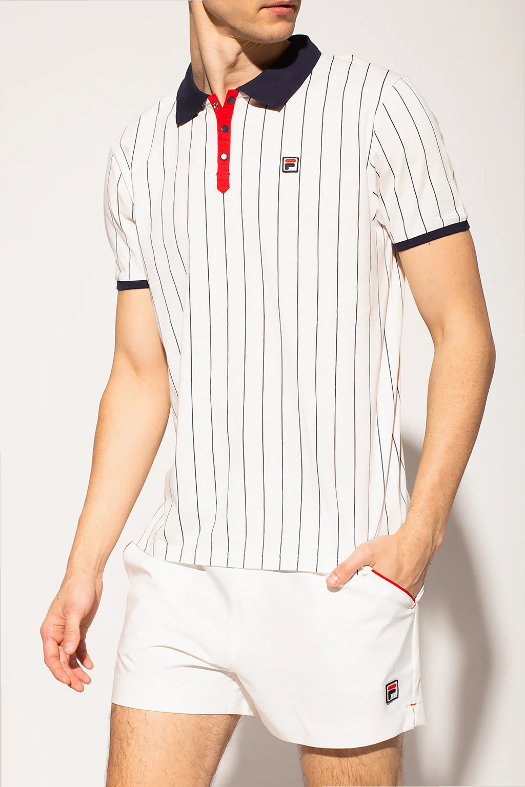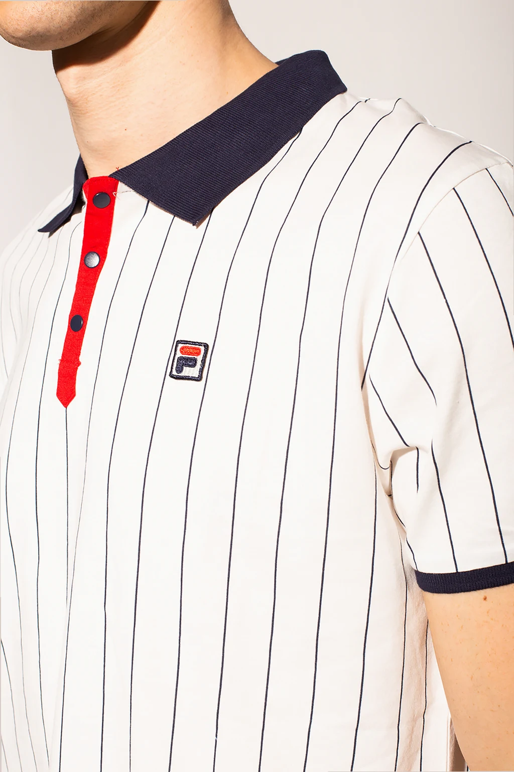 Białe polo Fila. Wykonane z bawełny. Pod szyją zapinane na guziki. Naszywka z logo. Nadrukowany wzór w paski w kolorze granatowym. Krótkie rękawy.