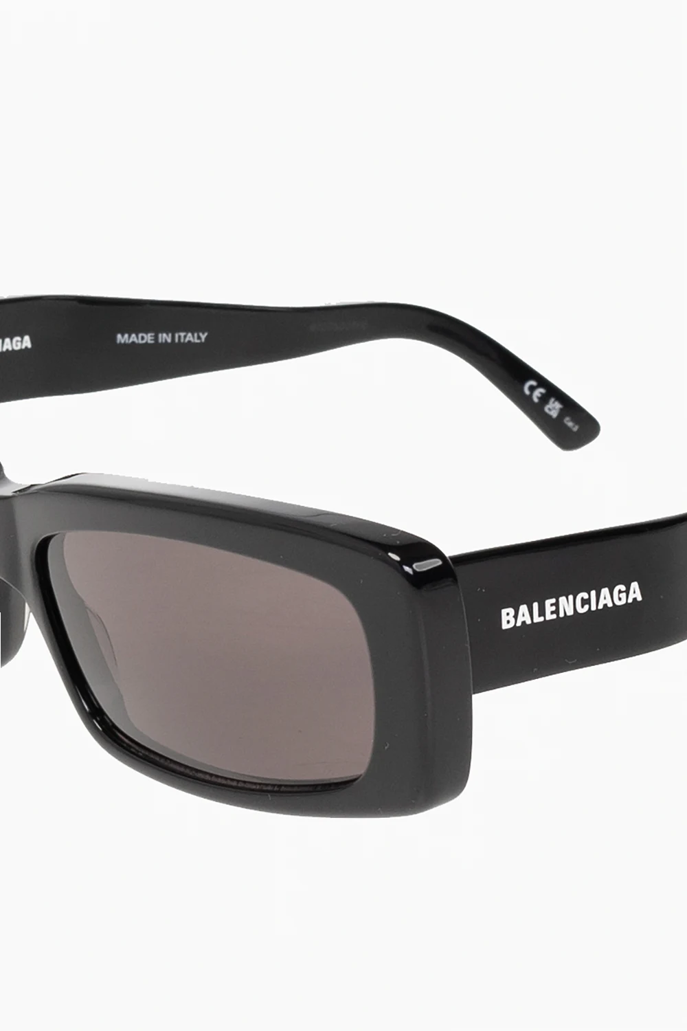 Czarne okulary przeciwsłoneczne, model ‘Oversize Rectangle’ Balenciaga. Prostokątne oprawki z pojedynczym mostkiem i zintegrowanymi noskami. Zakrzywione zauszniki ozdobione białym logo. Szare szkła ze 100% ochroną przed promieniami UV. Dołączone etui.