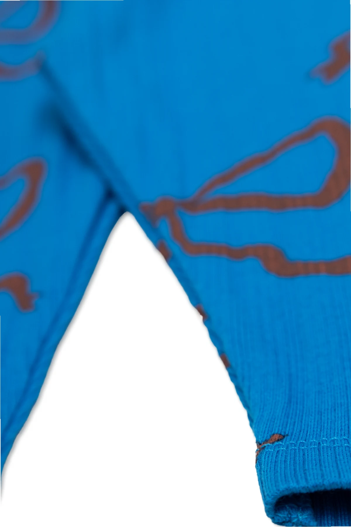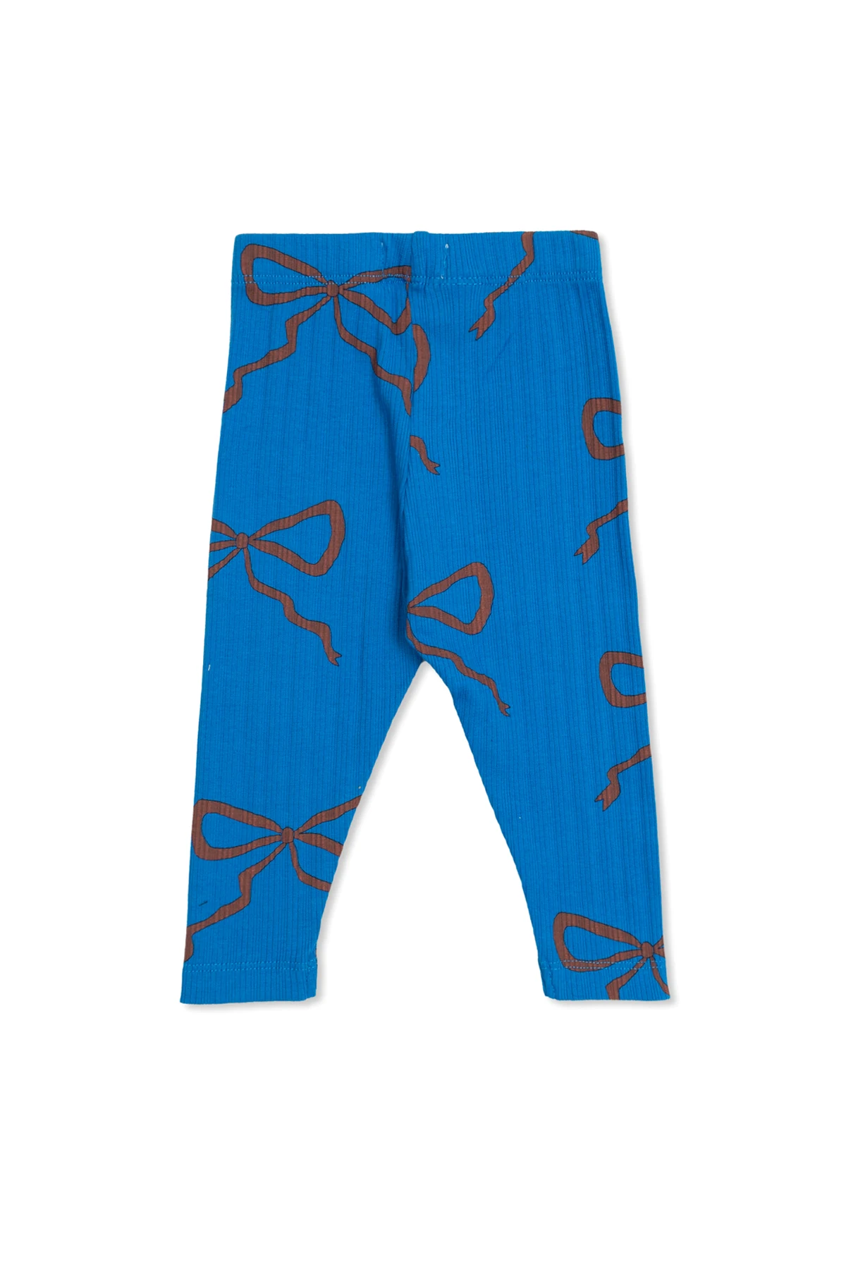 Legginsy cechują się klasycznym fasonem z długimi nogawkami, który został wzbogacony o subtelny nadruk w postaci brązowych kokardek na całej powierzchni. Dominującym kolorem jest delikatny niebieski, który w połączeniu z prążkowaną strukturą materiału tworzy harmonijną i estetyczną całość.