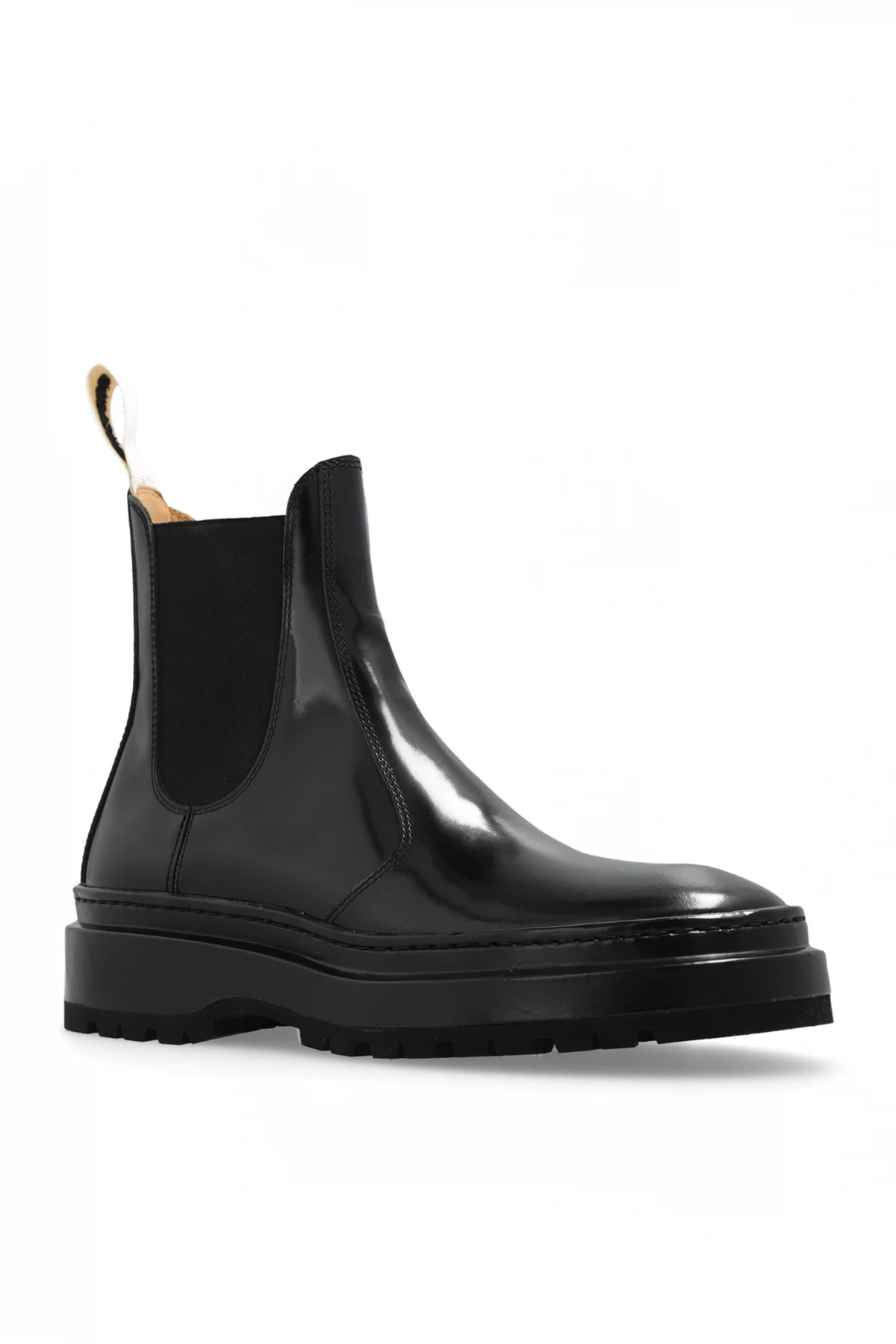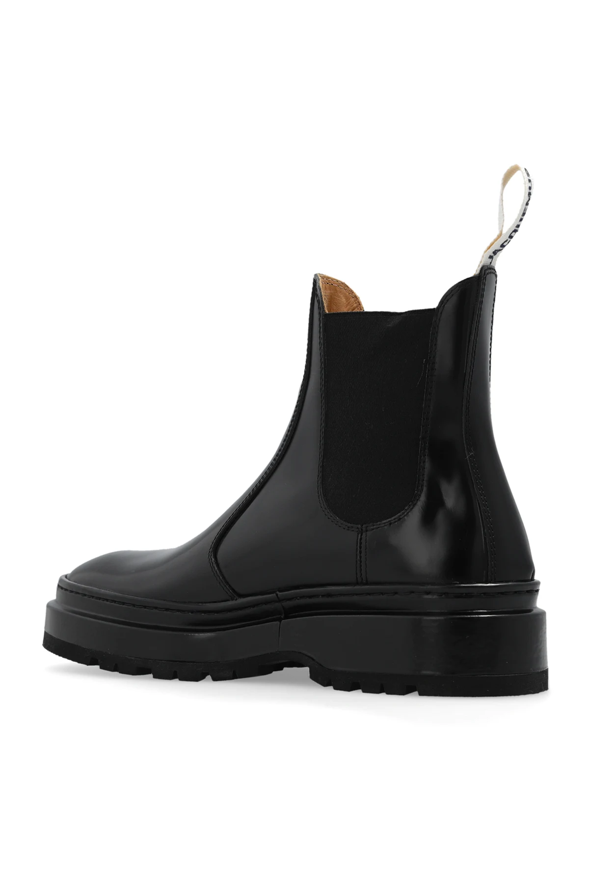Czarne sztyblety, model ‘Pavane’ Jacquemus. Wykonane ze skóry. Po bokach wszyta guma. Z tyłu kremowy uchwyt z logo. Czarna, gumowa podeszwa.