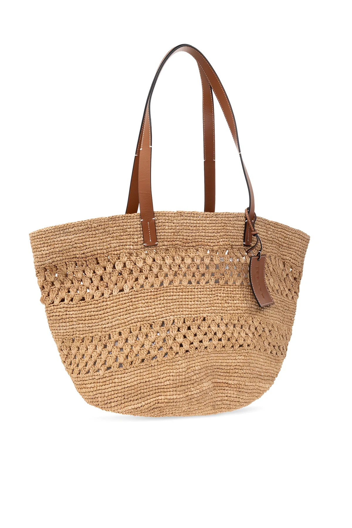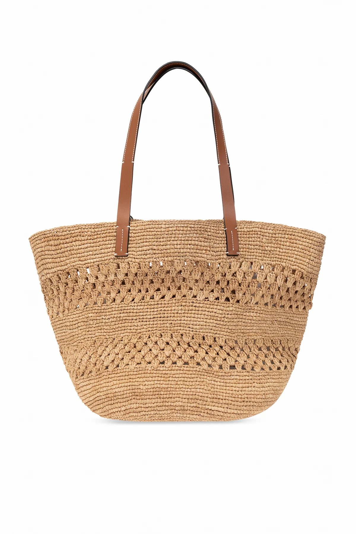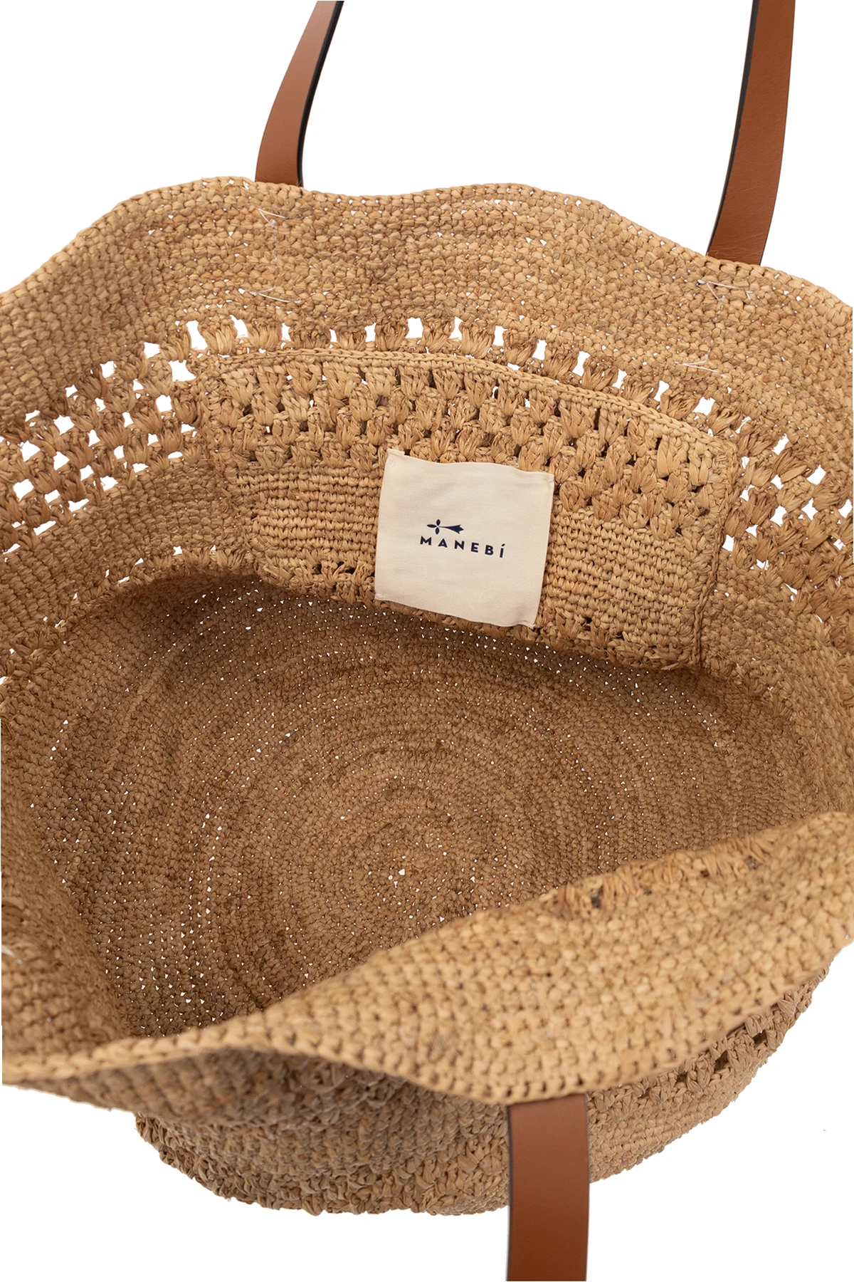 Beżowa, ażurowa torba typu ‘shopper’ Manebi. Wykonana z rafii. Dwie półokrągłe rączki wykonane ze skóry. Dołączona brązowa zawieszka z logo. Wewnątrz komora z wsuwana kieszenią.