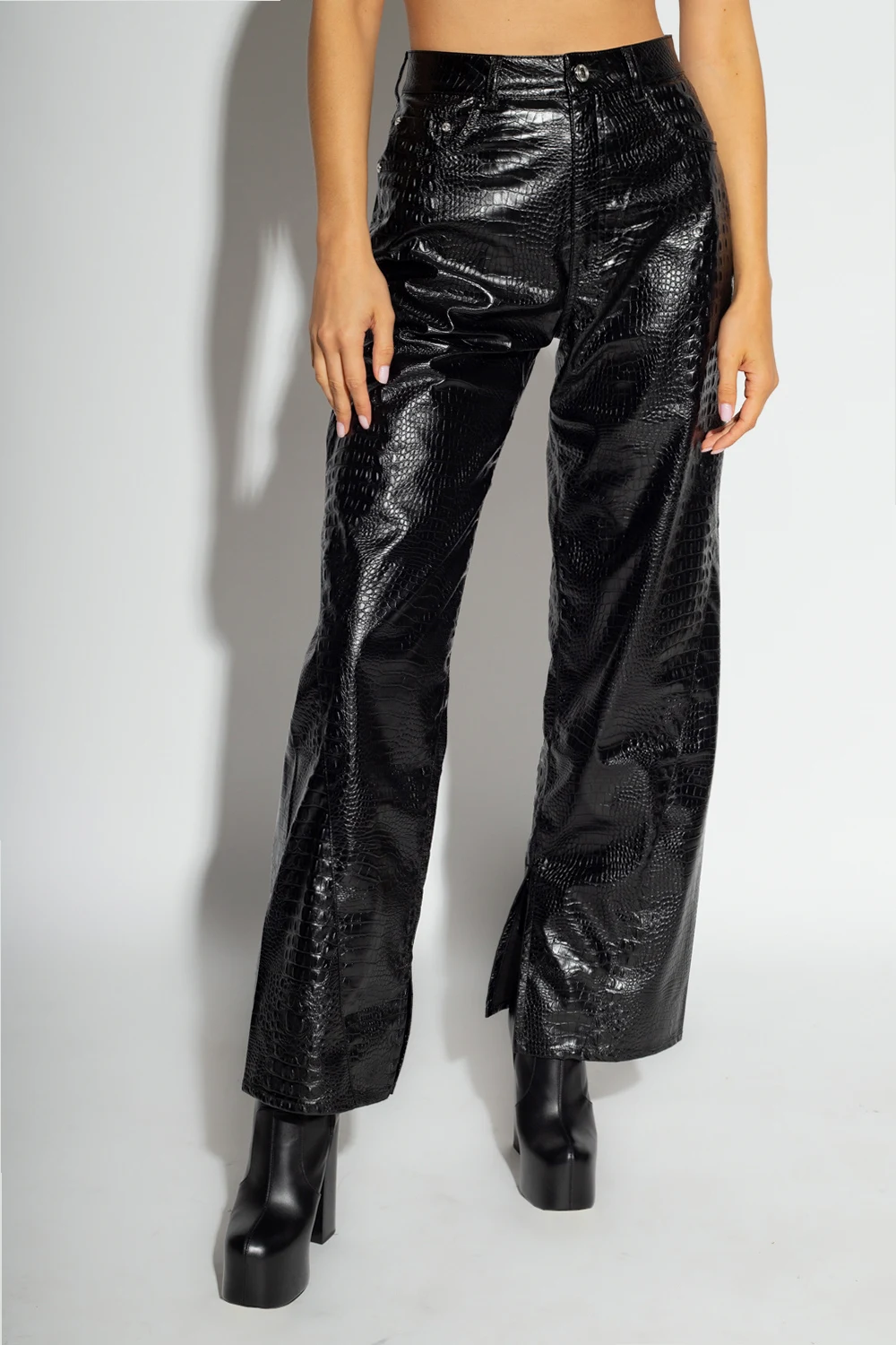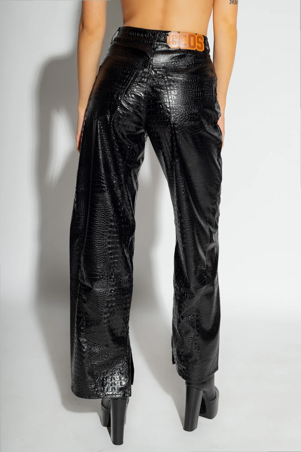 Czarne spodnie GCDS. Wykonane z materiału imitującego skórę. Zapinane na zamek oraz guzik. Pięć wsuwanych kieszeni. Z tyłu beżowo-brązowa naszywka z logo. Proste nogawki z rozcięciami.