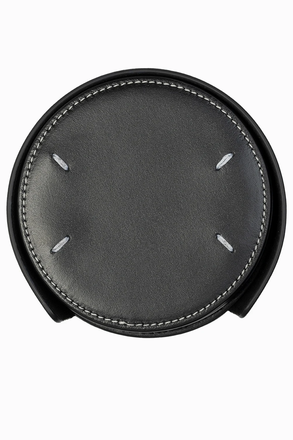 Zestaw sześciu, czarnych podstawek Maison Margiela. Wykonane ze skóry krowiej. Ozdobione białymi przeszyciami oraz wytłoczonym logo. Dołączone etui.
