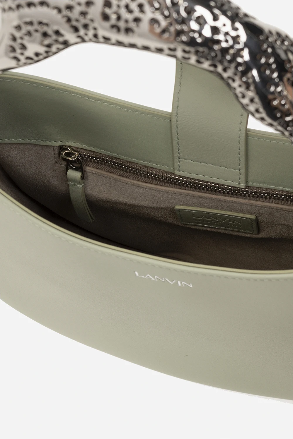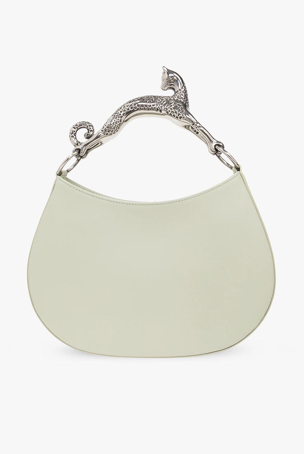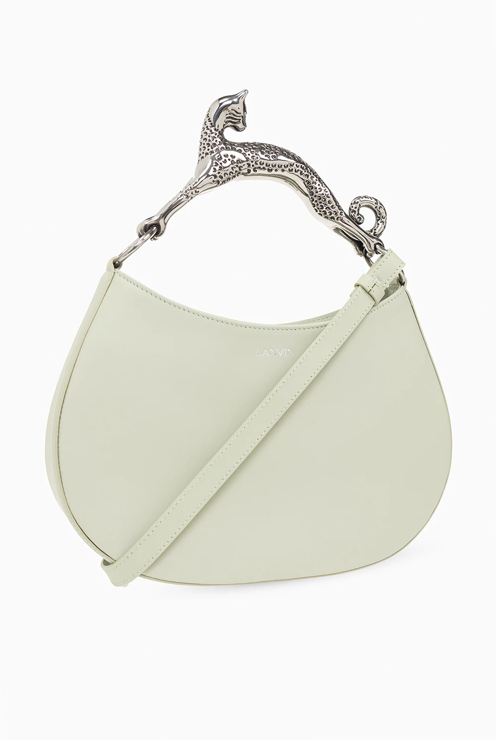 Zielona torba na ramię, model 'PM Hobo Cat' Lanvin. Wykonana ze skóry cielęcej. Magnetyczne zapięcie. Ozdobiona wytłoczonym logo. Dekoracyjna rączka w kształcie kota. Odpinany pas na ramię. Wewnątrz komora oraz kieszeń zamykana na zamek. Metalowe wykończenie w kolorze srebrnym.