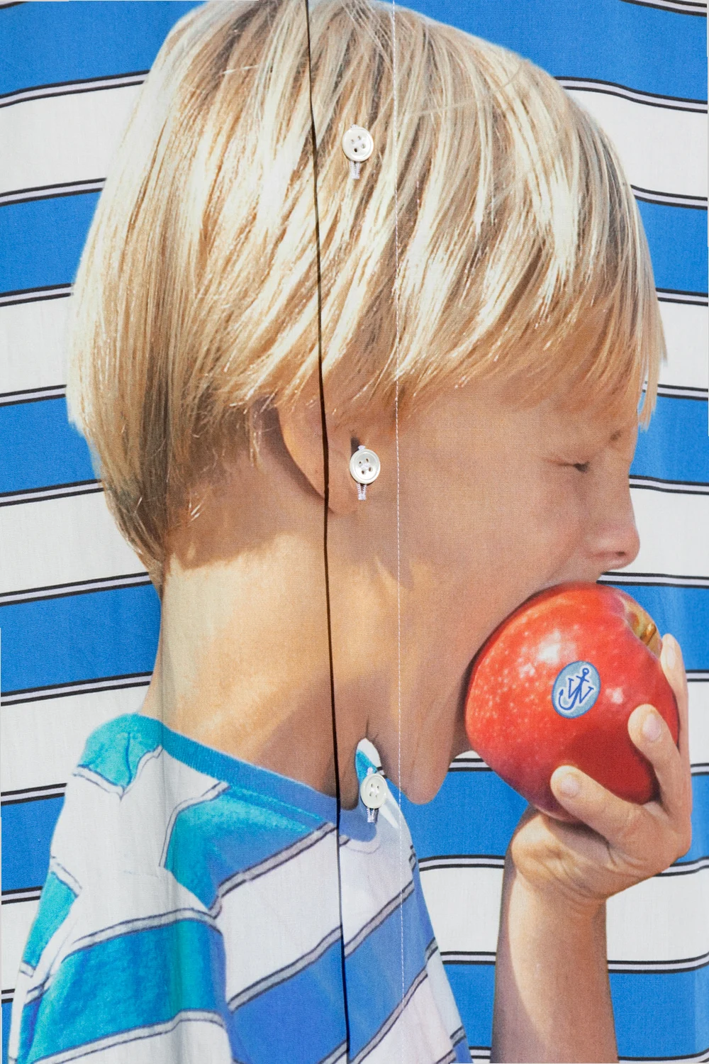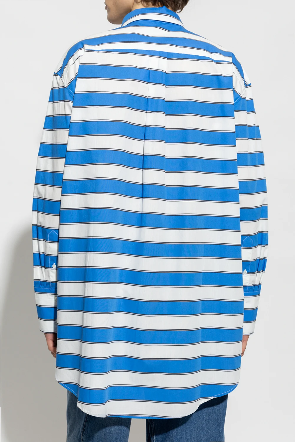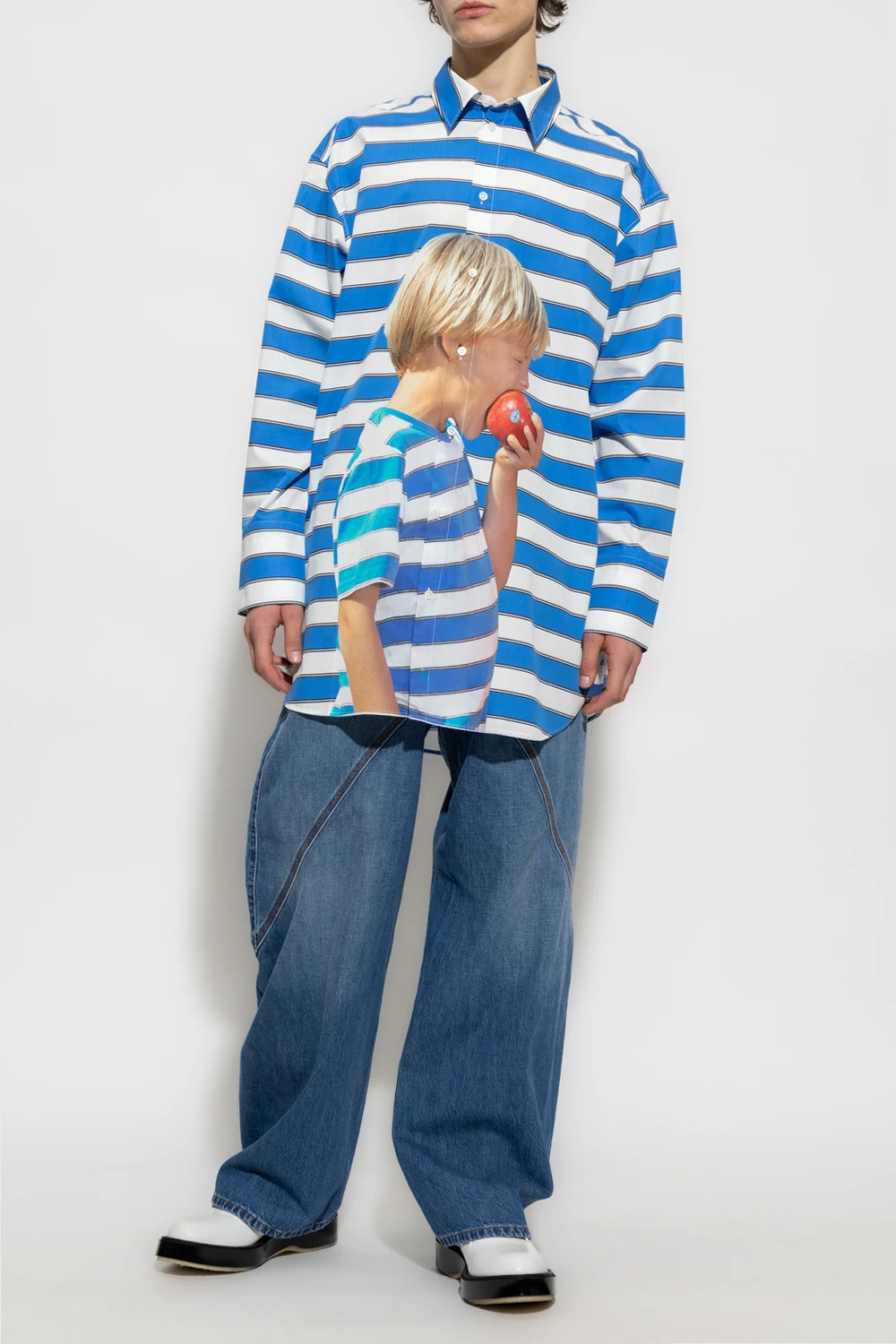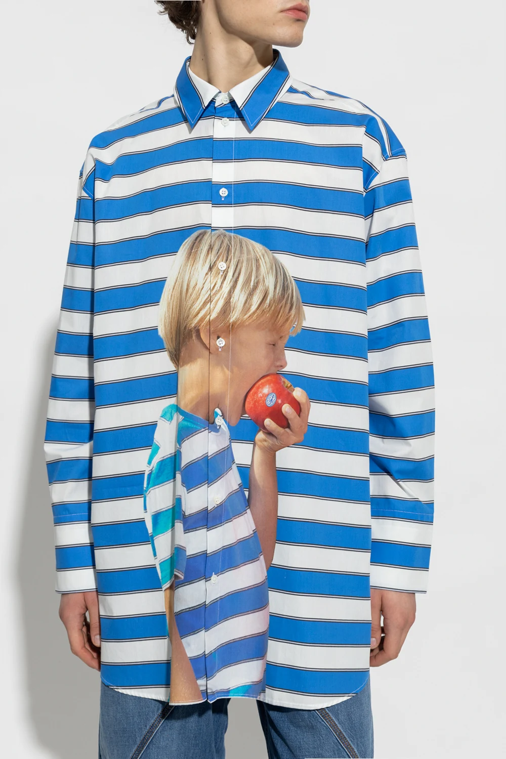Biało-niebieska koszula typu ‘oversize’ J.W. Anderson. Wykonana z bawełny. Zapinana z przodu na guziki. Ozdobiona wzorem w pasy oraz kolorowym nadrukiem. Długie rękawy zakończone mankietami zapinanymi na guziki.