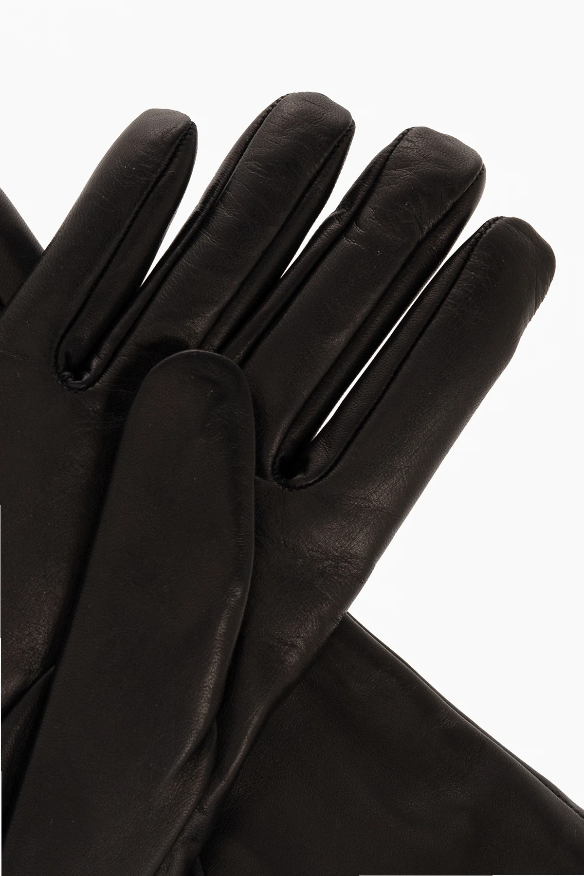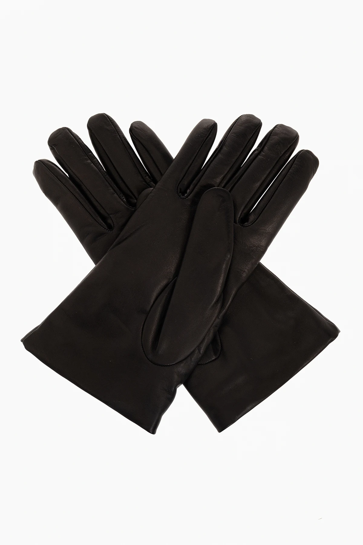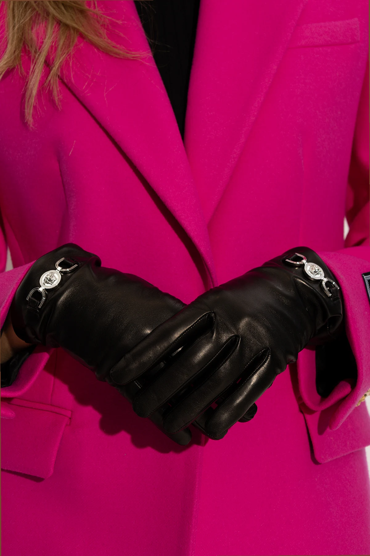 Czarne rękawiczki Versace. Wykonane ze skóry jagnięcej. Ozdobione metalową aplikacją z detalem w kształcie głowy Meduzy w kolorze srebrnym. Warstwa wewnętrzna wykończona kaszmirem.