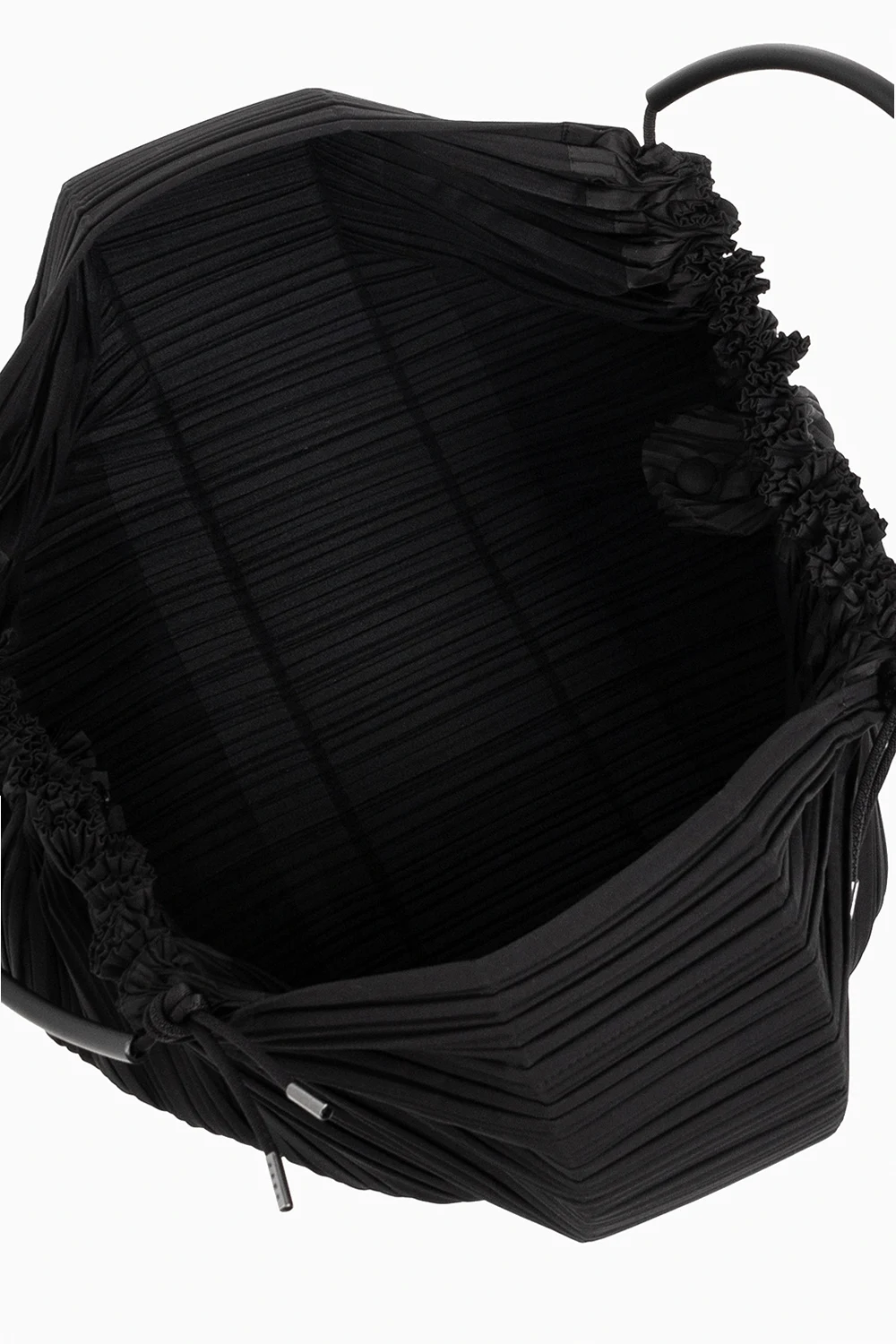 Czarna torba do ręki, model ‘Pleats Basket Bag’ Issey Miyake Pleats Please. Wykonana z prążkowanego materiału. Zapinana na zatrzask. U góry dwustronnie ściągana trokami. Dwie półokrągłe rączki. Wewnątrz jedna komora.