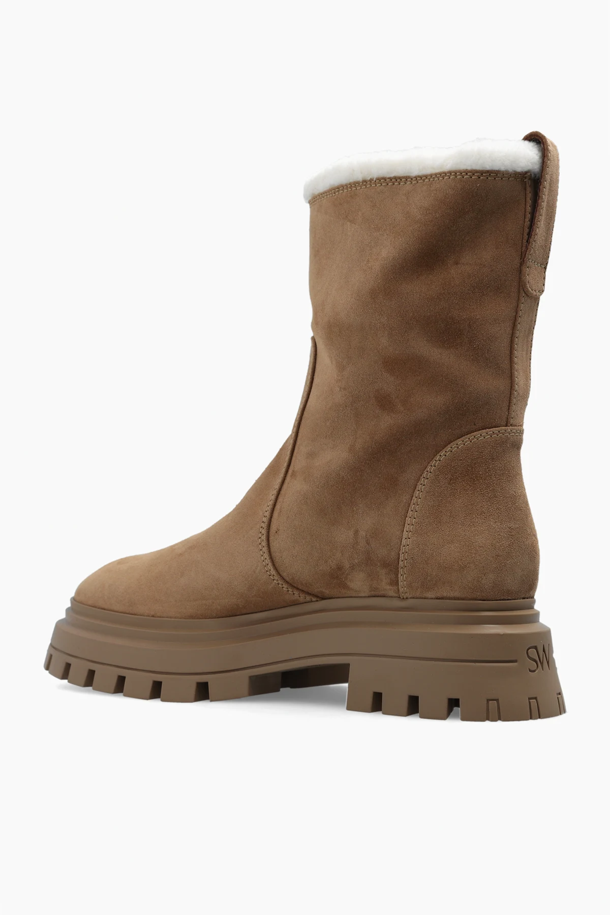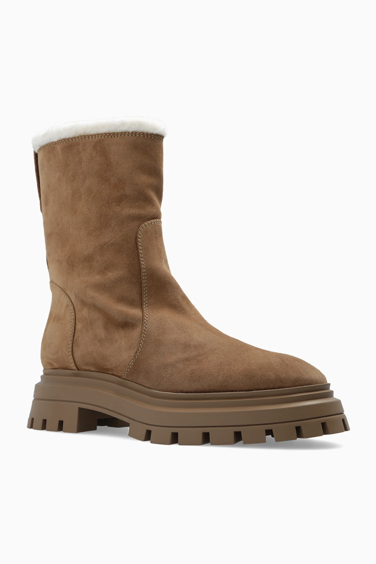 Beżowoszare, wsuwane botki, model ‘Bedford’ Stuart Weitzman. Wykonane z zamszu. Warstwa wewnętrzna ocieplona białym futrem. Zaokrąglony nosek. Beżowoszara, gumowa podeszwa.