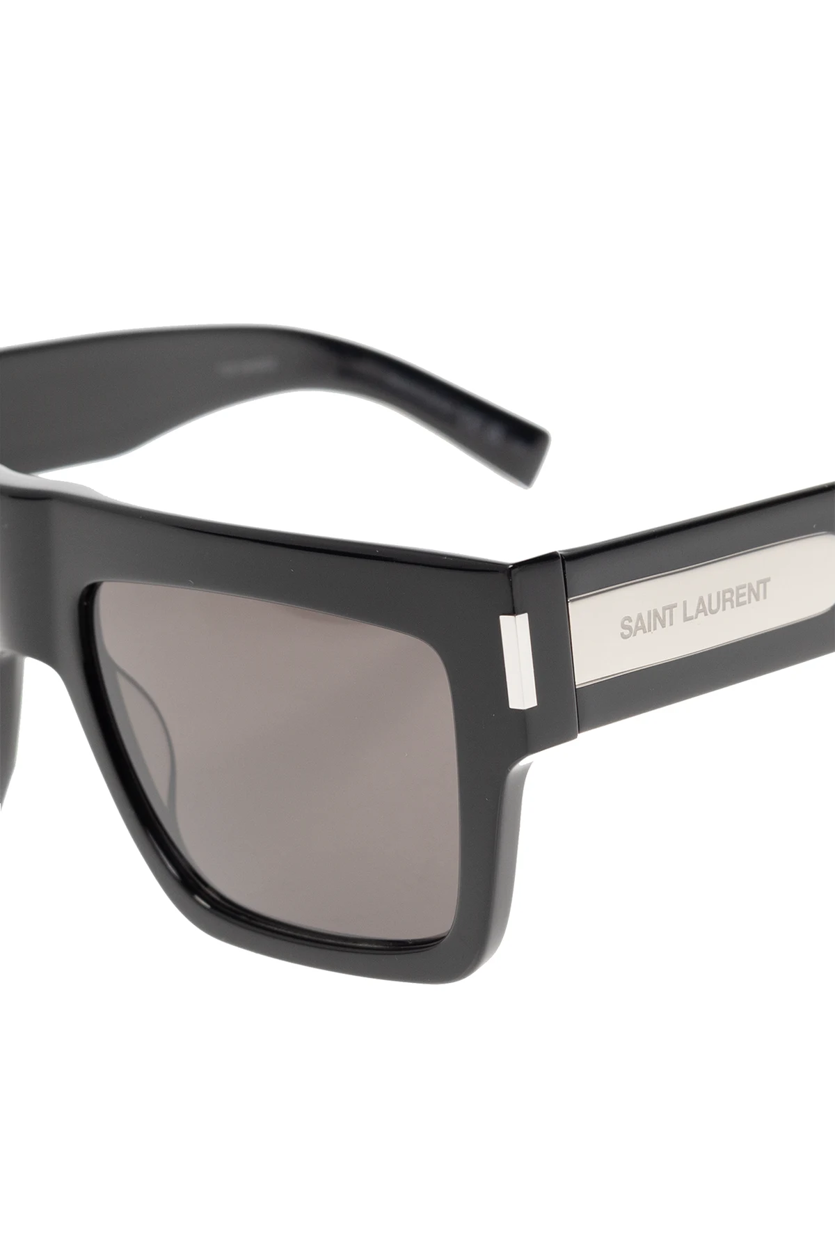 Czarne okulary przeciwsłoneczne ‘SL 628’ Saint Laurent. Kwadratowe oprawki wykonane z acetatu pochodzącego z recyklingu. Zauszniki ozdobione aplikacją w kolorze srebrnym z wygrawerowanym logo. Czarne szkła wykonane z bio nylonu ze 100% ochroną przed promieniowaniem UVA/UVB. Dołączone etui.