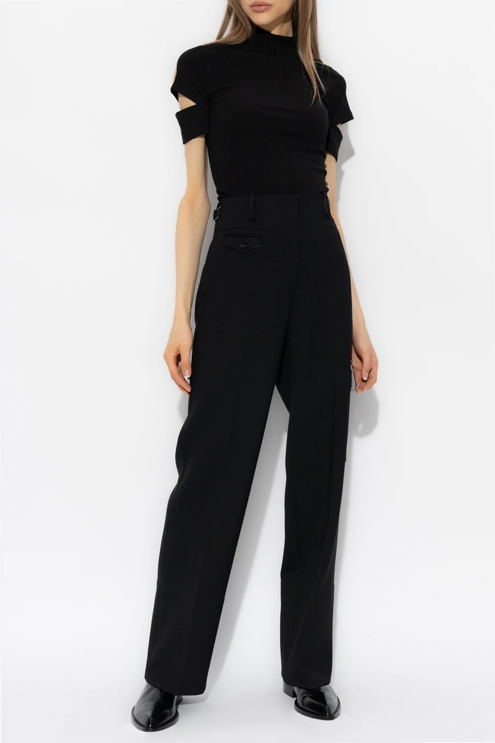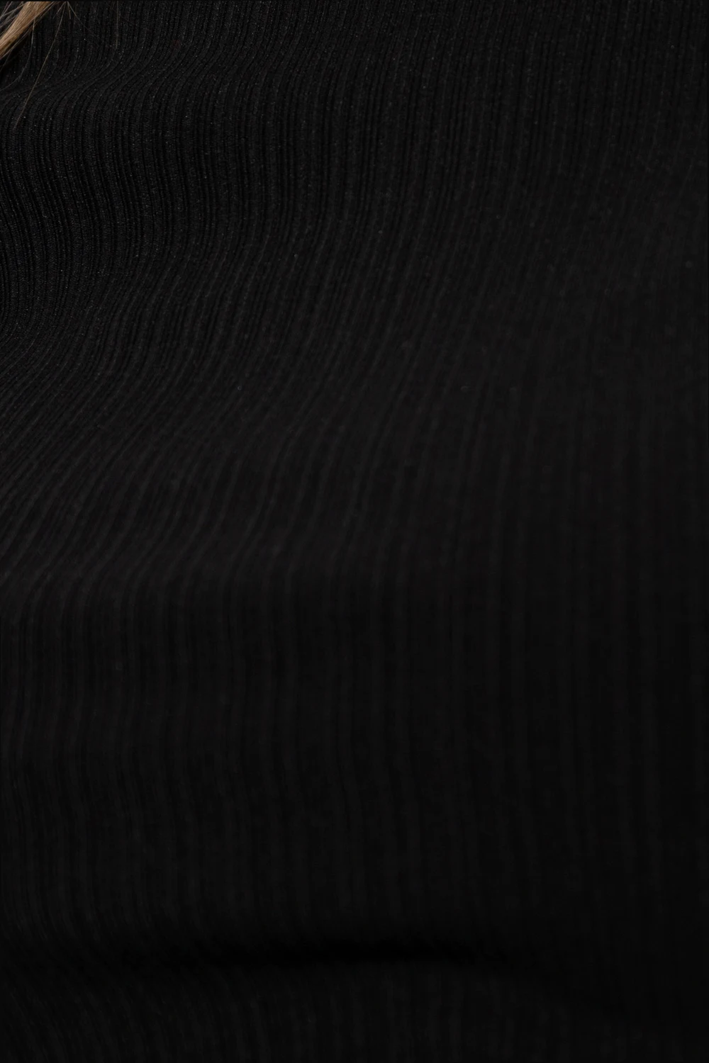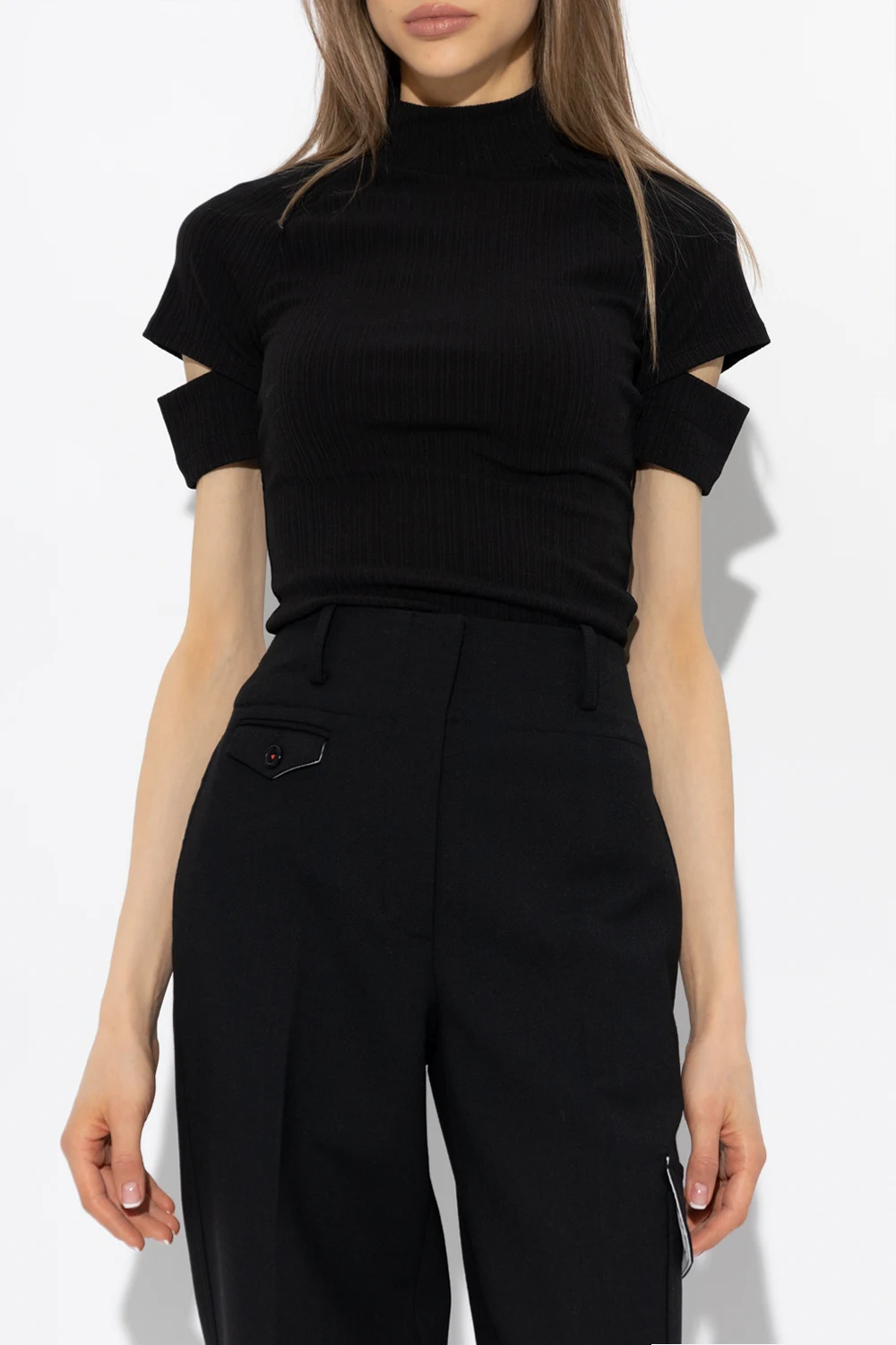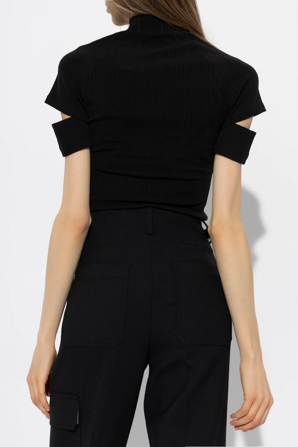 Czarny top ze stójką Helmut Lang. Wykonany z prążkowanego materiału. Krótkie rękaw z dekoracyjnymi wycięciami.
