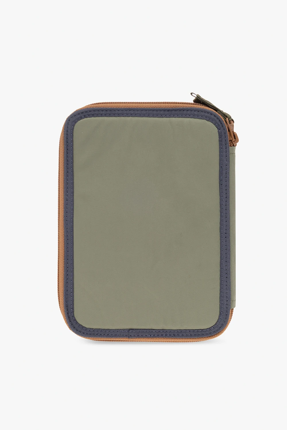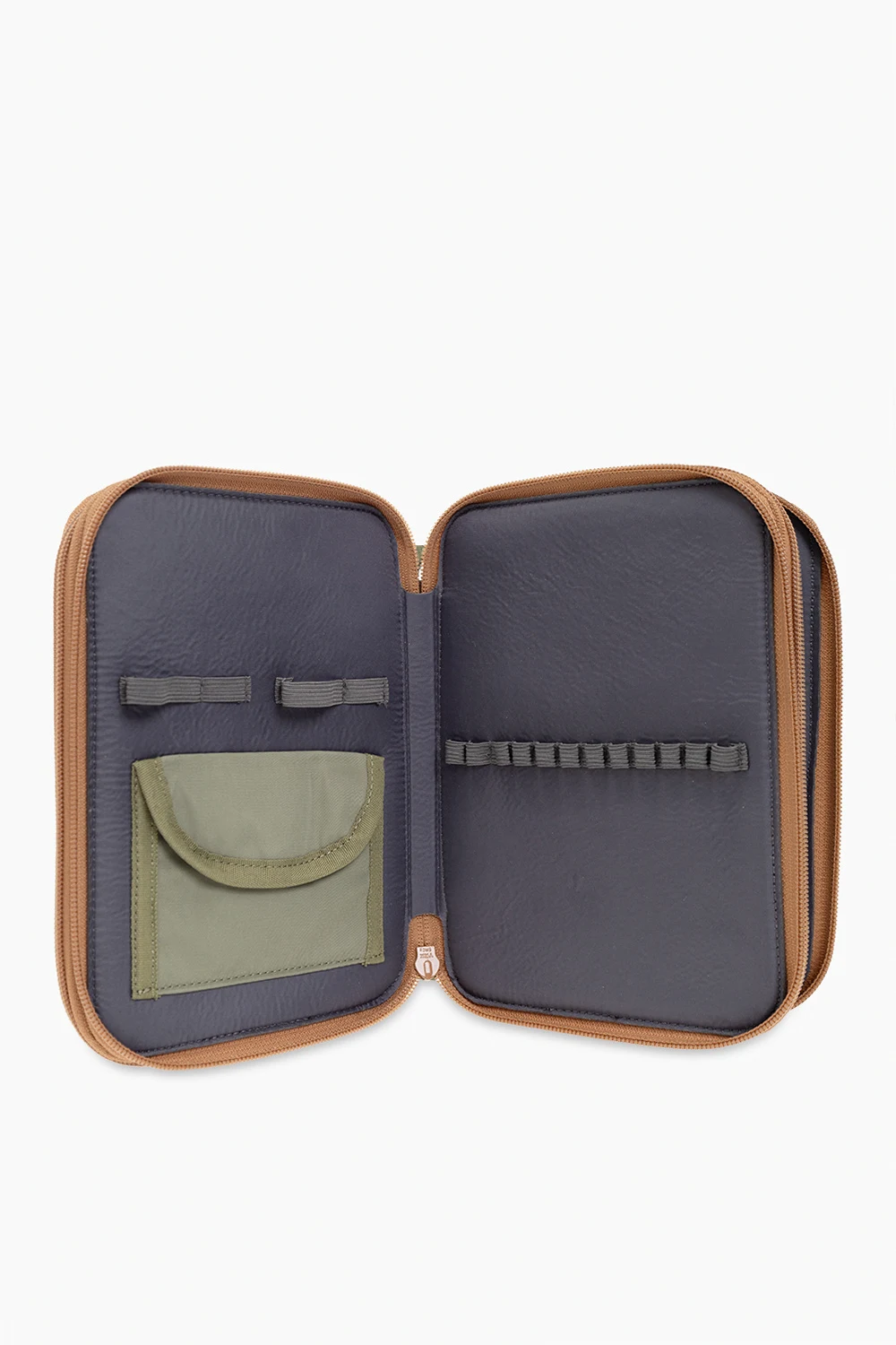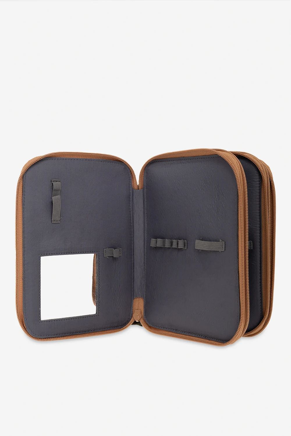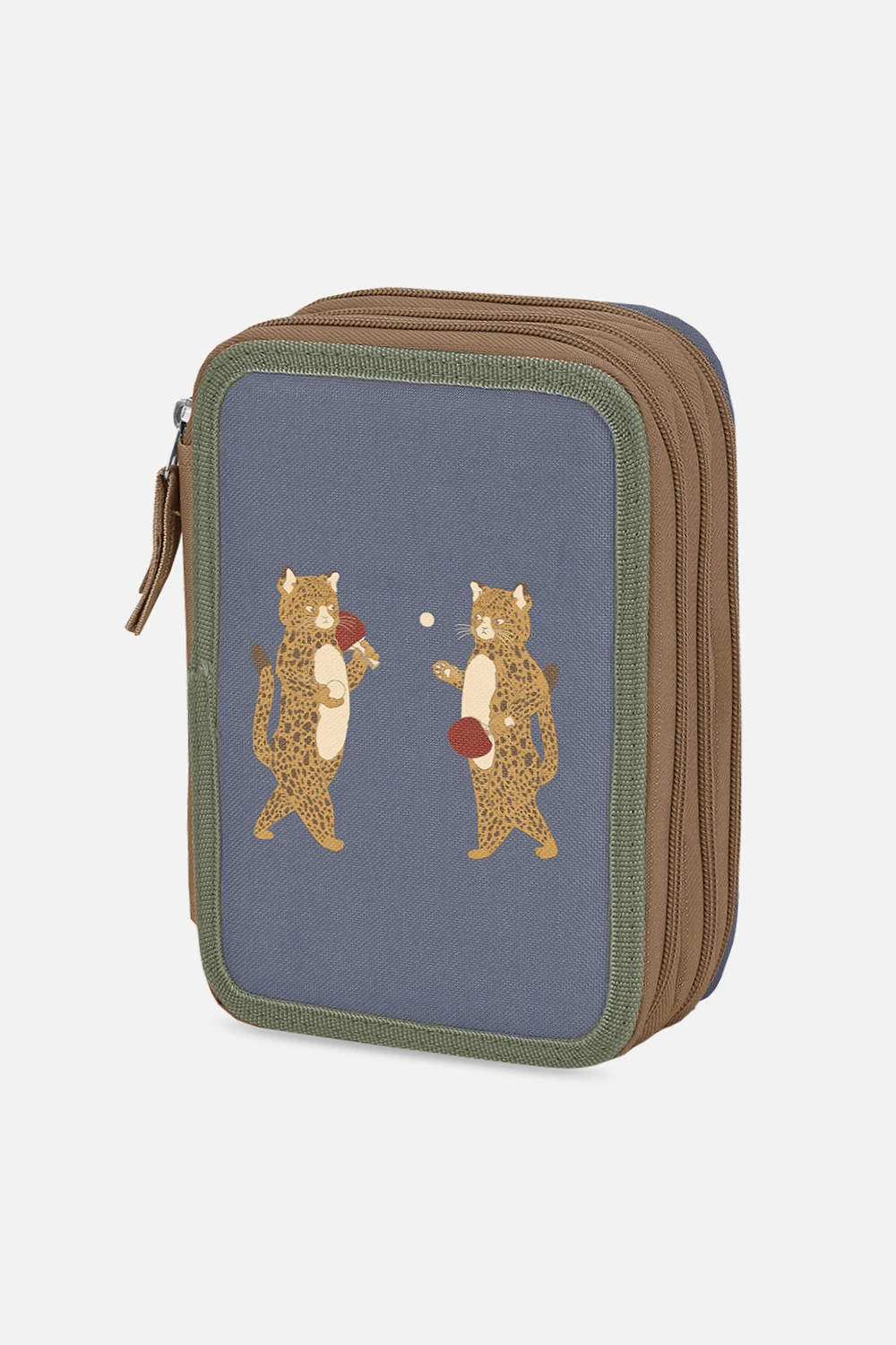 Niebiesko-zielono-brązowy piórnik Konges Slojd. Wykonany z materiału pochodzącego z recyklingu. Trzy oddzielne komory zamykane na zamek. Z przodu ozdobiony kolorowym nadrukiem z motywem zwierzęcym. Wewnątrz liczne uchwyty, lusterko i kieszeń z patką zapinaną na zatrzask.