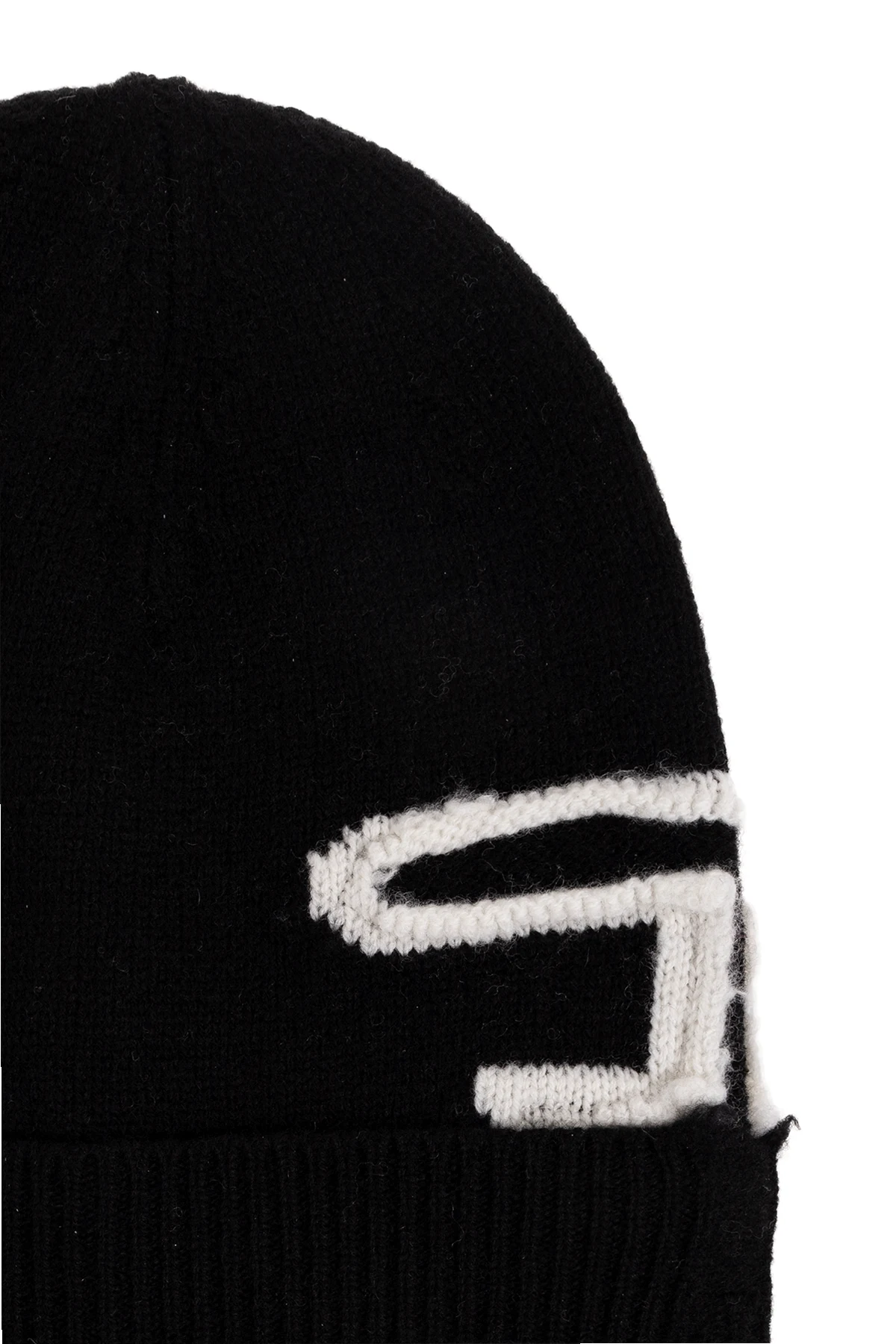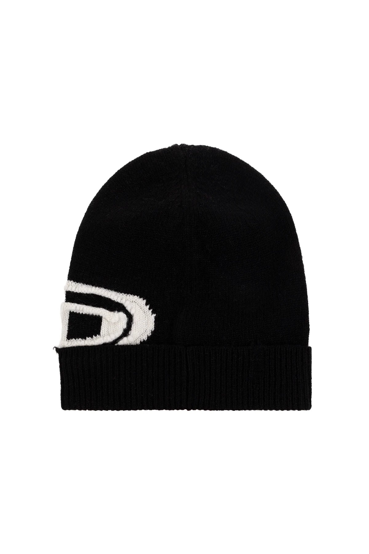 Czarna czapka, model ‘K-PEEL’ Diesel. Wykonana z wełny. Ozdobiona wzorem z logo w kolorze białym. Wykończona ściągaczem.
